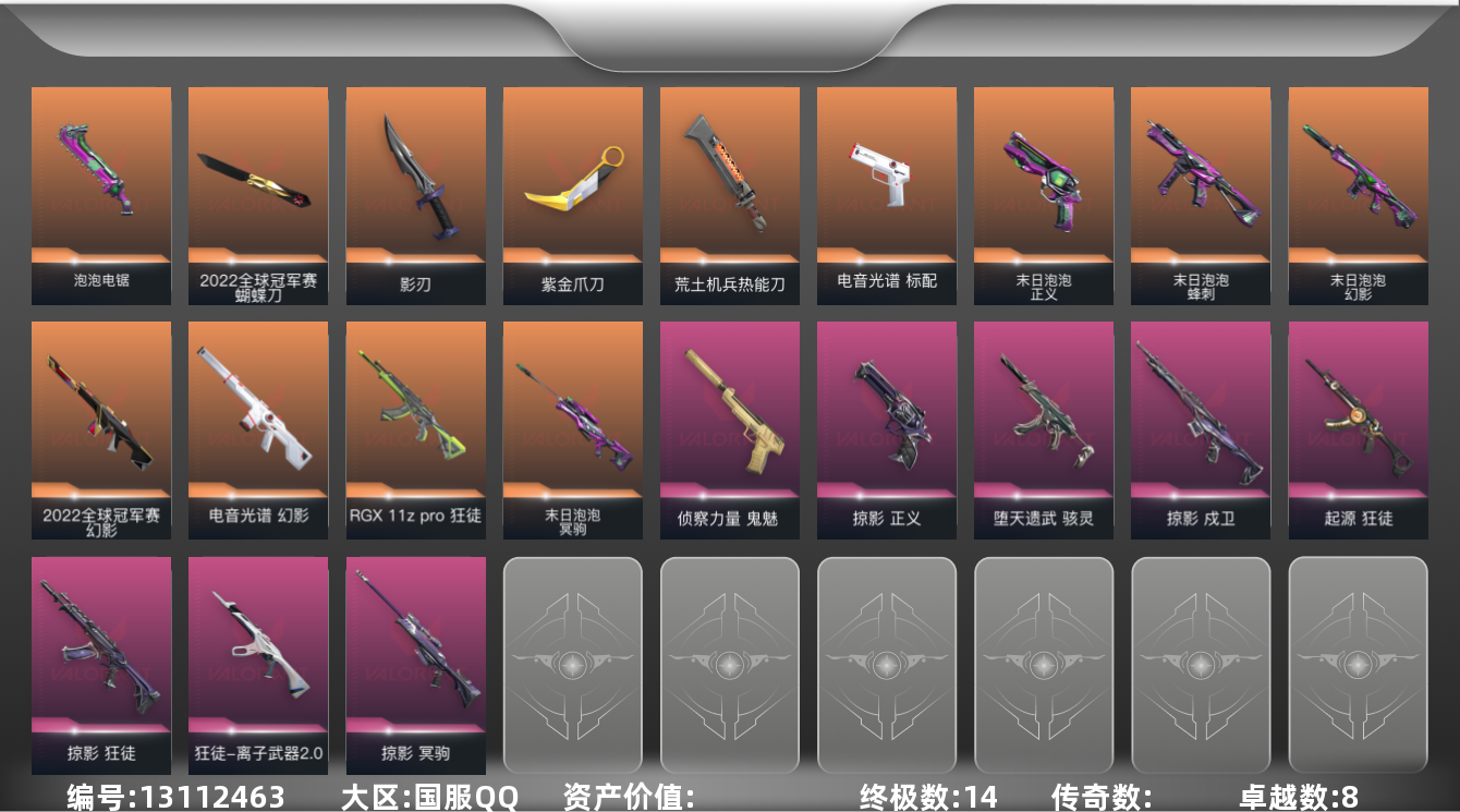 [13112463]【套装】:2022全球冠军赛套装,末日泡泡套装,掠影套装 【英雄】:幻棱,炼狱,维斯,暮蝶,壹决,铁臂,捷风,雷兹,幽影,不死鸟,贤者,猎枭,蝰蛇,零,芮娜,奇乐,尚勃勒,霓虹,夜露,K/O,盖可,黑梦,钢锁 【近战 武器】:近战武器-2022全球冠军赛 蝴蝶刀,近战武器-紫金爪刀,近战武器-泡泡电锯,近战武器-荒土机兵 热能刀,近战武器-影刃 【狂徒】:狂徒-RGX 11z Pro,狂徒-掠影,狂徒-起源,狂徒-离子武器//2.0,狂徒-荒土机兵 【幻影】:幻影-2022全球冠军赛,幻影-电音光谱,幻影-末日泡泡,幻影-纳米打击,幻影-电音光谱 【戍卫】:戍卫-掠影,戍卫-逆冲蛮牛 【獠犬】:獠犬-逆冲蛮牛 【冥驹】:冥驹-末日泡泡,冥驹-掠影,冥驹-荒土机兵 【奥丁】:奥丁-纳米打击 【判官】:判官-纳米打击x 【雄鹿】:雄鹿-逆冲蛮牛 【骇灵】:骇灵-堕天遗武,骇灵-荒土机兵 【蜂刺】:蜂刺-末日泡泡 【标配】:标配-电音光谱,标配-荒土机兵,标配-电音光谱 【正义】:正义-末日泡泡,正义-掠影,正义-超限闪存,正义-纳米打击 【鬼魅】:鬼魅-侦察力量,鬼魅-诡秘蛇影,鬼魅-扑棱扑棱,鬼魅-星云暗涌 【狂怒】:狂怒-逆冲蛮牛 【短炮】:短炮-弧光异彩 【卡面】:终章:激斗汉堡 卡面,进入射程 卡面,分崩离析 卡面,纳米打击 卡面,抑制技术 卡面,激斗汉堡 卡面,瓦娃脸雪糕 P2 卡面,从黄昏到黎明 卡面,荒土机兵 卡面,银弹猎手 卡面,逆冲蛮牛 卡面,《双城之战》拥抱 卡面,精灵大战 卡面,欢迎来到底城 卡面,南瓜盛典 卡面,无畏契约:暮蝶 卡面,修车达人 卡面,正义的化身 卡面,零点嗅探设计图 卡面,瓦娃脸雪糕 卡面 ,无畏契约GO!第一卷:芮娜 卡面,清除名单 卡面,无畏契约GO!第一卷:零 卡面,《双城之战》金克丝 卡面,夯实根基 卡面,"Luie" 卡面,热烈欢迎 卡面,铁臂设计图 卡面,代号红色 卡面,冰淇淋店 卡面,新兵报到 卡面,友军火力 卡面,V契约 卡面,无畏契约 卡面 【喷漆】:小小心意 喷漆,战“素”兔 喷漆,宇宙的指引 喷漆,请求重启 喷漆,逆冲蛮牛 喷漆,纳米打击 喷漆,鼻尖上的蝴蝶 喷漆,简笔画黯兽 喷漆,独守蝰腹 喷漆,他们将落荒而逃 喷漆,通缉:战术企鹅 喷漆,荒土机兵 喷漆,别挡我吃球! 喷漆,嗨宝南瓜灯 喷漆,嘭! 喷漆,