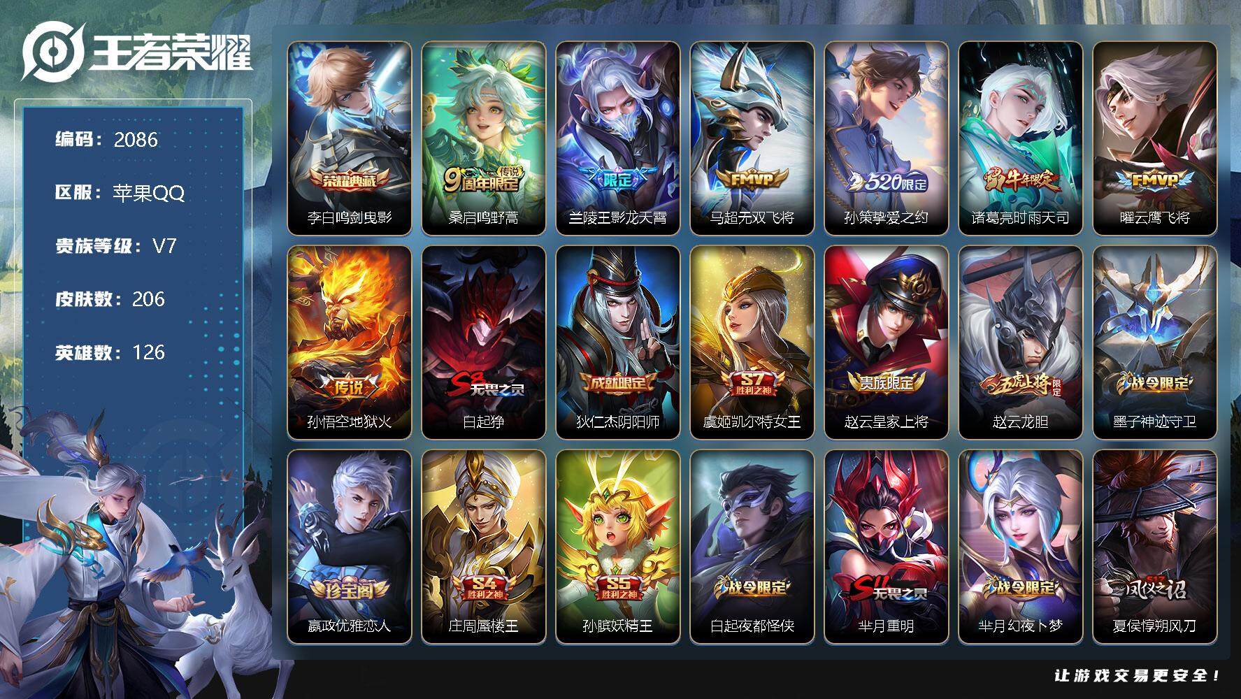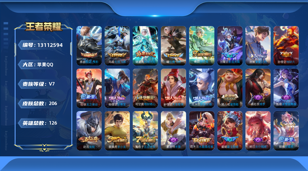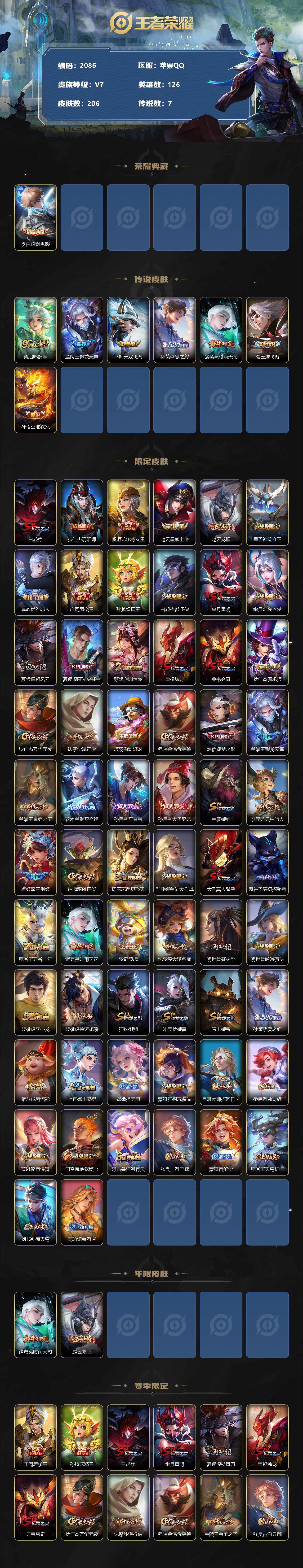 [13112594]苹果Q-V2-永恒钻石IV段位-126英雄-206皮肤-1典藏-0珍品无双-0无双-0珍品传说-7传说-59史诗
