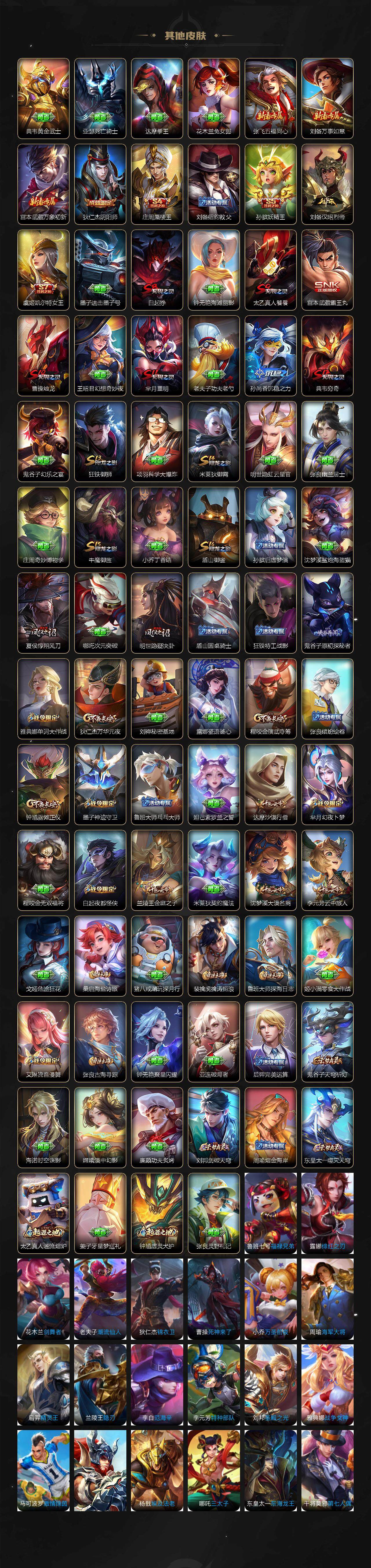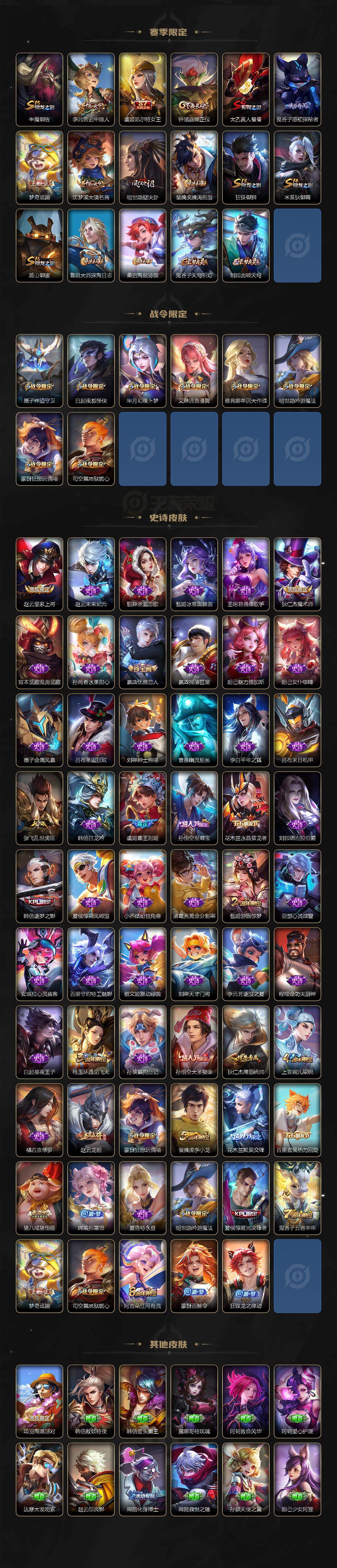 【赛季限定】:庄周蜃楼王,孙膑妖精王,白起狰,芈月重明,夏侯惇朔风刀,曹操烛龙,典韦穷奇,狄仁杰万华元夜,达摩沙漠行僧,程咬金演武夺筹,兰陵王金庭之子,张良古海寻踪,牛魔御旌,李元芳云中旅人,虞姬凯尔特女王,钟馗驱傩正仪,太乙真人饕餮,鬼谷子原初探秘者,梦奇顽趣,沈梦溪大漠名商,明世隐疑决卦,裴擒虎擒涛扼浪,狂铁御狮,米莱狄御霄,盾山御銮,鲁班大师探海日志,桑启海盐诗旅,鬼谷子天穹祈灯,刘邦剑破天穹