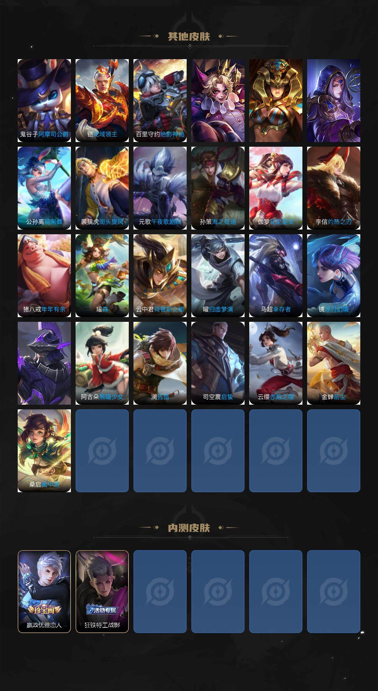 【限定皮肤】:白起狰,狄仁杰阴阳师,虞姬凯尔特女王,赵云皇家上将,赵云龙胆,墨子神迹守卫,嬴政优雅恋人,庄周蜃楼王,孙膑妖精王,白起夜都怪侠,芈月重明,芈月幻夜卜梦,夏侯惇朔风刀,夏侯惇匿光决锋者,甄姬游园惊梦,曹操烛龙,典韦穷奇,狄仁杰魔术师,狄仁杰万华元夜,达摩沙漠行僧,项羽海滩派对,程咬金演武夺筹,韩信逐梦之影,兰陵王影龙天霄,兰陵王金庭之子,花木兰默契交锋,孙悟空至尊宝,孙悟空大圣娶亲,牛魔御旌,李元芳云中旅人,虞姬霸王别姬,钟馗驱傩正仪,杨玉环遇见飞天,雅典娜单词大作战,太乙真人饕餮,鬼谷子原初探秘者,鬼谷子五谷丰年,诸葛亮时雨天司,梦奇顽趣,沈梦溪大漠名商,明世隐疑决卦,明世隐吟游魔法,裴擒虎李小龙,裴擒虎擒涛扼浪,狂铁御狮,米莱狄御霄,盾山御銮,孙策挚爱之约,猪八戒猪悟能,上官婉儿梁祝,嫦娥拒霜思,蒙犽狂想玩偶喵,鲁班大师探海日志,桑启海盐诗旅,艾琳流音漫舞,司空震地狱燃心,阿古朵江河有灵,张良古海寻踪,蒙犽百解令,鬼谷子天穹祈灯,刘邦剑破天穹,周瑜熔金海岸