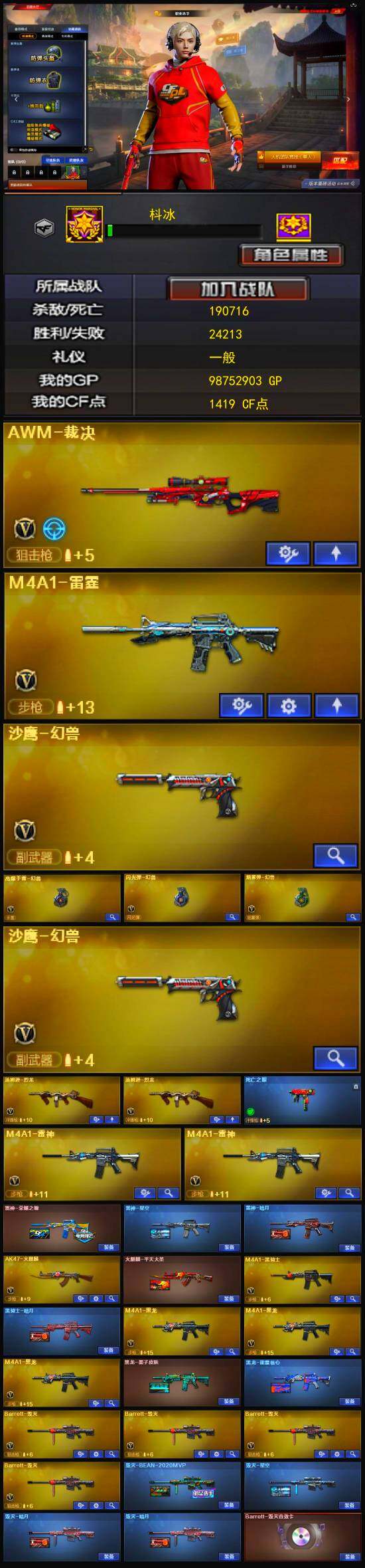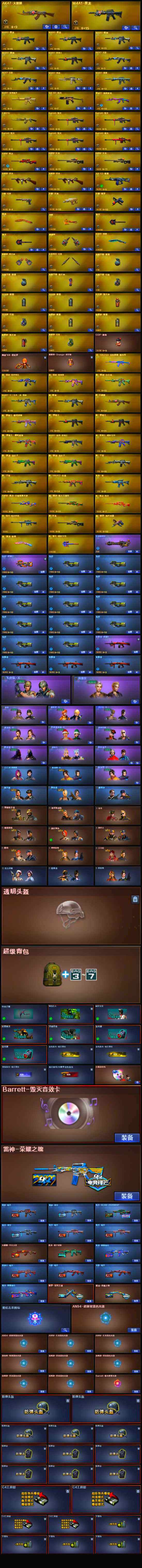 【英雄级武器】:AK47-火麒麟,M4A1-黑龙*3,M4A1-雷神*2,M4A1-黑骑士,AK47-无影*2,M4A1-死神,M4A1-雷霆,黑武士-锦绣游龙,M4A1-玫瑰精灵,王者之心-觉醒版,AWM-天龙*2,Barrett-毁灭*4,Barrett-极光,AWM-裁决,汤姆逊-烈龙*2,AA-12-雷霆,沙鹰-修罗,沙鹰-天神,沙鹰-幻兽,屠龙,龙啸,麒麟刺-堕天神,擎天*2,麒麟刺,女皇利刃-幻兽,高爆手雷-雷霆*2,高爆手雷-幻兽,高爆手雷-堕天神,闪光弹-雷霆*2,闪光弹-堕天神,烟雾弹-雷霆*2,烟雾弹-堕天神,M4A1-赤狱骑士