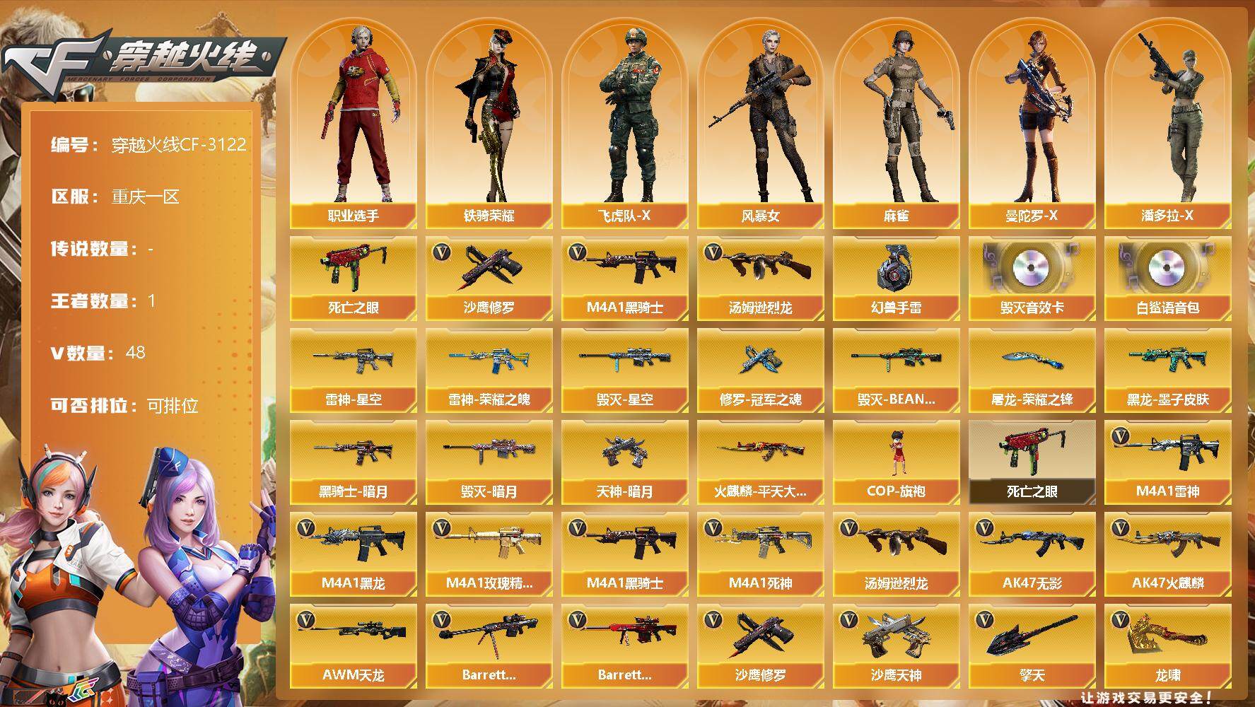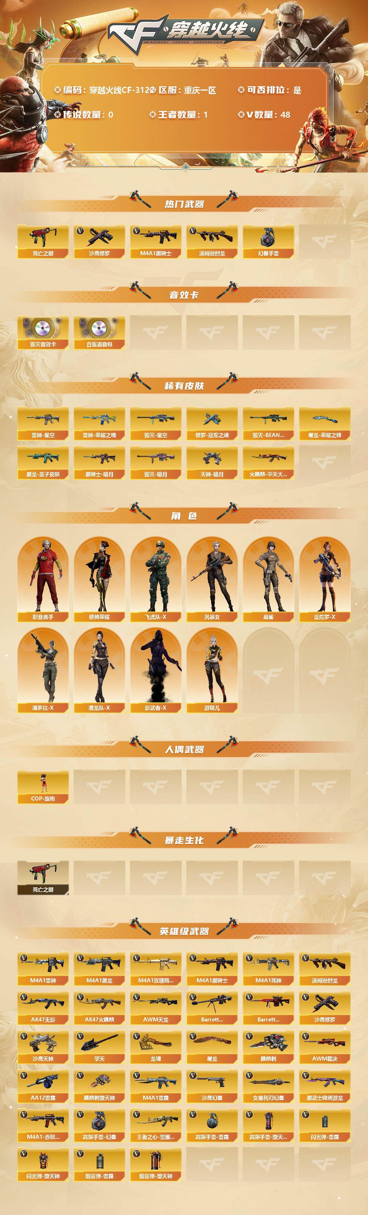 [13113256]重庆一区-48V-1王者-0炫金 【热门武器】:死亡之眼,M4A1-黑骑士,汤姆逊-烈龙*2,沙鹰-修罗,高爆手雷-幻兽 【音效卡】:Barrett-毁灭音效卡,白鲨语音包 【皮肤】:雷神-暗月,雷神-荣耀之魄,雷神-星空,火麒麟-平天大圣,毁灭-暗月*2,毁灭-星空,毁灭-BEAN-2020MVP,M4A1-千变-孔明皮肤,黑龙-能量核心,黑龙-墨子皮肤,黑骑士-暗月,无影-暗月*2,天启-暗月,极光-能量核心,修罗-冠军之魂,天神-暗月*4,屠龙-荣耀之锋 【角色】:飞虎队-X,风暴女,麻雀,曼陀罗-X,潘多拉-X,潜龙队-X,铁骑荣耀,影武者-X,游珑儿,职业选手 【人偶武器】:COP-旗袍 【暴走生化】:死亡之眼 【英雄级武器】:AK47-火麒麟,M4A1-黑龙*3,M4A1-雷神*2,M4A1-黑骑士,AK47-无影*2,M4A1-死神,M4A1-雷霆,黑武士-锦绣游龙,M4A1-玫瑰精灵,王者之心-觉醒版,AWM-天龙*2,Barrett-毁灭*4,Barrett-极光,AWM-裁决,汤姆逊-烈龙*2,AA-12-雷霆,沙鹰-修罗,沙鹰-天神,沙鹰-幻兽,屠龙,龙啸,麒麟刺-堕天神,擎天*2,麒麟刺,女皇利刃-幻兽,高爆手雷-雷霆*2,高爆手雷-幻兽,高爆手雷-堕天神,闪光弹-雷霆*2,闪光弹-堕天神,烟雾弹-雷霆*2,烟雾弹-堕天神,M4A1-赤狱骑士 【特殊枪械】:1黑骑士,2烈龙