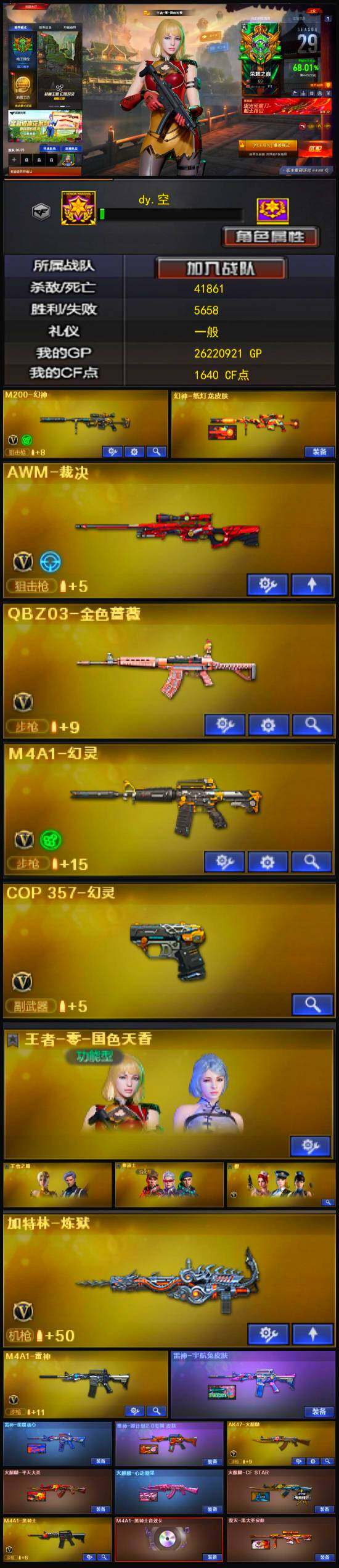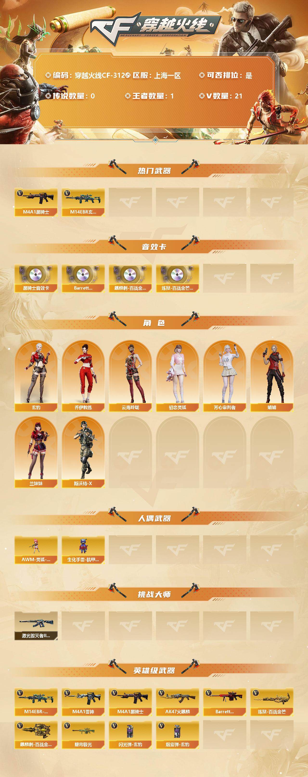 [13113090]上海一区-21V-1王者-0炫金 【热门武器】:M14EBR-玄武,M4A1-黑骑士 【音效卡】:M4A1-黑骑士音效卡,Barrett-碧霄极光音效卡,麒麟刺-百战金芒-盛典舞曲音效卡,炼狱-百战金芒-庆典舞曲音效卡 【皮肤】:M4A1-再燃火线,火麒麟-玉面羞花 皮肤,轻型军用手斧-再燃火线 【角色】:玄豹,乔伊教练,云海玲珑,初恋灵狐,芳心审判者,娟娟,兰妹妹,斯沃特-X 【人偶武器】:AWM-灵狐-15周年嘉年华,生化手雷-机甲核心 【挑战大师】:激光毁灭者III-白马银枪 【英雄级武器】:AK47-火麒麟,M4A1-雷神,M4A1-黑骑士,M14EBR-玄武,QBZ03-独角-III,Barrett-极光,炼狱-百战金芒,麒麟刺-百战金芒,高爆手雷-玄豹*2,闪光弹-玄豹*2,烟雾弹-玄豹*2,Barrett-碧霄极光 【特殊枪械】:1黑骑士