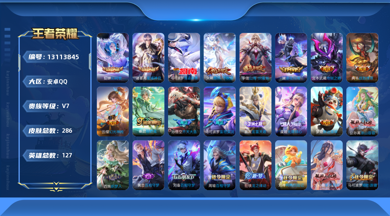 [13113845]安卓Q-V7-最强王者段位-127英雄-286皮肤-2典藏-0珍品无双-0无双-1珍品传说-12传说-85史诗