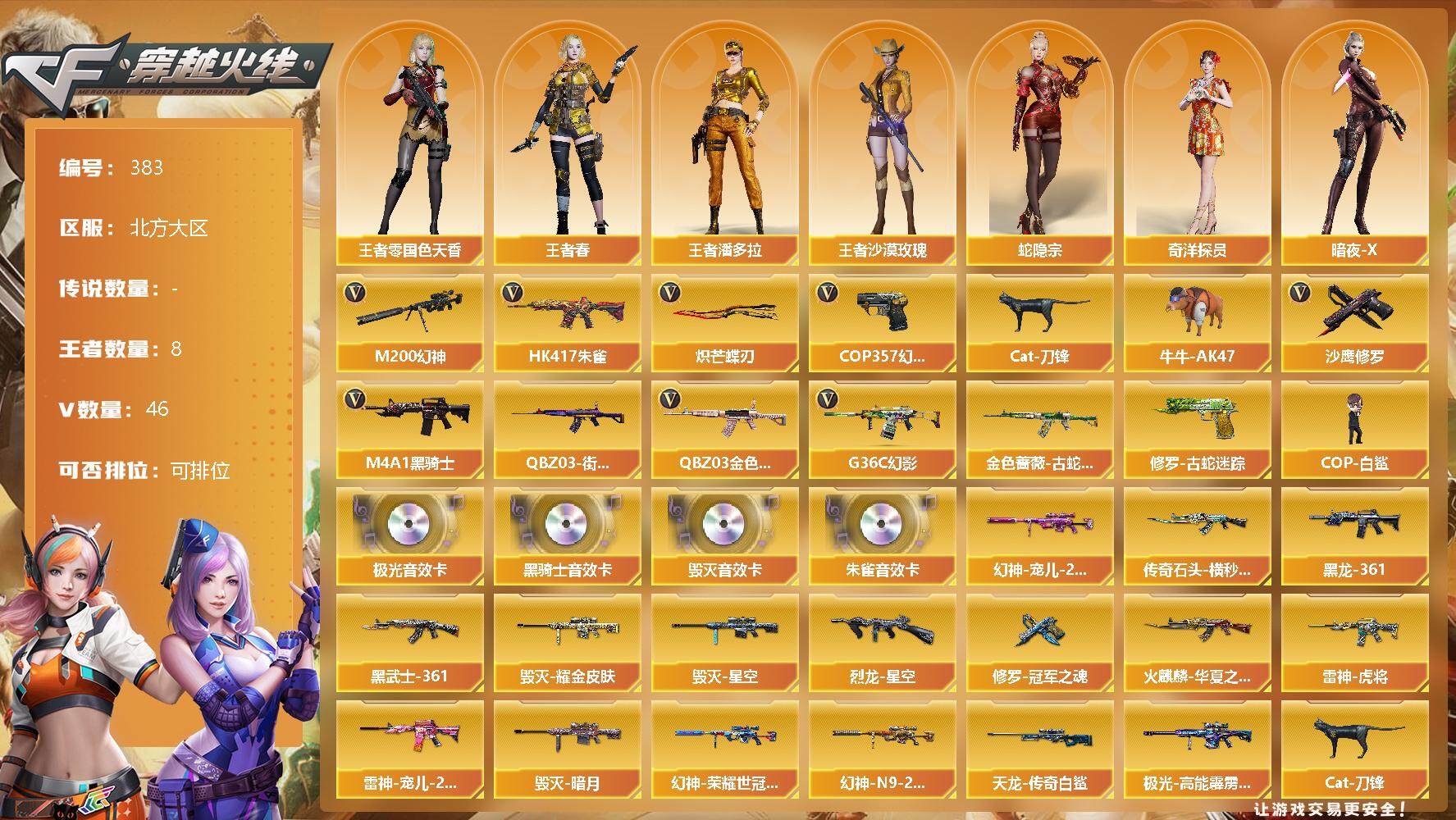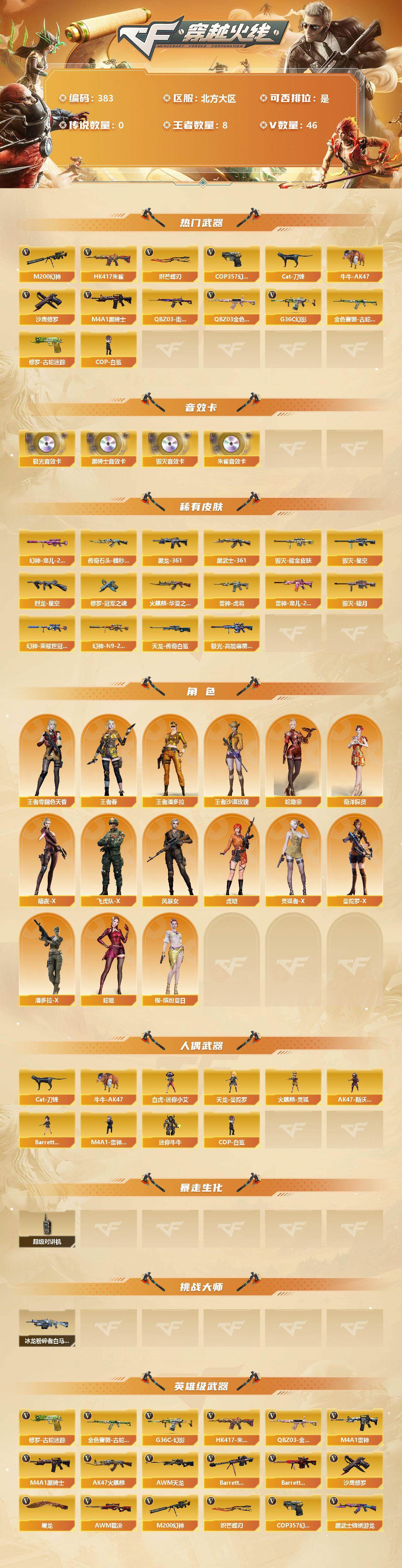 [13113353]北方大区-46V-8王者-0炫金 【热门武器】:G36C-幻影,QBZ03-金色蔷薇,HK417-朱雀,M200-幻神,金色蔷薇-古蛇迷踪,修罗-古蛇迷踪,QBZ03-街机,Cat-刀锋,牛牛-AK47,M4A1-黑骑士,COP-白鲨,COP 357-幻灵*2,沙鹰-修罗,炽芒蝶刃 【音效卡】:M4A1-黑骑士音效卡,Barrett-毁灭音效卡,Barrett-极光音效卡,HK417-朱雀音效卡 【皮肤】:幻神-宠儿-2021MVP,M200-幻神-荣耀世冠白鲨,M200-幻神-N9-2022MVP,裁决-流光秘银,烈龙-星空,雷神-暗月,雷神-虎将,雷神-宠儿-2019MVP,火麒麟-华夏之心,传奇石头-横秒之巅,毁灭-暗月,毁灭耀金皮肤,毁灭-星空,M4A1-黑龙-361,AK47-黑武士-361,AWM-天龙-传奇白鲨,极光-高能霹雳 皮肤,修罗-冠军之魂 【角色】:王者-零-国色天香,王者春,王者潘多拉,王者沙漠玫瑰,蛇隐宗,奇洋探员,暗夜-X,飞虎队-X,风暴女,虎妞,灵狐者-X,曼陀罗-X,潘多拉-X,蛇姬,樱-缤纷夏日 【人偶武器】:COP-白鲨,白虎-迷你小艾,天龙-曼陀罗,火麒麟-灵狐,M4A1-雷神-精英刀锋,AK47-斯沃特,Barrett-夜玫瑰,Cat-刀锋,牛牛-AK47,迷你牛牛 【暴走生化】:超级对讲机 【挑战大师】:冰龙粉碎者-白马银枪 【英雄级武器】:AK47-火麒麟,M4A1-雷神,M4A1-黑骑士,HK417-朱雀,G36C-幻影,黑武士-锦绣游龙,金色蔷薇-古蛇迷踪,QBZ03-金色蔷薇,QBZ-03-王者蔷薇-觉醒版,AWM-天龙,Barrett-毁灭,Barrett-极光,AWM-裁决,M200-幻神,沙鹰-修罗,COP 357-幻灵*2,修罗-古蛇迷踪,屠龙*2,炽芒蝶刃,王者之锋-觉醒版,高爆手雷-雷霆,高爆手雷-幻灵*7,手雷-热带奇洋,高爆手雷-古蛇迷踪,闪光弹-雷霆,闪光弹-幻灵*7,烟雾弹-雷霆*2,烟雾弹-幻灵*7,烟雾弹-古蛇迷踪 【特殊枪械】:1黑骑士