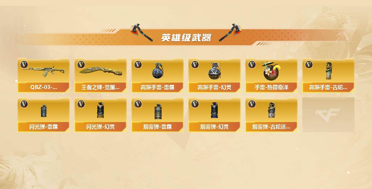 【英雄级武器】:AK47-火麒麟,M4A1-雷神,M4A1-黑骑士,HK417-朱雀,G36C-幻影,黑武士-锦绣游龙,金色蔷薇-古蛇迷踪,QBZ03-金色蔷薇,QBZ-03-王者蔷薇-觉醒版,AWM-天龙,Barrett-毁灭,Barrett-极光,AWM-裁决,M200-幻神,沙鹰-修罗,COP 357-幻灵*2,修罗-古蛇迷踪,屠龙*2,炽芒蝶刃,王者之锋-觉醒版,高爆手雷-雷霆,高爆手雷-幻灵*7,手雷-热带奇洋,高爆手雷-古蛇迷踪,闪光弹-雷霆,闪光弹-幻灵*7,烟雾弹-雷霆*2,烟雾弹-幻灵*7,烟雾弹-古蛇迷踪