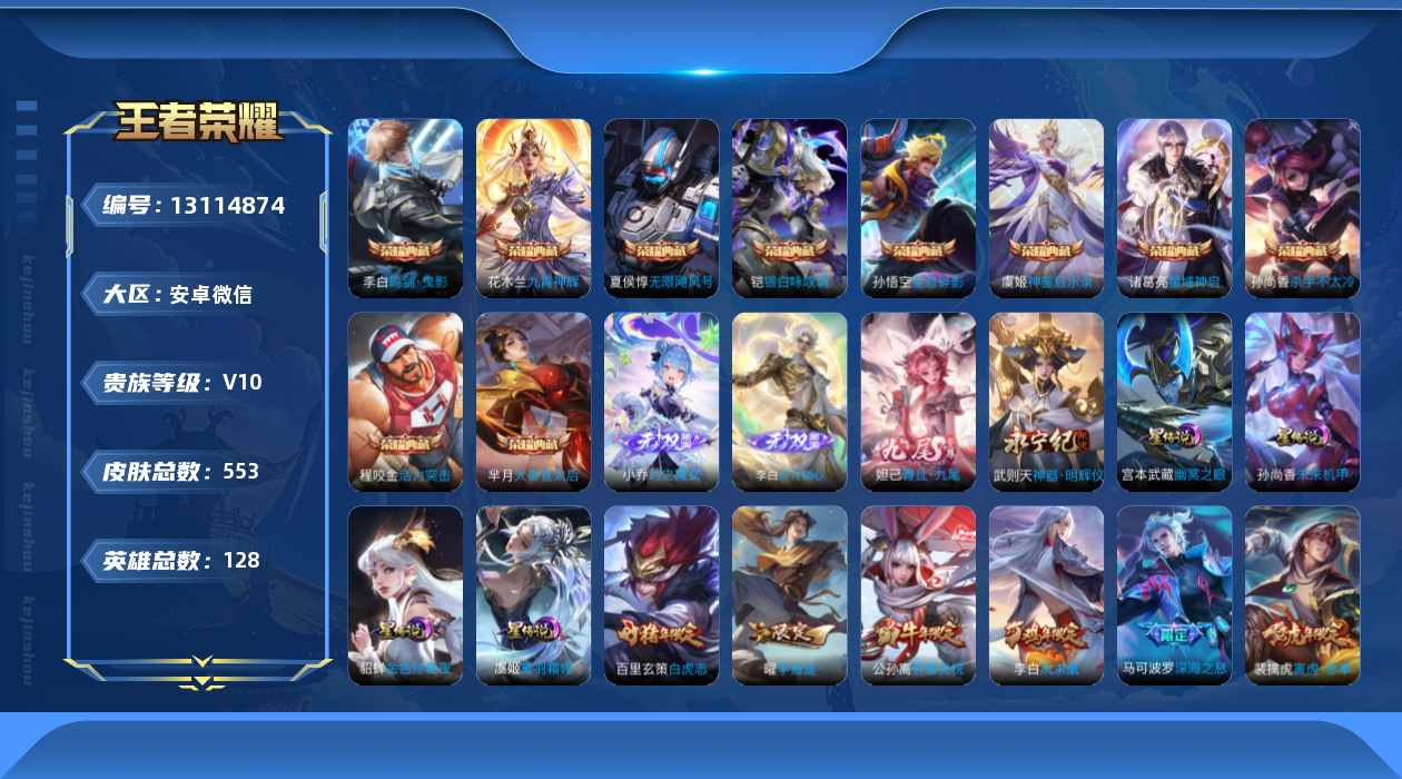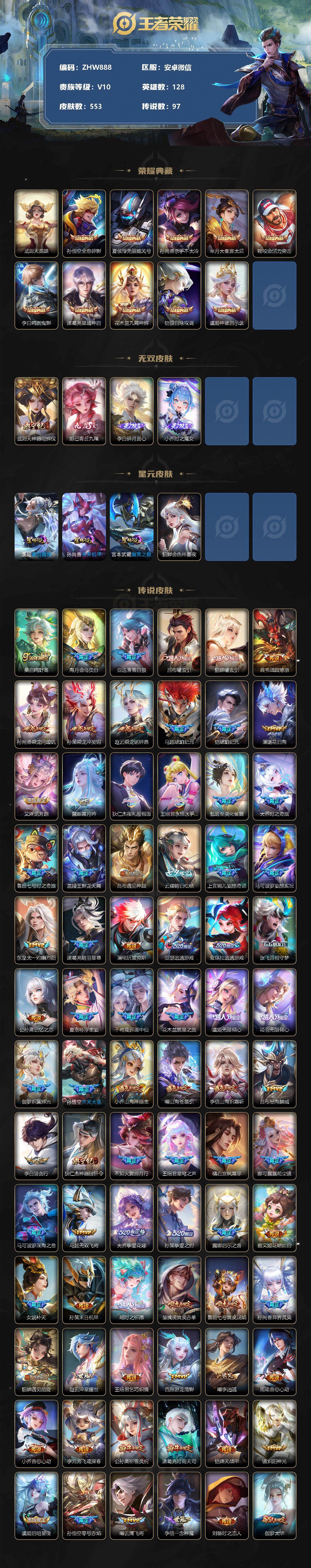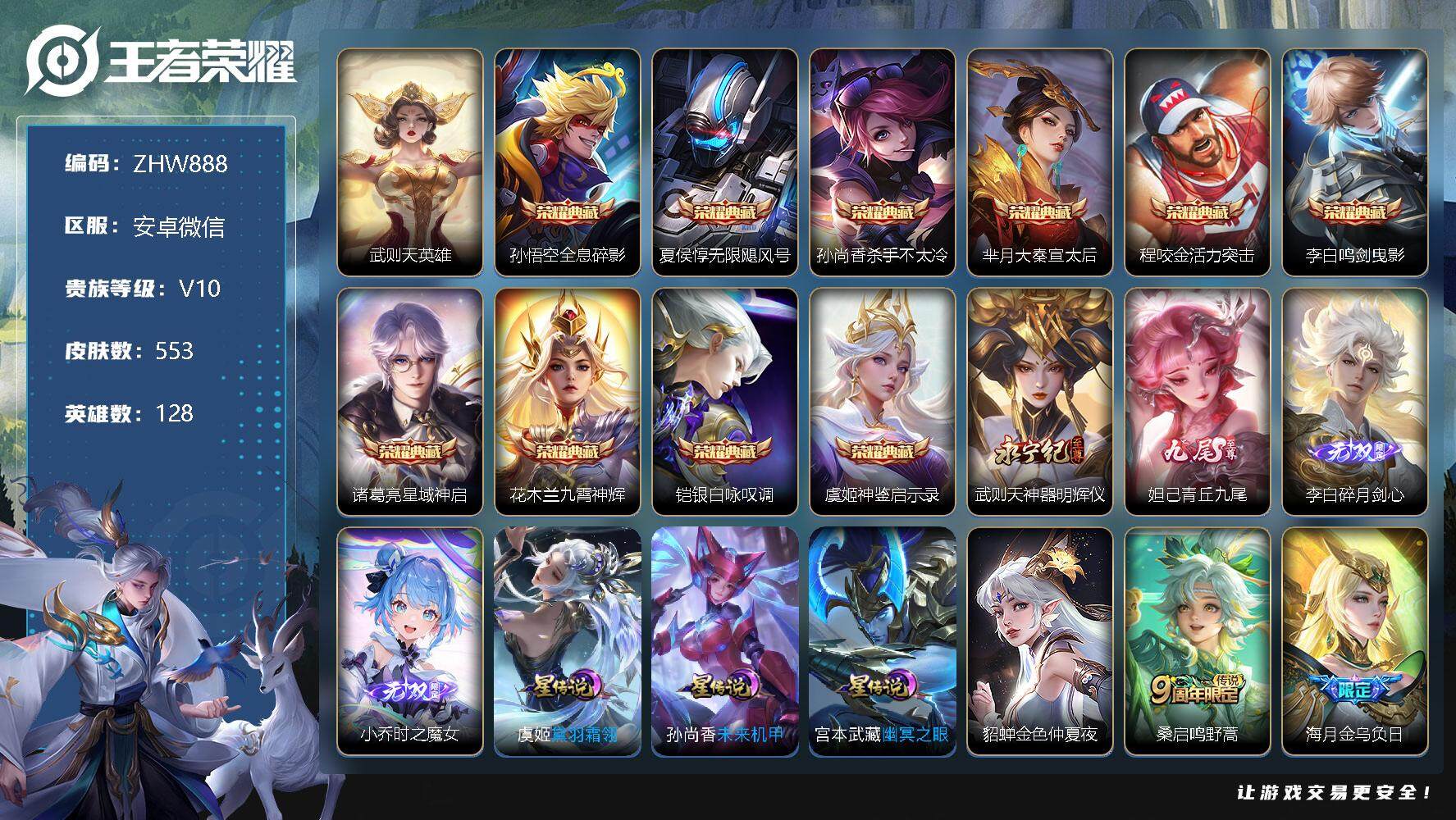 [13114874]V限制可解-安卓WX-V10-禁言禁友至26年2月22号-介意勿拍--128英雄-553皮肤-10典藏-4无双-97传说-192史诗-4星元 【英雄全皮】:扁鹊全皮,刘邦全皮,花木兰全皮,娜可露露全皮,橘右京全皮,钟馗全皮,太乙真人全皮,梦奇全皮,李信全皮,猪八戒全皮,海月全皮,鲁班大师全皮,蒙恬全皮,阿古朵全皮,夏洛特全皮,金蝉全皮 【荣耀典藏】:武则天英雄,孙悟空全息碎影,夏侯惇无限飓风号,孙尚香杀手不太冷,芈月大秦宣太后,程咬金活力突击,李白鸣剑曳影,诸葛亮星域神启,花木兰九霄神辉,铠银白咏叹调,虞姬神鉴启示录 【无双皮肤】:武则天神器明辉仪,妲己青丘九尾,李白碎月剑心,小乔时之魔女 【传说皮肤】:桑启鸣野蒿,海月金乌负日,亚连落雪白狼,吕布曦玄引,貂蝉曦玄引,典韦战鼓燎原,孙尚香乘龙问璇玑,孙策乘龙淬吴钩,赵云乘龙铭钟鼎,马超琥珀纪元,铠琥珀纪元,澜逐花归海,艾琳觅芳踪,露娜霜月吟,狄仁杰夜礼服假面,王昭君永恒水手月亮,甄姬至美化雀舞,大乔时之奇旅,鲁班七号时之奇旅,兰陵王影龙天霄,吕布遇见神鼓,云缨鹤归松栖,上官婉儿妄想奇谈,马可波罗妄想实况,东皇太一灼幽烈阳,诸葛亮鹤羽星尊,澜电玩雷克斯,亚瑟追逃游戏,安琪拉追逃游戏,张飞百相守梦,公孙离记忆之芯,夏洛特浮生妄,干将莫邪画中仙,花木兰燃星之曲,虞姬无限倾心,项羽无限倾心,伽罗炽翼辉光,孙悟空齐天大圣,小乔山海琳琅生,曜山海苍雷引,李信山海炽霜斩,吕布怒海麟威,李白诗剑行,狄仁杰神器狴犴令,不知火舞绯月行,王昭君星穹之声,橘右京枫霜尽,娜可露露前尘镜,马可波罗深海之息,马超无双飞将,大乔挚爱花嫁,孙策挚爱之约,露娜启示之音,蔡文姬花朝如约,女娲补天,孙策末日机甲,瑶时之祈愿,裴擒虎寅虎赤拳,鲁班七号寅虎瑞焰,孙尚香异界灵契,貂蝉遇见胡旋,赵云淬星耀世,王昭君乞巧织情,西施游龙清影,曜李逍遥 ,周瑜音你心动,小乔音你心动,李元芳飞鸢探春,公孙离祈雪灵祝,诸葛亮时雨天司,铠绛天战甲,镜炽阳神光,虞姬启明星使,孙悟空零号赤焰,曜云鹰飞将,李信一念神魔,刘备时之恋人,伽罗太华,貂蝉猫影幻舞,张良黄金白羊座,干将莫邪久胜战神,虞姬云霓雀翎,达摩黄金狮子座,百里玄策白虎志,花木兰冠军飞将,梦奇胖达荣荣,后羿黄金射手座,杨戬永曜之星,诸葛亮武陵仙君,貂蝉仲夏夜之梦,李白凤求凰,孙尚香末日机甲,宫本武藏地狱之眼,孙悟空地