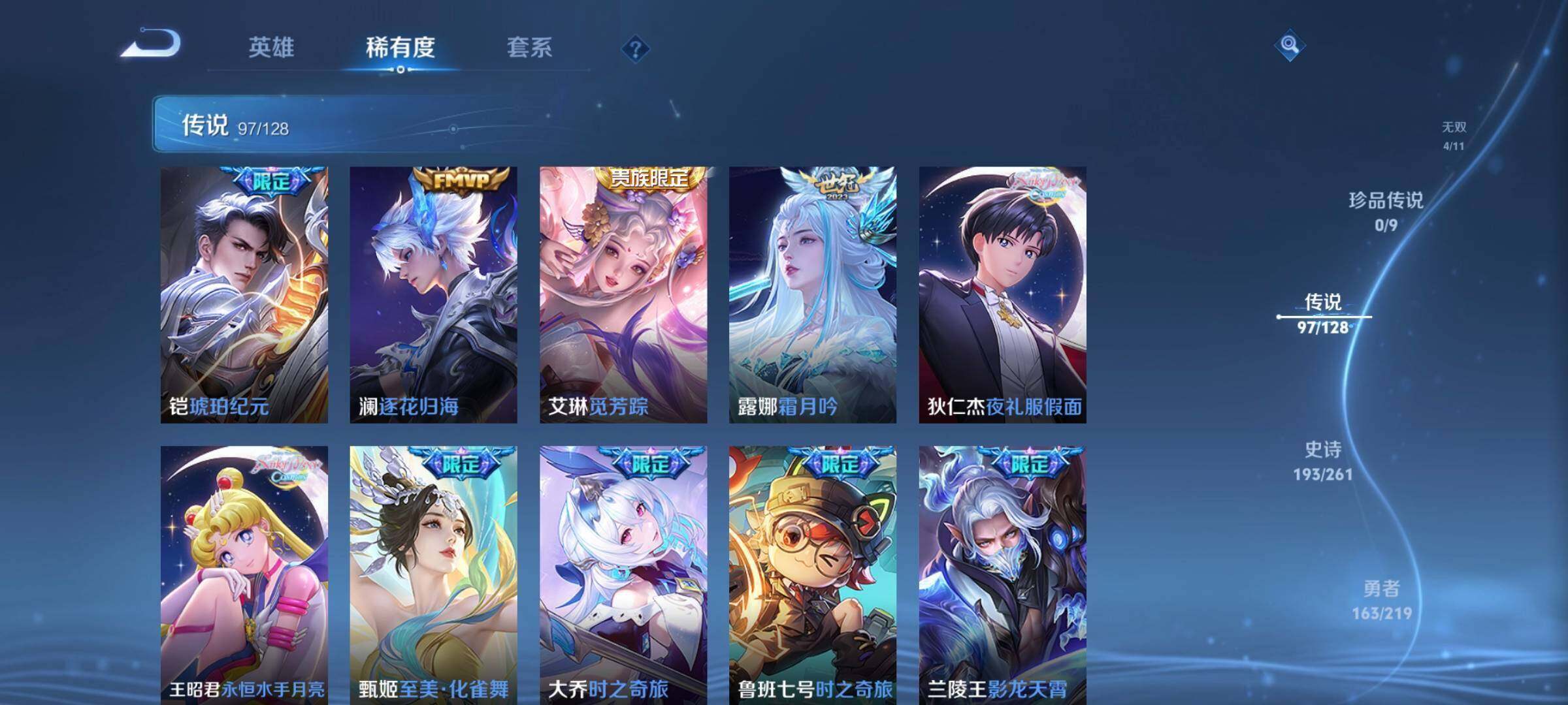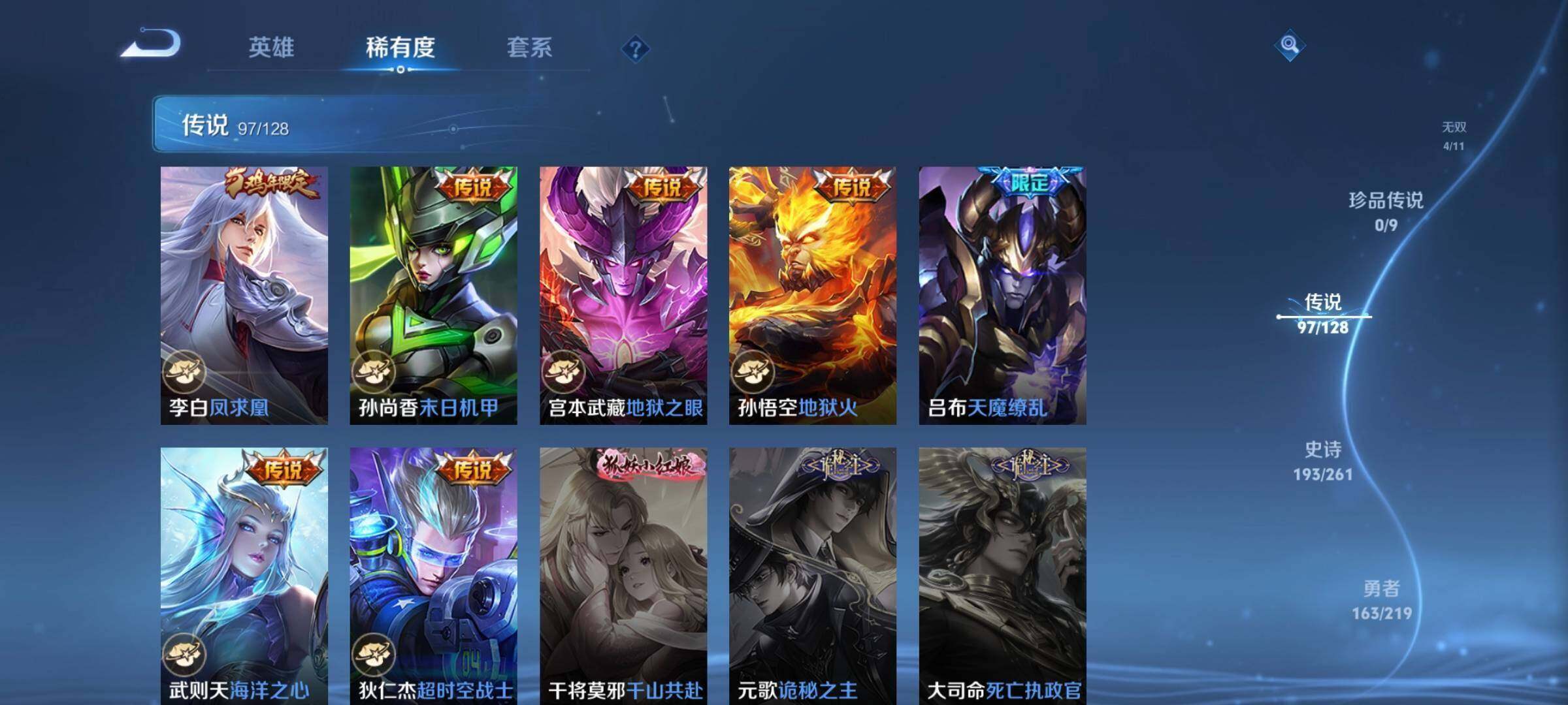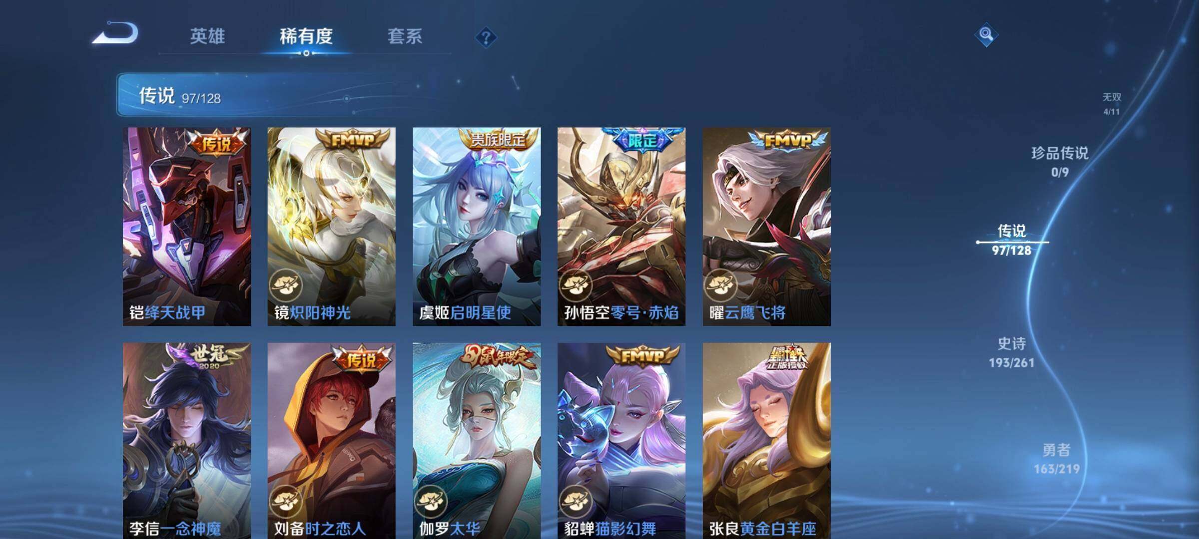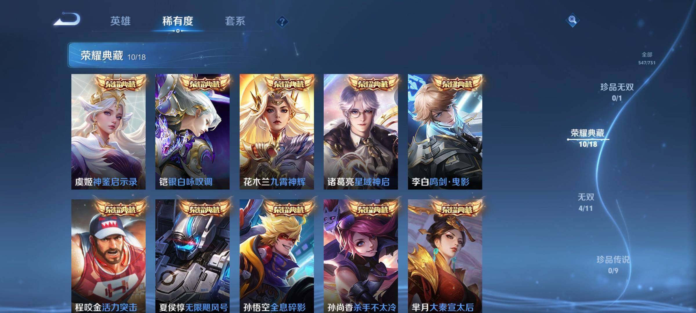【荣耀典藏】:武则天英雄,孙悟空全息碎影,夏侯惇无限飓风号,孙尚香杀手不太冷,芈月大秦宣太后,程咬金活力突击,李白鸣剑曳影,诸葛亮星域神启,花木兰九霄神辉,铠银白咏叹调,虞姬神鉴启示录
