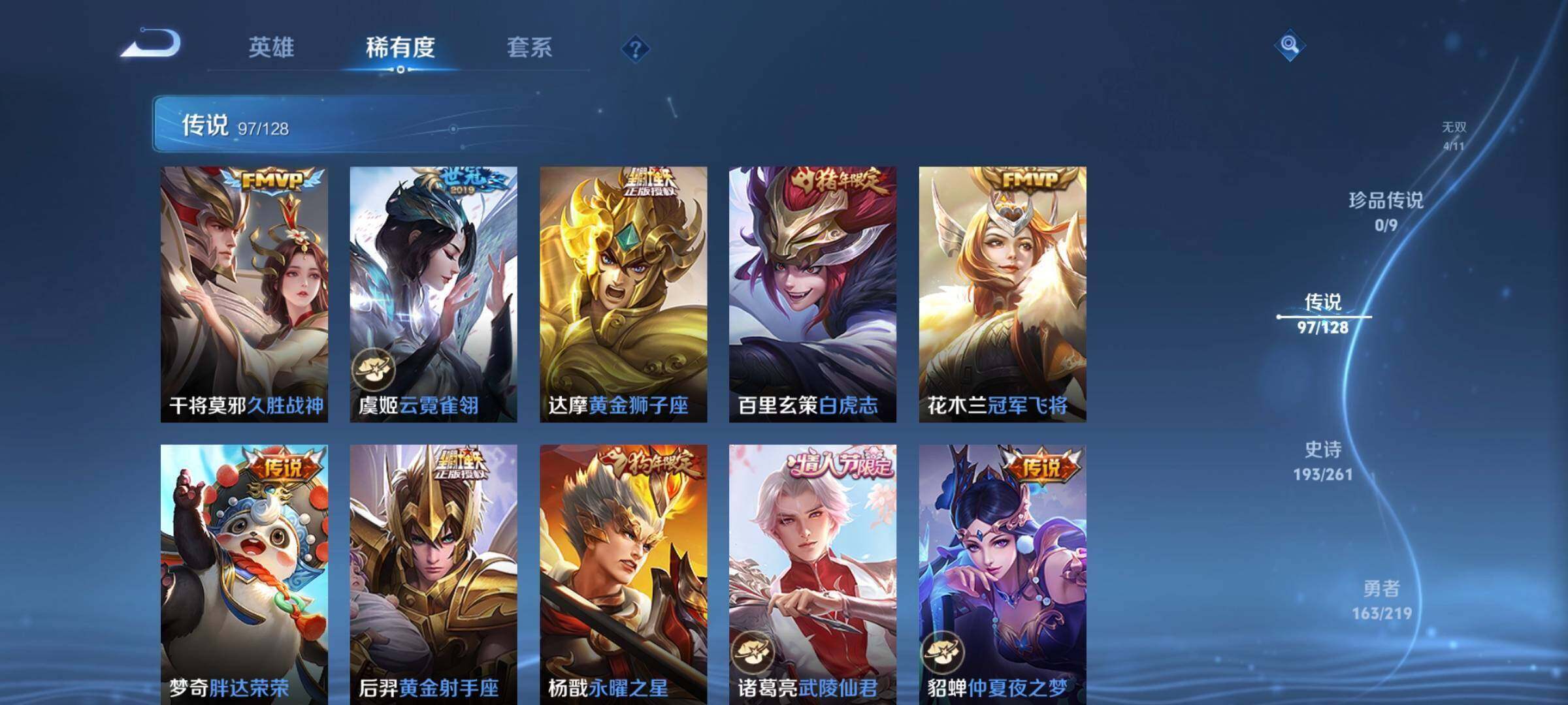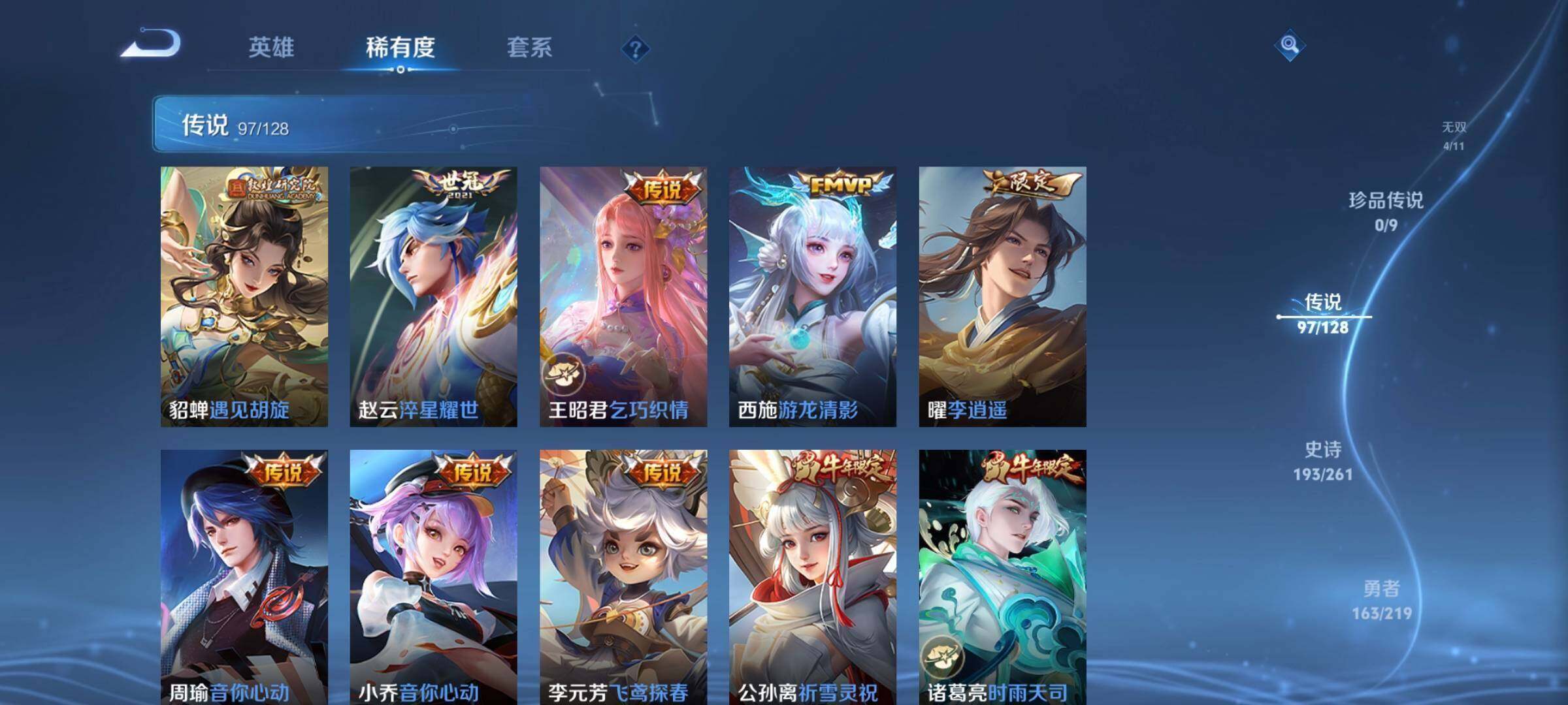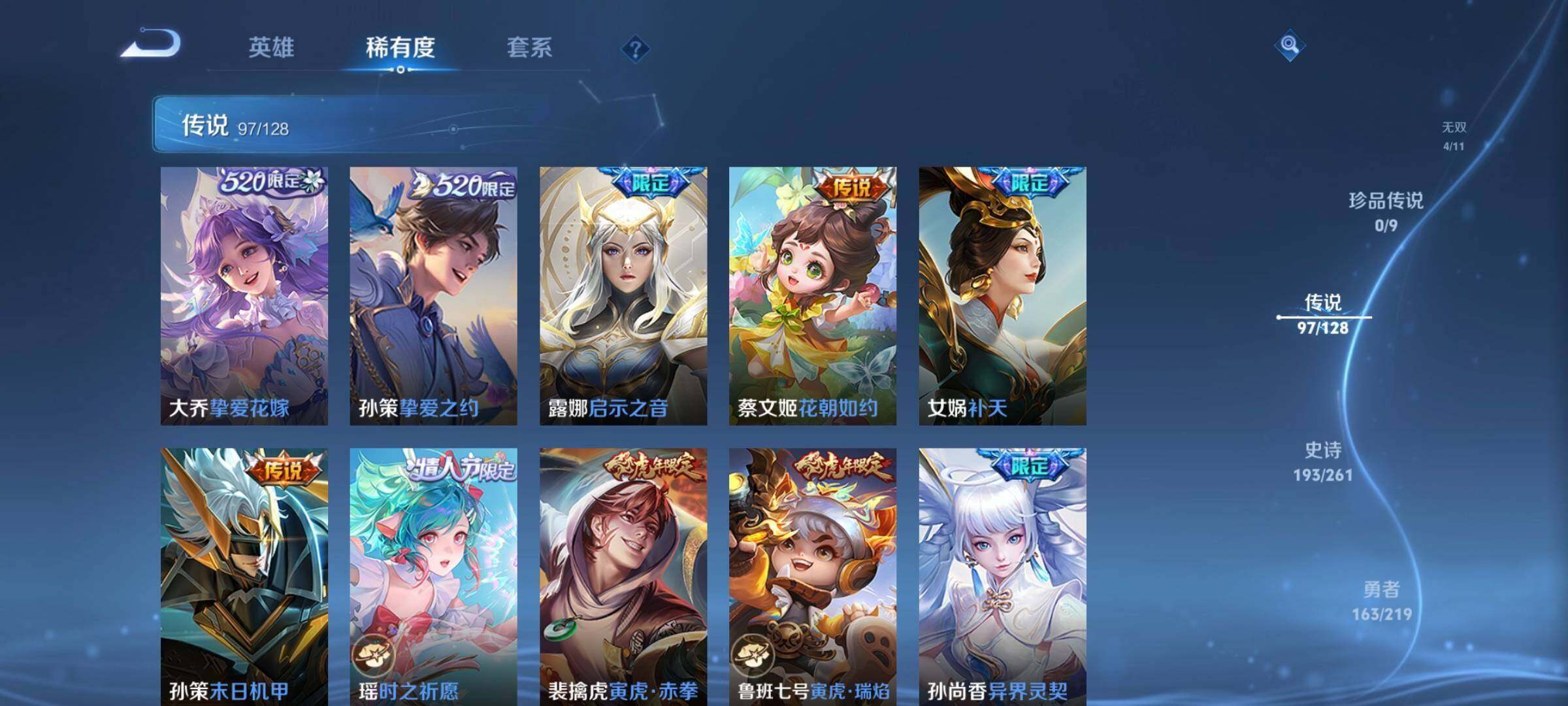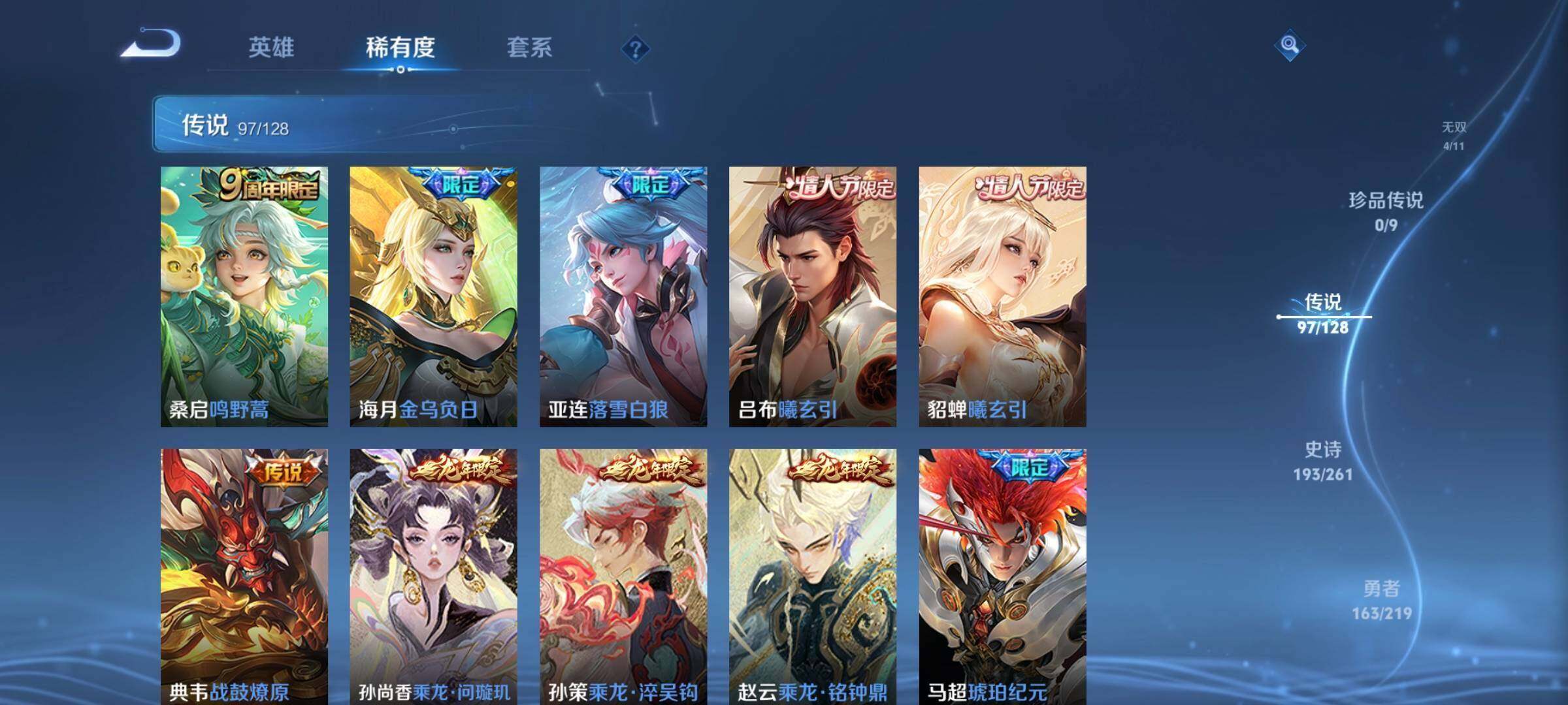 【传说皮肤】:桑启鸣野蒿,海月金乌负日,亚连落雪白狼,吕布曦玄引,貂蝉曦玄引,典韦战鼓燎原,孙尚香乘龙问璇玑,孙策乘龙淬吴钩,赵云乘龙铭钟鼎,马超琥珀纪元,铠琥珀纪元,澜逐花归海,艾琳觅芳踪,露娜霜月吟,狄仁杰夜礼服假面,王昭君永恒水手月亮,甄姬至美化雀舞,大乔时之奇旅,鲁班七号时之奇旅,兰陵王影龙天霄,吕布遇见神鼓,云缨鹤归松栖,上官婉儿妄想奇谈,马可波罗妄想实况,东皇太一灼幽烈阳,诸葛亮鹤羽星尊,澜电玩雷克斯,亚瑟追逃游戏,安琪拉追逃游戏,张飞百相守梦,公孙离记忆之芯,夏洛特浮生妄,干将莫邪画中仙,花木兰燃星之曲,虞姬无限倾心,项羽无限倾心,伽罗炽翼辉光,孙悟空齐天大圣,小乔山海琳琅生,曜山海苍雷引,李信山海炽霜斩,吕布怒海麟威,李白诗剑行,狄仁杰神器狴犴令,不知火舞绯月行,王昭君星穹之声,橘右京枫霜尽,娜可露露前尘镜,马可波罗深海之息,马超无双飞将,大乔挚爱花嫁,孙策挚爱之约,露娜启示之音,蔡文姬花朝如约,女娲补天,孙策末日机甲,瑶时之祈愿,裴擒虎寅虎赤拳,鲁班七号寅虎瑞焰,孙尚香异界灵契,貂蝉遇见胡旋,赵云淬星耀世,王昭君乞巧织情,西施游龙清影,曜李逍遥 ,周瑜音你心动,小乔音你心动,李元芳飞鸢探春,公孙离祈雪灵祝,诸葛亮时雨天司,铠绛天战甲,镜炽阳神光,虞姬启明星使,孙悟空零号赤焰,曜云鹰飞将,李信一念神魔,刘备时之恋人,伽罗太华,貂蝉猫影幻舞,张良黄金白羊座,干将莫邪久胜战神,虞姬云霓雀翎,达摩黄金狮子座,百里玄策白虎志,花木兰冠军飞将,梦奇胖达荣荣,后羿黄金射手座,杨戬永曜之星,诸葛亮武陵仙君,貂蝉仲夏夜之梦,李白凤求凰,孙尚香末日机甲,宫本武藏地狱之眼,孙悟空地