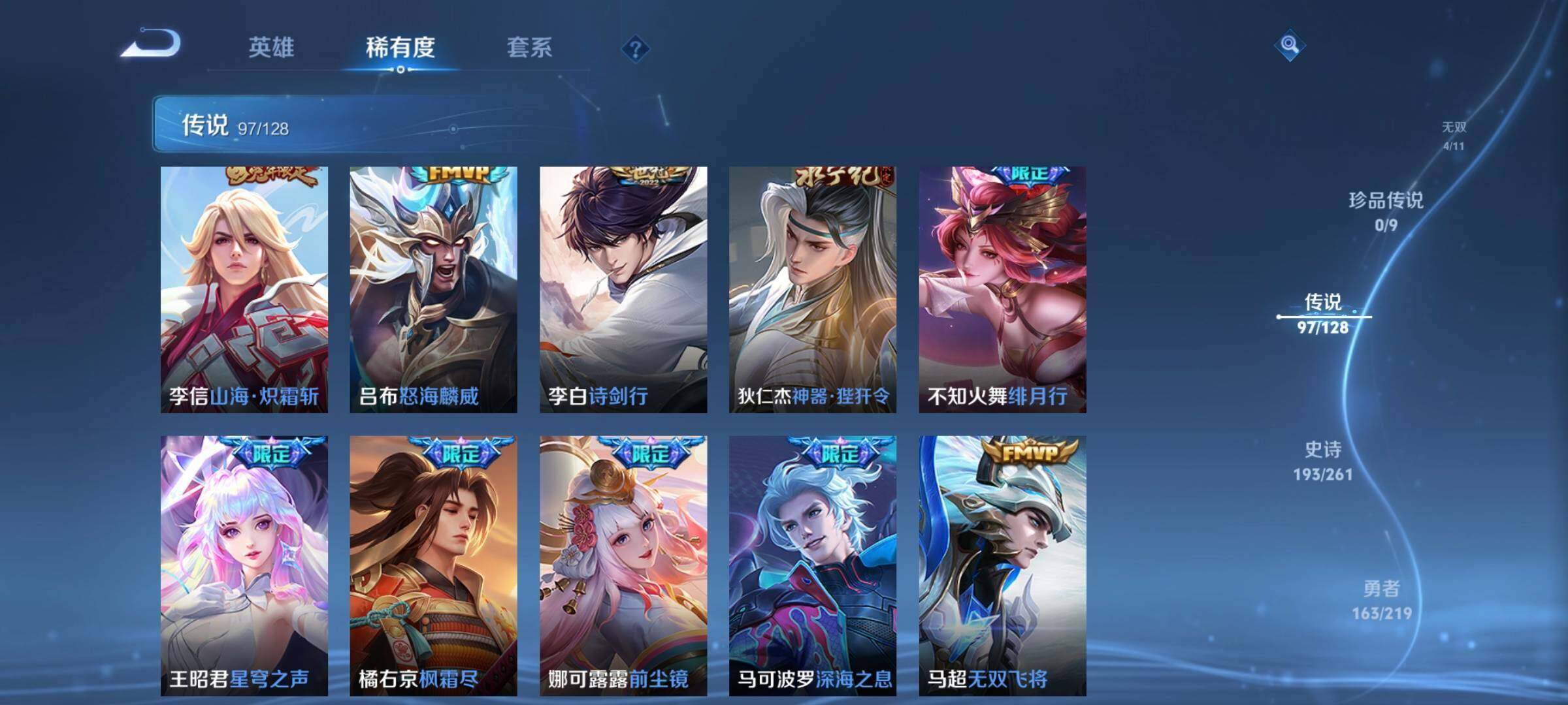- [13323793]安卓Q-V6-至尊星耀IV段位-124英雄-212皮肤-1典藏-1星传说-5传说-50史诗 【英雄全皮】:蒙恬全皮 【荣耀典藏】:韩信弑枪猎影 【传说皮肤】:澜愿照九州拓,李信山海炽霜斩,后羿黄金射手座,孙悟空地狱火,狄仁杰超时空战士 【限定皮肤】:蔡文姬夏日便利店,虞姬夏日便利店,狄仁杰阴阳师,赵云皇家上将,庄周高山流水,高渐离玩趣恶龙,钟无艳超时空战士,扁鹊炼金王,白起夜都怪侠,芈月重明,夏侯惇朔风刀,甄姬落雪兰心,典韦穷奇,马可波罗暗影游猎,马可波罗山海玄木吟,狄仁杰魔术师,狄仁杰万华元夜,达摩沙漠行僧,项羽海滩派对,老夫子醍醐杖,程咬金演武夺筹,刘邦夺宝奇兵,兰陵王金庭之子,孙悟空大圣娶亲,牛魔御旌,李元芳云中旅人,钟馗驱傩正仪,杨玉环遇见飞天,雅典娜单词大作战,蔡文姬繁星吟游,鬼谷子原初探秘者,鬼谷子五谷丰年,苏烈千军破阵,百里玄策原初追逐者,弈星混沌棋,沈梦溪大漠名商,明世隐疑决卦,明世隐吟游魔法,裴擒虎李小龙,裴擒虎擒涛扼浪,狂铁御狮,米莱狄御霄,云中君纤云弄巧,李信山海炽霜斩,盾山御銮,猪八戒西部大镖客,上官婉儿天狼绘梦者,嫦娥暖冬兔眠,西施玲珑珍味,蒙犽狂想玩偶喵,鲁班大师探海日志,桑启海盐诗旅,暃星界游侠,戈娅驭风魔法,张良古海寻踪,蒙恬荣光圣徽,鬼谷子天穹祈灯,刘邦剑破天穹,项羽苍威无极 【年限皮肤】:马可波罗山海玄木吟,李信山海炽霜斩 【赛季限定】:扁鹊炼金王,芈月重明,夏侯惇朔风刀,典韦穷奇,狄仁杰万华元夜,达摩沙漠行僧,老夫子醍醐杖,程咬金演武夺筹,兰陵王金庭之子,张良古海寻踪,牛魔御旌,李元芳云中旅人,钟馗驱傩正仪,鬼谷子原初探秘者,苏烈千军破阵,百里玄策原初追逐者,弈星混沌棋,沈梦溪大漠名商,明世隐疑决卦,裴擒虎擒涛扼浪,狂铁御狮,米莱狄御霄,盾山御銮,鲁班大师探海日志,桑启海盐诗旅,鬼谷子天穹祈灯,蒙恬荣光圣徽,刘邦剑破天穹 【战令限定】:蔡文姬夏日便利店,虞姬夏日便利店,钟无艳超时空战士,白起夜都怪侠,甄姬落雪兰心,马可波罗暗影游猎,刘邦夺宝奇兵,雅典娜单词大作战,明世隐吟游魔法,猪八戒西部大镖客,嫦娥暖冬兔眠,西施玲珑珍味,蒙犽狂想玩偶喵,暃星界游侠,戈娅驭风魔法,项羽苍威无极 【史诗皮肤】:鲁班七号电玩小子,项羽苍穹之光,露娜紫霞仙子,阿轲暗夜猫娘,赵云皇家上将,赵云未来纪元,甄姬冰雪圆舞曲,王昭君偶像歌手,狄仁杰魔术师,宫
