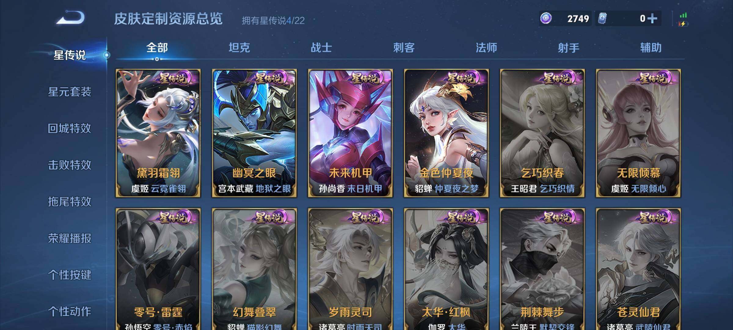 达摩黄金狮子座,张良黄金白羊座,干将莫邪久胜战神,铠绛天战甲,貂蝉猫影幻舞,曜云鹰飞将,镜炽阳神光,西施游龙清影,虞姬云霓雀翎,李信一念神魔,赵云淬星耀世,小乔音你心动,周瑜音你心动,刘备时之恋人,孙悟空零号·赤焰,李元芳飞鸢探春,曜李逍遥,王昭君乞巧织情,貂蝉遇见胡旋,孙策末日机甲,蔡文姬花朝如约,孙策挚爱之约,大乔挚爱花嫁,马超无双飞将,狄仁杰神器·狴犴令,干将莫邪画中仙,夏洛特浮生妄,公孙离记忆之芯,张飞百相守梦,安琪拉追逃游戏,亚瑟追逃游戏,吕布遇见神鼓,大乔时之奇旅,鲁班七号时之奇旅,王昭君永恒水手月亮,狄仁杰夜礼服假面,露娜霜月吟,艾琳觅芳踪,澜逐花归海,铠琥珀纪元,马超琥珀纪元,孙策乘龙·淬吴钩,赵云乘龙·铭钟鼎,孙尚香乘龙·问璇玑,典韦战鼓燎原,吕布曦玄引,貂蝉曦玄引,亚连落雪白狼,海月金乌负日