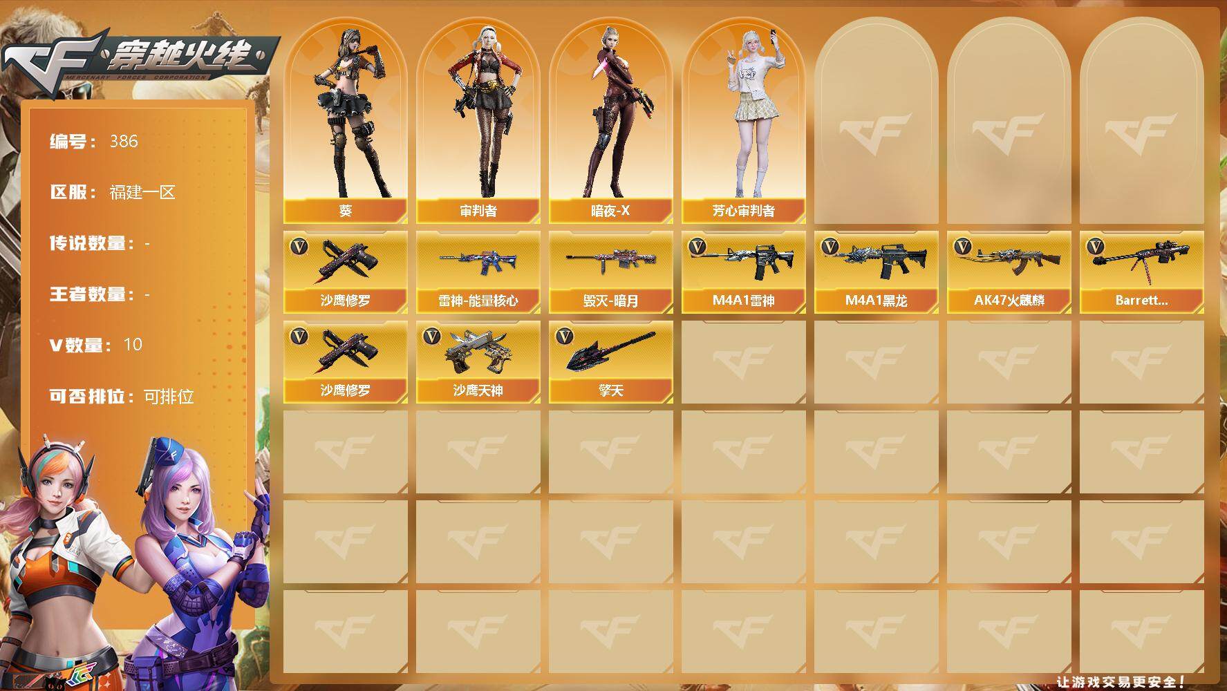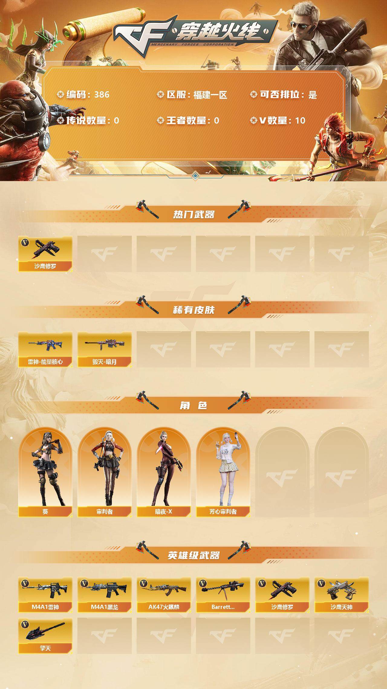 [13115467]福建一区-10V-0王者-0炫金 【热门武器】:沙鹰-修罗 【皮肤】:雷神-能量核心*2,毁灭-暗月*2,黑龙-能量核心,黑龙-暗月*2,无影-暗月,死神-秘银*5,天启-暗月*3,修罗-能量核心 【角色】:葵,审判者,暗夜-X,芳心审判者 【英雄级武器】:AK47-火麒麟,M4A1-黑龙,M4A1-雷神,Barrett-毁灭,沙鹰-修罗,沙鹰-天神,擎天 【特殊枪械】: