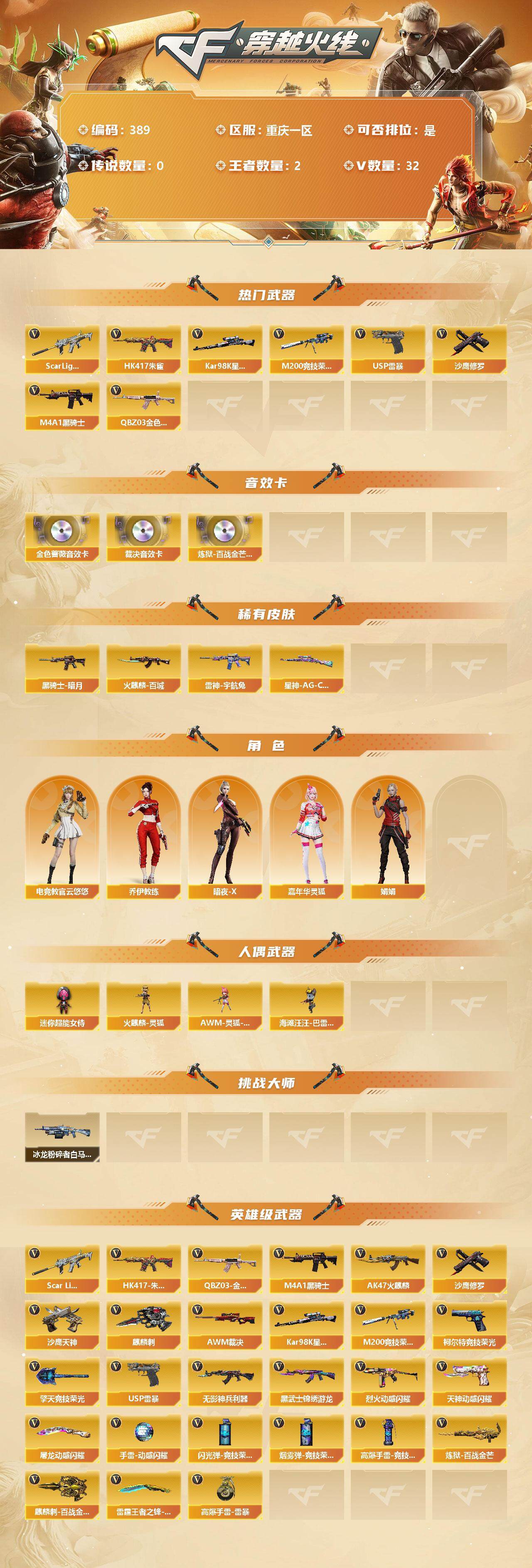 [13115559]重庆一区-32V-2王者-0炫金 【热门武器】:QBZ03-金色蔷薇,Scar Light-白虎,HK417-朱雀,M200-竞技荣光,Kar98K-星神,M4A1-黑骑士,USP-雷暴,沙鹰-修罗 【音效卡】:QBZ03-金色蔷薇音效卡,AWM-裁决音效卡,炼狱-百战金芒-庆典舞曲音效卡 【皮肤】:白虎-百战金芒 皮肤,裁决-巅峰荣耀 皮肤,裁决-运输船 皮肤,Kar98K-星神-AG-CFPLS21冠军皮肤,雷神-宇航兔皮肤,M4A1-再燃火线,火麒麟-百城,黑骑士-暗月,战神-粉色甜心皮肤,战神-流金岁月皮肤*2,AK47-B-常胜将军-刘备,轻型军用手斧-再燃火线 【角色】:电竞教官-云悠悠,乔伊教练,暗夜-X,嘉年华灵狐,娟娟 【人偶武器】:火麒麟-灵狐,AWM-灵狐-15周年嘉年华,海滩汪汪-巴雷特,迷你超能女侍 【挑战大师】:冰龙粉碎者-白马银枪 【英雄级武器】:AK47-火麒麟,M4A1-黑骑士,HK417-朱雀,Scar Light-白虎,无影-神兵利器,黑武士-锦绣游龙,QBZ03-金色蔷薇,烈火-动感闪耀,AWM-裁决,Kar98K-星神,M200-竞技荣光,炼狱-百战金芒,沙鹰-修罗,沙鹰-天神,USP-雷暴,柯尔特-竞技荣光,天神-动感闪耀,麒麟刺,擎天-竞技荣光,屠龙-动感闪耀,麒麟刺-百战金芒,雷霆王者之锋-觉醒版,高爆手雷-雷暴,高爆手雷-竞技荣光,手雷-动感闪耀,高爆手雷-玄豹,闪光弹-竞技荣光,烟雾弹-竞技荣光 【特殊枪械】:1白虎,1黑骑士