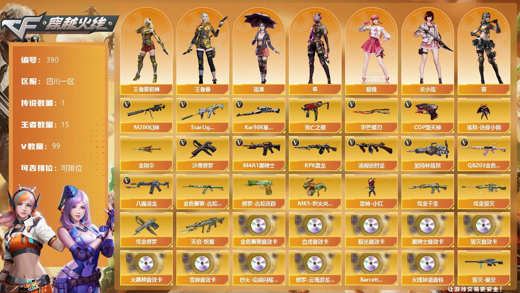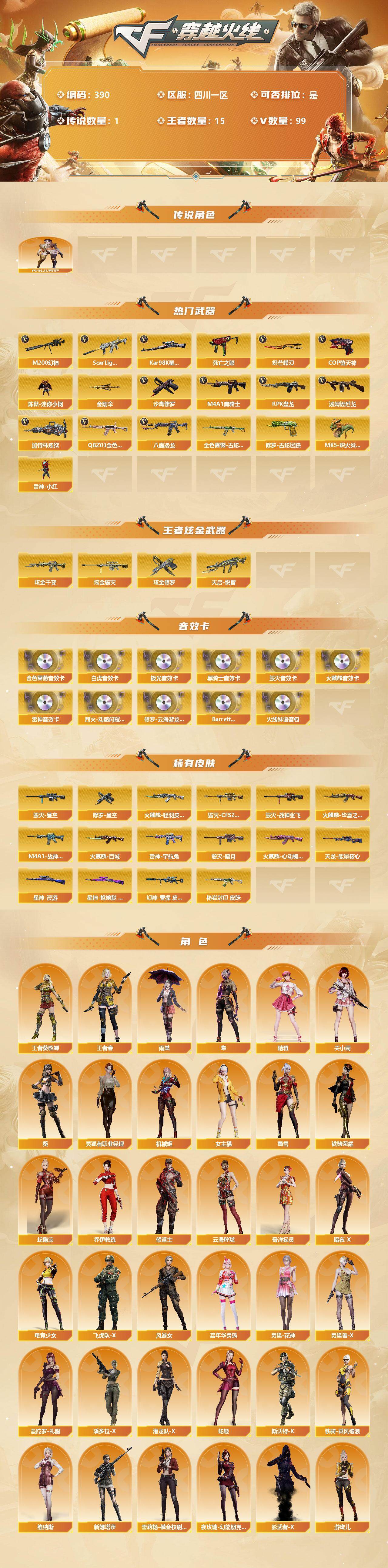 [13115583]四川一区-99V-15王者-3炫金 【传说角色】:传说艾莉莎 【热门武器】:QBZ03-金色蔷薇,Scar Light-白虎,M200-幻神,金色蔷薇-古蛇迷踪,修罗-古蛇迷踪,八面凌龙,死亡之眼,Kar98K-星神,炼狱-迷你小钢,M4A1-黑骑士*5,汤姆逊-烈龙,RPK-盘龙*6,加特林-炼狱,MK5-炽火炎龙,雷神-小红,COP-堕天神,沙鹰-修罗*6,炽芒蝶刃,金刚伞 【王者炫金武器】:天启-悦智,炫金千变,炫金毁灭,炫金修罗 【音效卡】:烈火-动感闪耀 音效卡,修罗-云海游龙音效卡,AK47-火麒麟音效卡,M4A1-雷神音效卡,M4A1-黑骑士音效卡,Barrett-毁灭音效卡,Barrett-极光音效卡,QBZ03-金色蔷薇音效卡,Scar Light-白虎音效卡,Barrett-碧霄极光音效卡*2,火线妹语音包 【皮肤】:幻神-曹操 皮肤,金色蔷薇-秘岩封印 皮肤,星神-枪娘默 皮肤,星神-漫游,雷神-暗月,M4A1-战神赵云,雷神-宇航兔皮肤,雷神-源计划2.0专属 皮肤,火麒麟-华夏之心,火麒麟-轻羽皮肤,火麒麟-百城,火麒麟-心动糖果,毁灭-暗月,毁灭-星空,毁灭-CFS2020,毁灭-战神张飞,毁灭-百城浙江 皮肤,毁灭-虹光风暴 皮肤,烈火-动感闪耀 皮肤,战神-粉色甜心皮肤*4,战神-紫绶金章皮肤*8,战神-流金岁月皮肤*5,天龙-能量核心,极光-能量核心,修罗-能量核心,修罗-星空,修罗-15周年嘉年华 皮肤,麒麟刺-甜蜜糖果 皮肤 【角色】:葵,雨棠,关小雨,晴雅,隼,机械姬,王者-葵-貂蝉,王者春,蛇隐宗,奇洋探员,乔伊教练,修道士,云海玲珑,暗夜-X,电竞少女,飞虎队-X,风暴女,嘉年华灵狐,灵狐-花神,灵狐者-X,灵狐者-职业经理,曼陀罗-礼服,女主播,潘多拉-X,潜龙队-X,蛇姬,斯沃特-X,蜀雪,铁骑-乘风破浪,铁骑荣耀,兔囡囡,维纳斯,新娜塔莎,雪莉杨-摸金校尉,夜玫瑰-幻能朋克,影武者-X,游珑儿 【人偶武器】:雷神-小红,炼狱-迷你小钢,MK5-炽火炎龙,异变清道夫-蛇影双骄,巴雷特-零-水下丽影,AWM-灵狐-15周年嘉年华,海滩汪汪-巴雷特,M37-葵,迷你波特博士,迷你曼提柯尔,夺魂,迷你火种,生化手雷-机甲核心,闪光弹-小乔 【暴走生化】:炼狱-迷你小钢,KAC-狂怒咆哮,死亡之眼,超级对讲机 【挑战大师】: