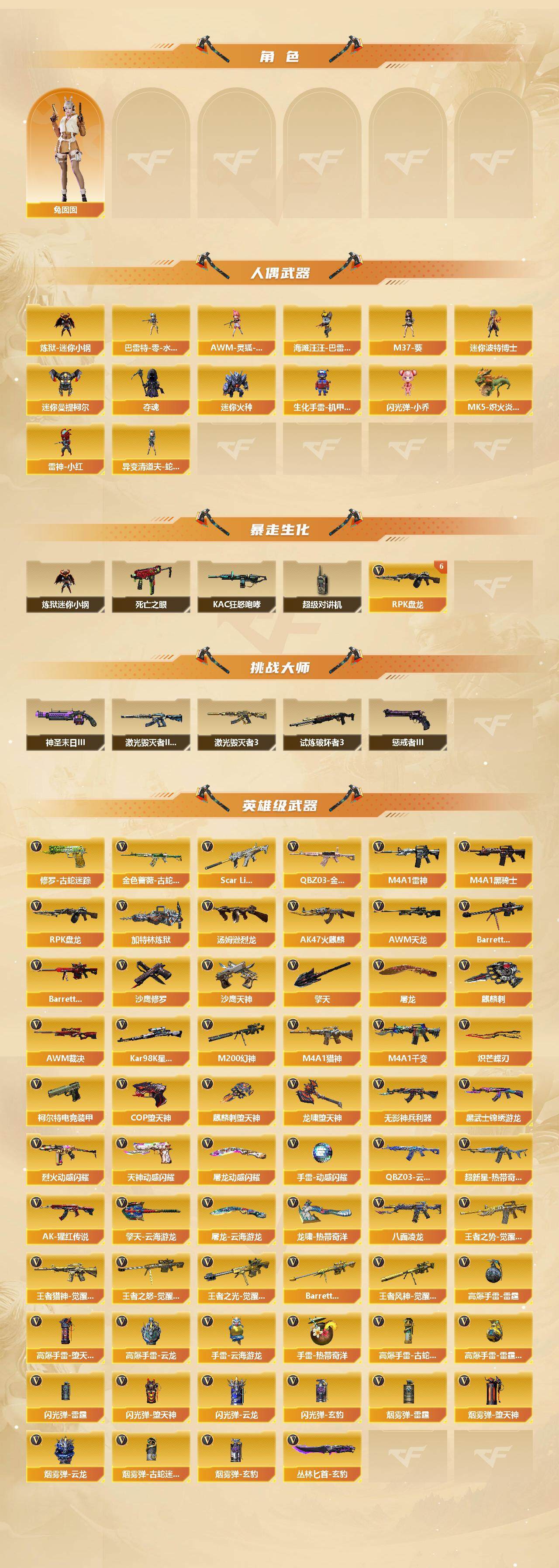 【热门武器】:QBZ03-金色蔷薇,Scar Light-白虎,M200-幻神,金色蔷薇-古蛇迷踪,修罗-古蛇迷踪,八面凌龙,死亡之眼,Kar98K-星神,炼狱-迷你小钢,M4A1-黑骑士*5,汤姆逊-烈龙,RPK-盘龙*6,加特林-炼狱,MK5-炽火炎龙,雷神-小红,COP-堕天神,沙鹰-修罗*6,炽芒蝶刃,金刚伞