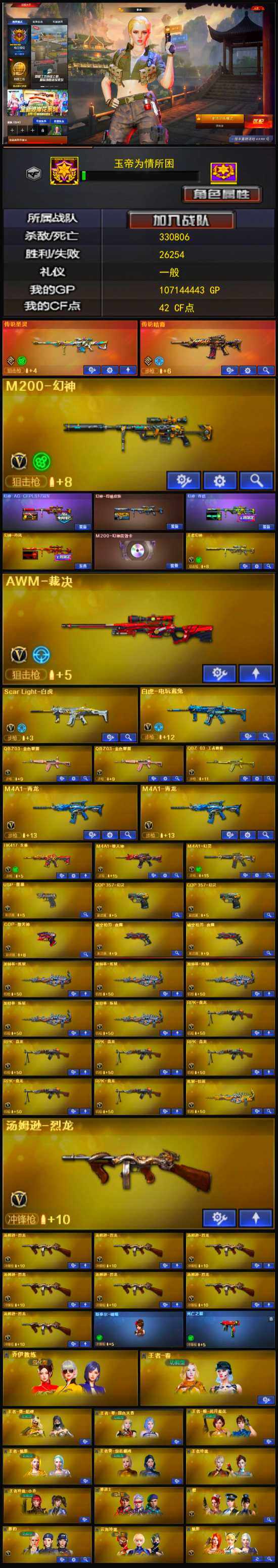 【皮肤】:幻神-周瑜皮肤,幻神-AG-CFPLS17冠军,幻神-丹凤,幻神-青鹤,雷神-暗月,雷神-星空,雷神-虎将,雷神-耀金皮肤,雷神-传奇N9,雷神-杨戬,雷神-烈虎皮肤,雷神-机甲刑天皮肤,雷神-源计划2.0专属 皮肤,雷神-化蛇 皮肤,火麒麟-战神关羽,火麒麟-平天大圣,火麒麟-百城,火麒麟-心动糖果,毁灭耀金皮肤,毁灭-星空,毁灭-冠军之怒,毁灭-战神张飞,毁灭-黑大圣皮肤*2,毁灭-风暴,毁灭-神秘黑洞皮肤,M4A1-千变-孔明皮肤,黑龙-暗月,黑骑士-暗月,黑骑士耀金皮肤,黑骑士-地狱火,无影耀金皮肤,战神-粉色甜心皮肤,AK47-B-常胜将军-曹操,AK47-B-常胜将军-刘备,AWM-天龙-传奇70KG,极光-能量核心,Barrett-金色蔷薇-蛇姬 皮肤,炼狱-玩具枪皮肤,炼狱-月 皮肤,修罗-CF STAR,修罗-能量核心,屠龙-春桃 皮肤,龙啸-蛇姬 皮肤,擎天-冠军之击,擎天-蒸汽钟表 皮肤,麒麟刺-萌杀皮肤