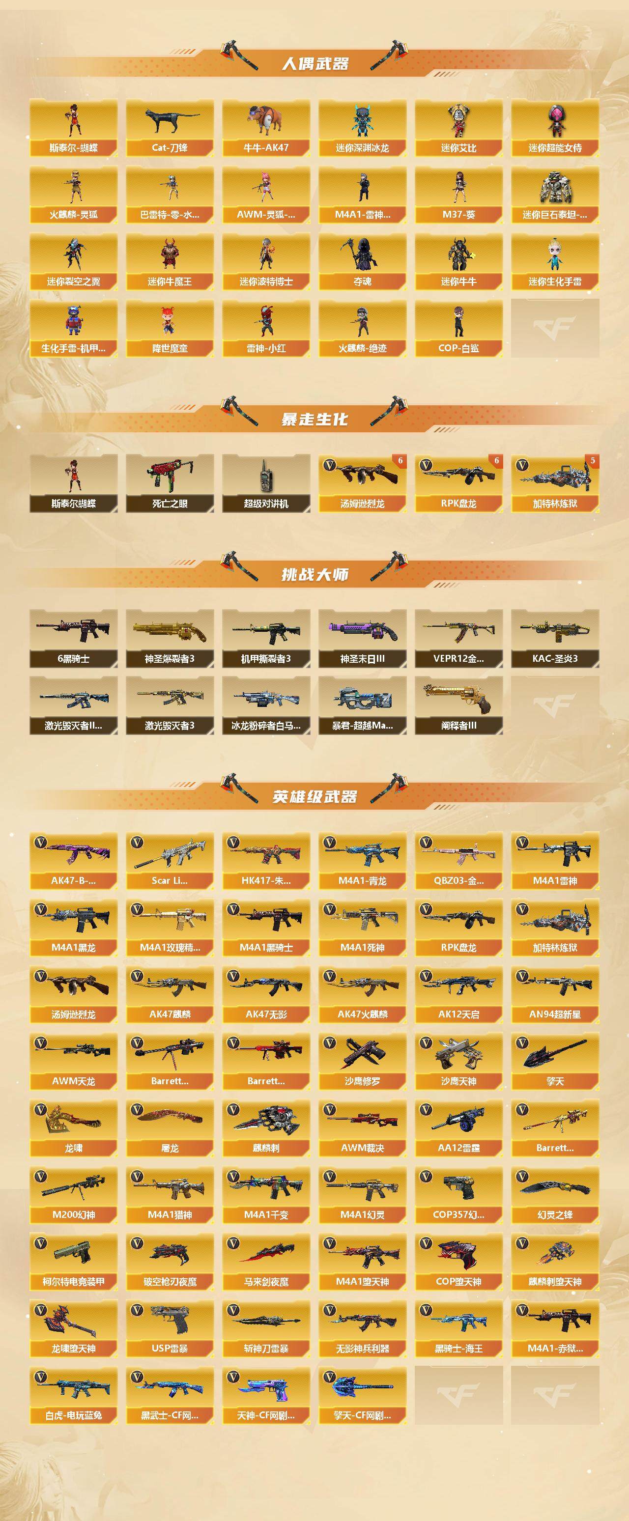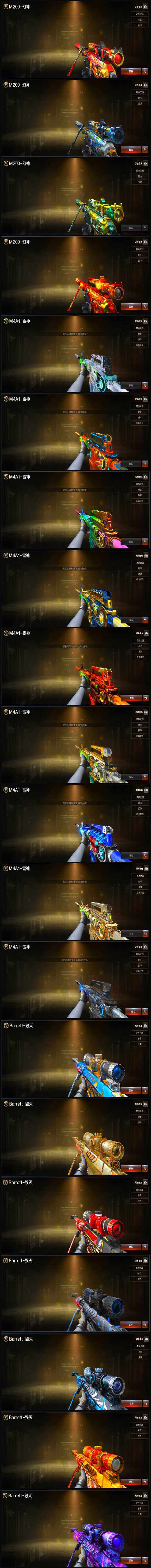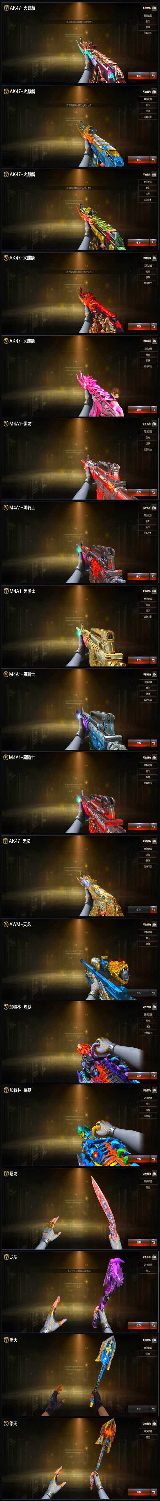 【热门武器】:传说暗裔,传说圣灵,QBZ03-金色蔷薇*2,Scar Light-白虎,HK417-朱雀,M4A1-青龙*2,M200-幻神,死亡之眼,白虎-电玩蓝兔,金色小号,Cat-刀锋,牛牛-AK47,M4A1-黑骑士*6,汤姆逊-烈龙*8,RPK-盘龙*6,加特林-炼狱*5,斯泰尔-蝴蝶,降世魔童,雷神-小红,火麒麟-绝迹,COP-白鲨,USP-雷暴,COP-堕天神,COP 357-幻灵*2,沙鹰-修罗*5