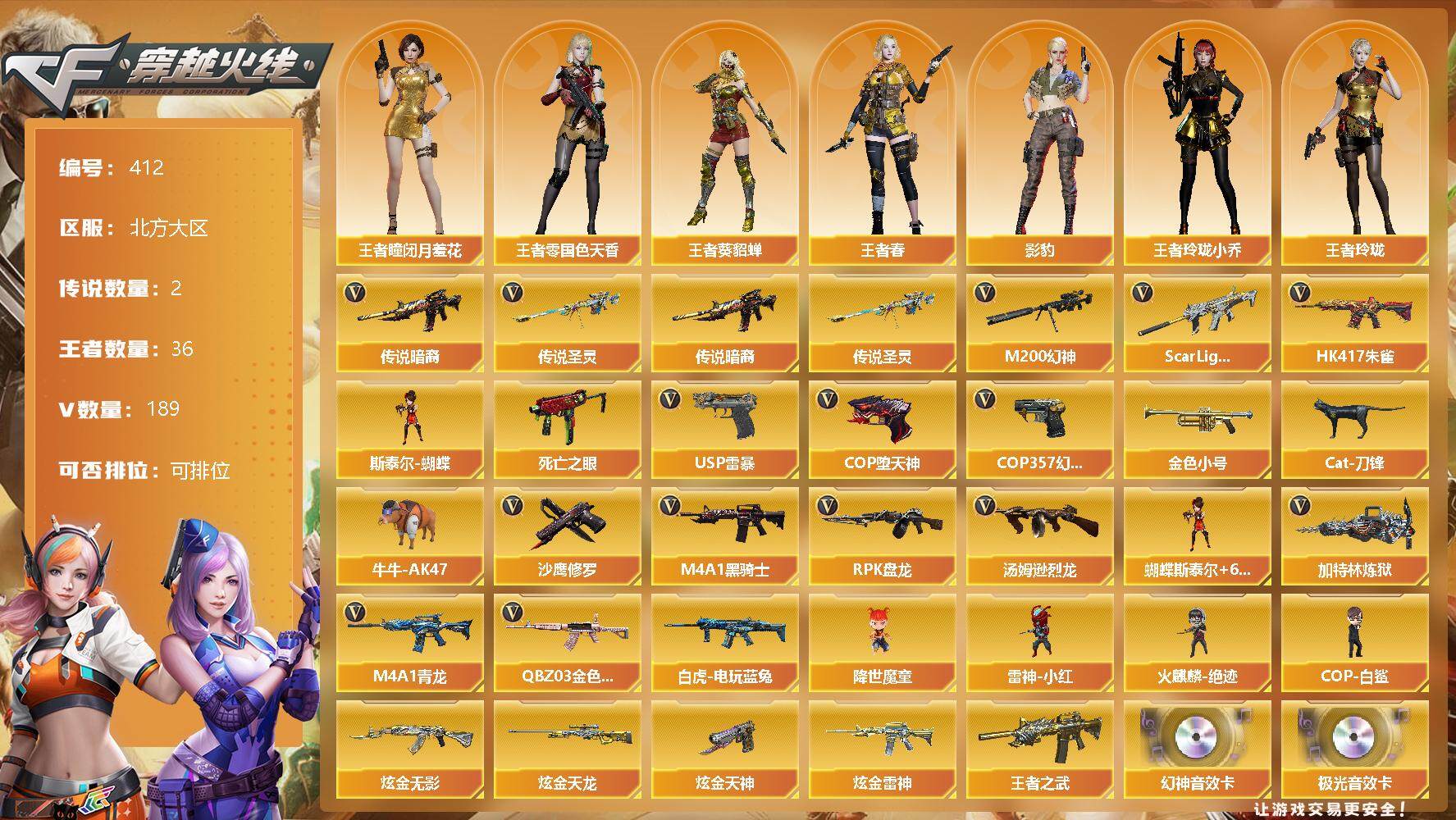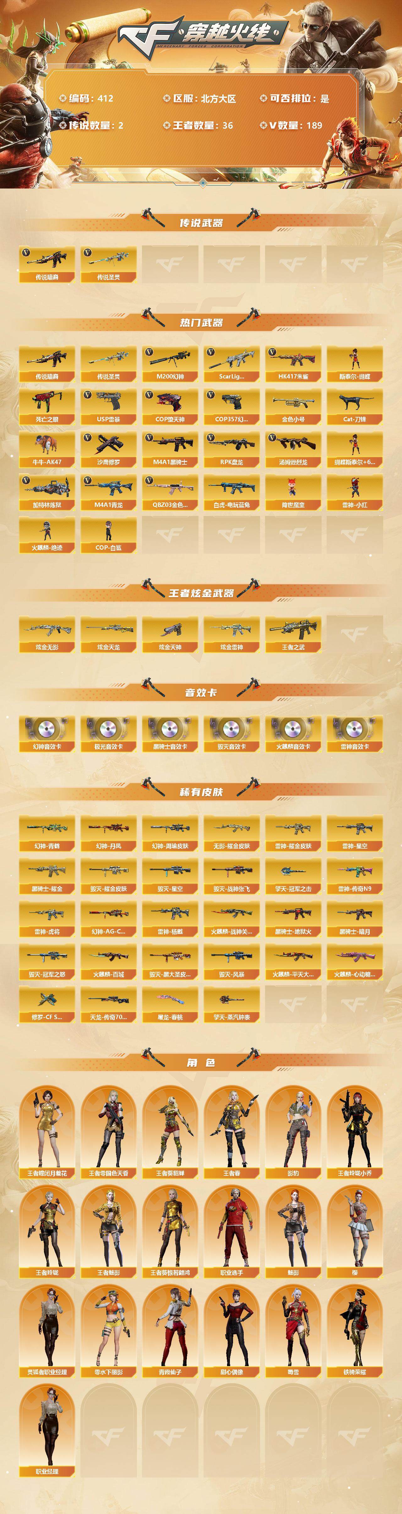 [13115565]北方大区-189V-36王者-4炫金 【传说武器】:传说暗裔,传说圣灵 【热门武器】:传说暗裔,传说圣灵,QBZ03-金色蔷薇*2,Scar Light-白虎,HK417-朱雀,M4A1-青龙*2,M200-幻神,死亡之眼,白虎-电玩蓝兔,金色小号,Cat-刀锋,牛牛-AK47,M4A1-黑骑士*6,汤姆逊-烈龙*8,RPK-盘龙*6,加特林-炼狱*5,斯泰尔-蝴蝶,降世魔童,雷神-小红,火麒麟-绝迹,COP-白鲨,USP-雷暴,COP-堕天神,COP 357-幻灵*2,沙鹰-修罗*5 【王者炫金武器】:王者之武,炫金无影,炫金天龙,炫金天神,炫金雷神 【音效卡】:M200-幻神音效卡,AK47-火麒麟音效卡,M4A1-雷神音效卡*2,M4A1-黑骑士音效卡,Barrett-毁灭音效卡,Barrett-极光音效卡 【皮肤】:幻神-周瑜皮肤,幻神-AG-CFPLS17冠军,幻神-丹凤,幻神-青鹤,雷神-暗月,雷神-星空,雷神-虎将,雷神-耀金皮肤,雷神-传奇N9,雷神-杨戬,雷神-烈虎皮肤,雷神-机甲刑天皮肤,雷神-源计划2.0专属 皮肤,雷神-化蛇 皮肤,火麒麟-战神关羽,火麒麟-平天大圣,火麒麟-百城,火麒麟-心动糖果,毁灭耀金皮肤,毁灭-星空,毁灭-冠军之怒,毁灭-战神张飞,毁灭-黑大圣皮肤*2,毁灭-风暴,毁灭-神秘黑洞皮肤,M4A1-千变-孔明皮肤,黑龙-暗月,黑骑士-暗月,黑骑士耀金皮肤,黑骑士-地狱火,无影耀金皮肤,战神-粉色甜心皮肤,AK47-B-常胜将军-曹操,AK47-B-常胜将军-刘备,AWM-天龙-传奇70KG,极光-能量核心,Barrett-金色蔷薇-蛇姬 皮肤,炼狱-玩具枪皮肤,炼狱-月 皮肤,修罗-CF STAR,修罗-能量核心,屠龙-春桃 皮肤,龙啸-蛇姬 皮肤,擎天-冠军之击,擎天-蒸汽钟表 皮肤,麒麟刺-萌杀皮肤 【角色】:樱,魅影,影豹,王者-瞳-闭月羞花,王者-零-国色天香,王者-葵-貂蝉,王者葵-惊若翩鸿,王者春,王者玲珑,王者-魅影,王者玲珑-小乔,灵狐者-职业经理*2,零-水下丽影,蜀雪,铁骑荣耀,职业选手,青霞仙子,甜心偶像 【人偶武器】:雷神-小红,火麒麟-绝迹,COP-白鲨,火麒麟-灵狐,M4A1-雷神-精英刀锋,斯泰尔-蝴蝶,巴雷特-零-水下丽影,降世魔童,AWM-灵狐-15周年嘉年华,M37-葵,Cat-刀锋,