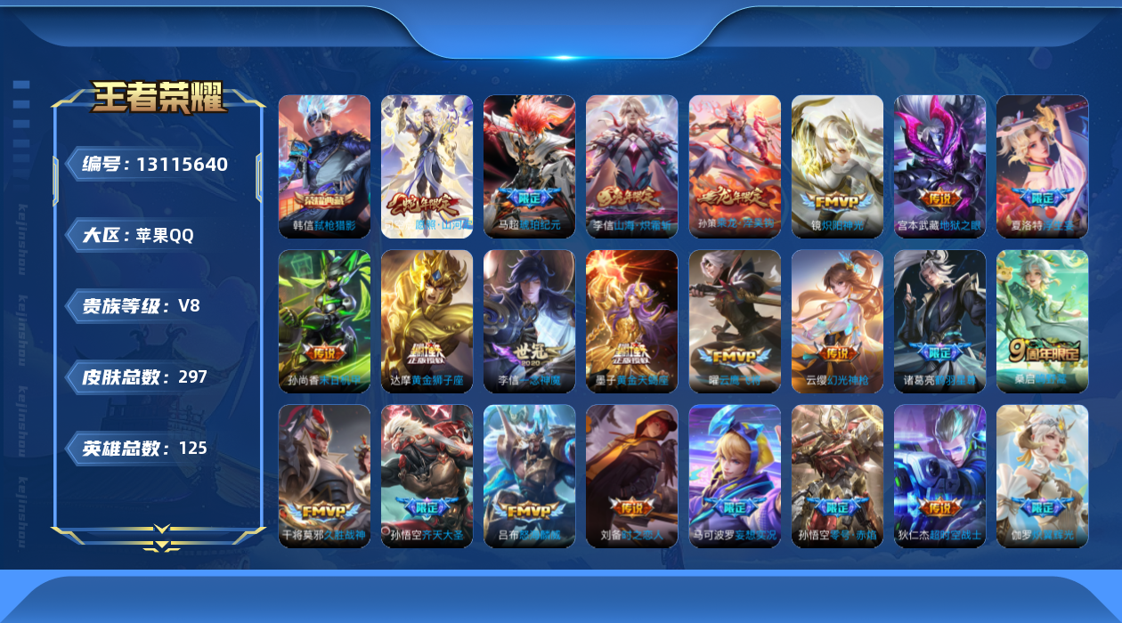 [13115640]苹果Q-V8-最强王者段位-125英雄-297皮肤-1典藏-0珍品无双-0无双-0珍品传说-31传说-86史诗