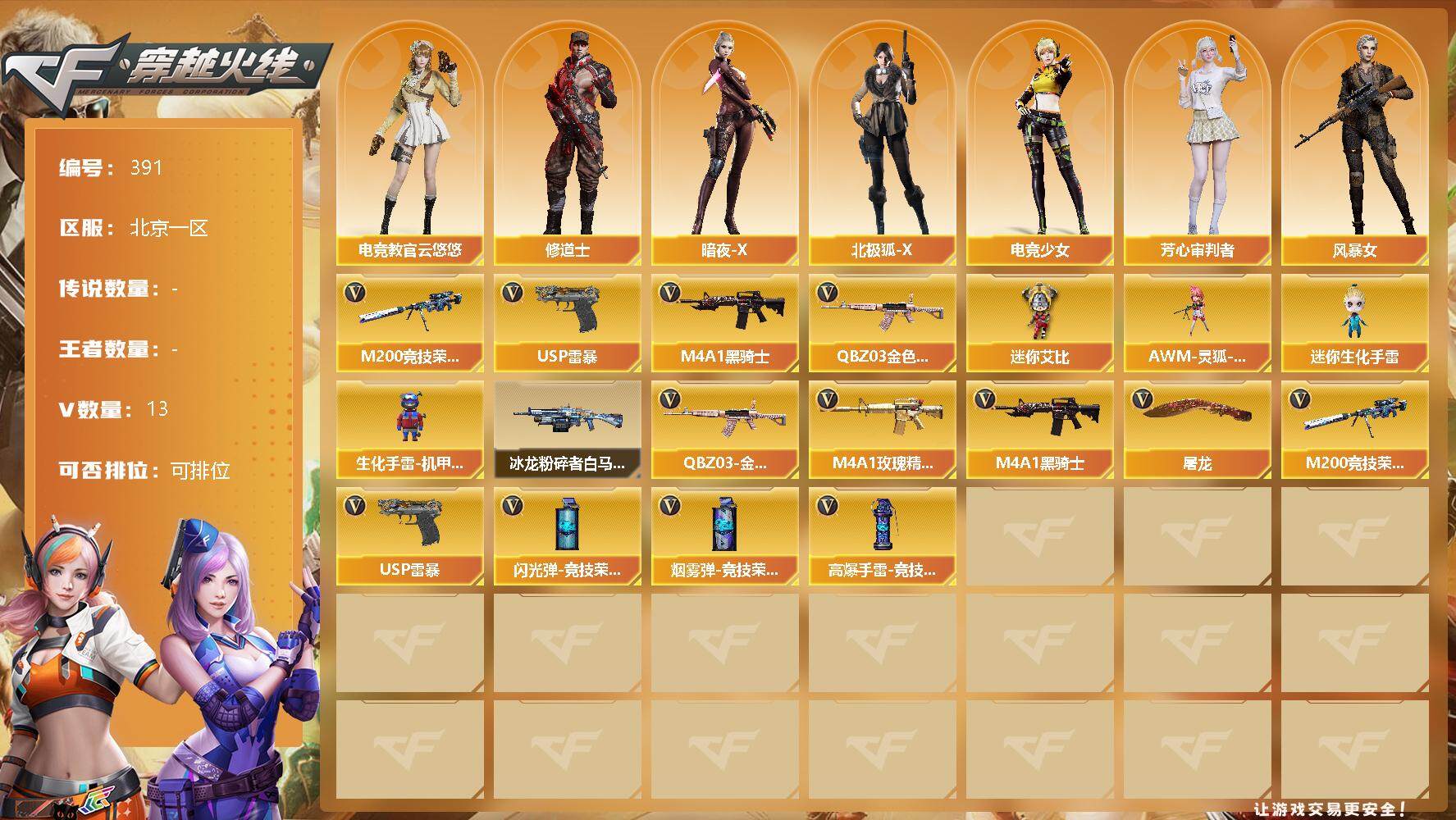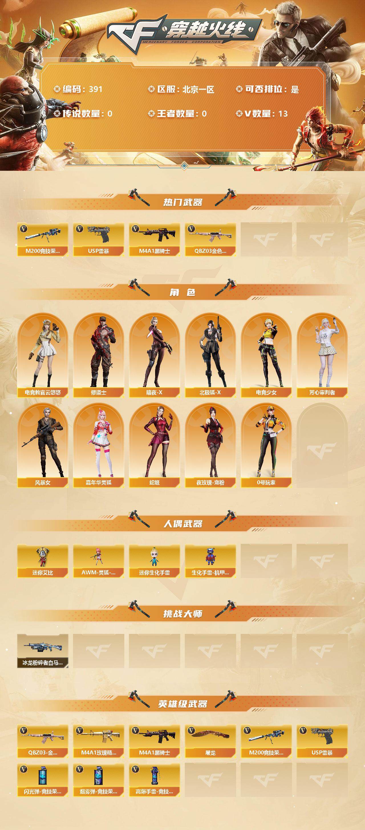 [13115625]北京一区-13V-0王者-0炫金 【热门武器】:QBZ03-金色蔷薇,M200-竞技荣光,M4A1-黑骑士,USP-雷暴 【角色】:电竞教官-云悠悠,修道士,暗夜-X,北极狐-X,电竞少女,芳心审判者,风暴女,嘉年华灵狐,0号玩家,蛇姬,夜玫瑰-宠粉 【人偶武器】:AWM-灵狐-15周年嘉年华,迷你艾比,迷你生化手雷,生化手雷-机甲核心*2 【挑战大师】:冰龙粉碎者-白马银枪 【英雄级武器】:M4A1-黑骑士,M4A1-玫瑰精灵,QBZ03-金色蔷薇,M200-竞技荣光,USP-雷暴,屠龙,高爆手雷-竞技荣光*2,闪光弹-竞技荣光*2,烟雾弹-竞技荣光*2 【特殊枪械】:1黑骑士