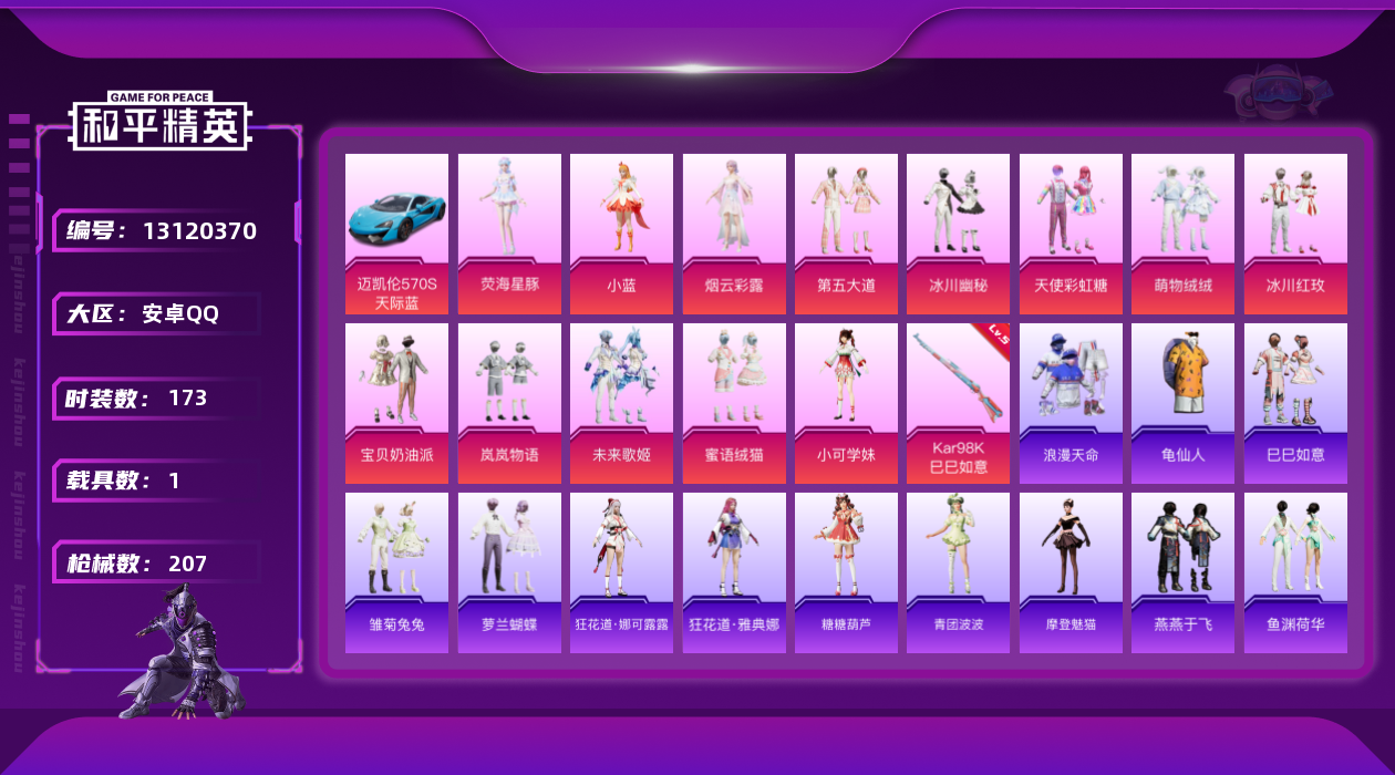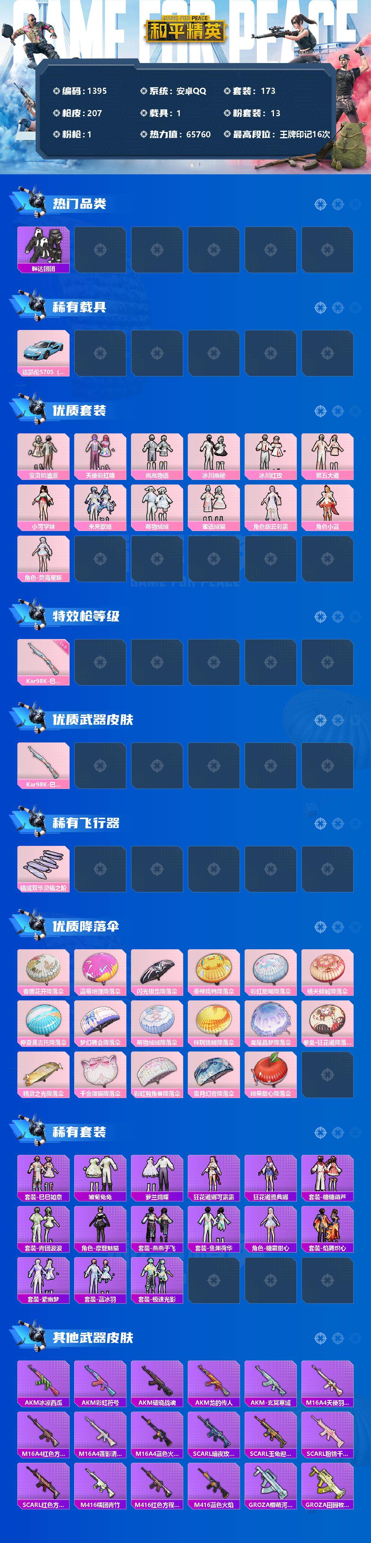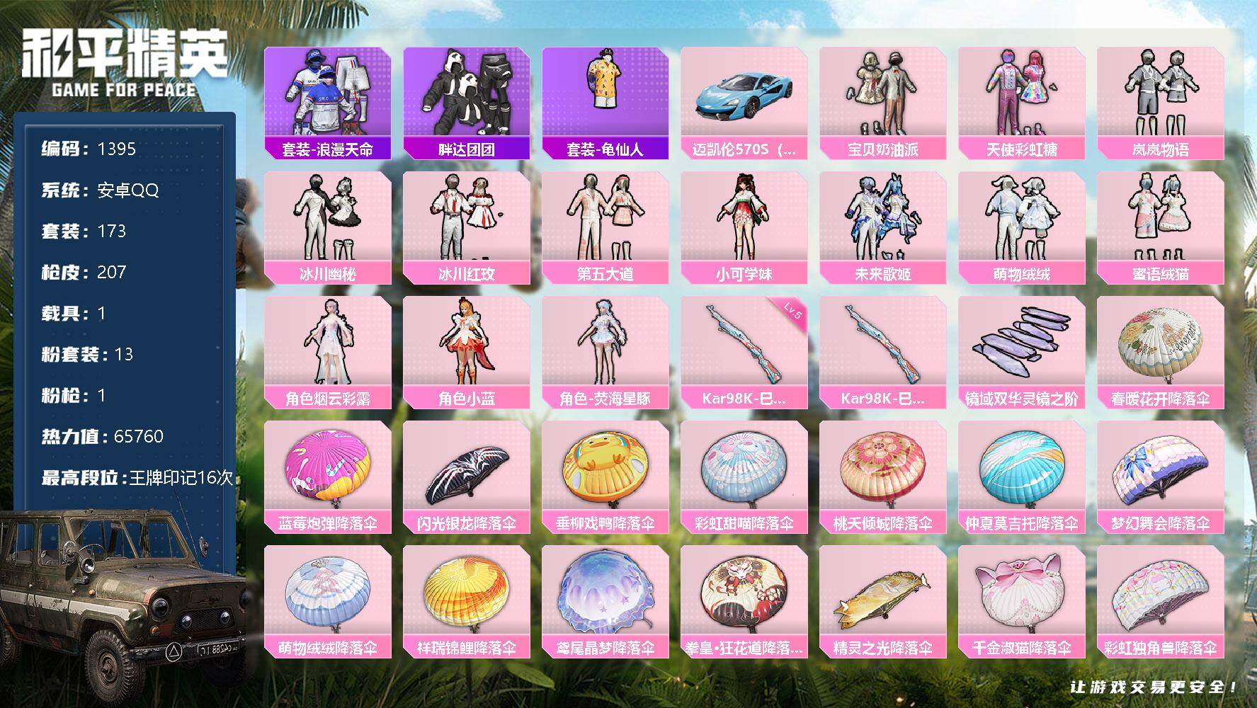 [13120370]安卓 手Q-13粉装-1特效枪-1载具-1粉色飞行器-65760热力值-16王牌印记-173套装-207枪皮 【热门品类】:套装-浪漫天命,套装-胖达团团,套装-龟仙人 【粉色载具】:迈凯伦570S(天际蓝) 【粉色套装】:粉装-宝贝奶油派,粉装-天使彩虹糖,粉装-岚岚物语,粉装-冰川幽秘,粉装-冰川红玫,粉装-第五大道,角色-小可学妹,粉装-未来歌姬,粉装-萌物绒绒,粉装-蜜语绒猫,角色-烟云彩露,角色-小蓝,角色-荧海星豚 【粉色枪皮等级】:Kar98K-巳巳如意(五级) 【粉色枪皮】:Kar98K-巳巳如意 【粉色飞行器】:镜域双华-灵镜之阶 【粉色降落伞】:春暖花开降落伞,蓝莓炮弹降落伞,闪光银龙降落伞,垂柳戏鸭降落伞,彩虹甜喵降落伞,桃夭倾城降落伞,仲夏莫吉托降落伞,梦幻舞会降落伞,萌物绒绒降落伞,祥瑞锦鲤降落伞,鸢尾晶梦降落伞,拳皇·狂花道降落伞,精灵之光降落伞,千金淑猫降落伞,彩虹独角兽降落伞,雪月幻音降落伞,绯果甜心降落伞 【稀有套装】:套装-龟仙人,套装-巳巳如意,套装-雏菊兔兔,套装-萝兰蝴蝶,角色-狂花道·娜可露露,角色-狂花道·雅典娜,套装-糖糖葫芦,套装-青团波波,角色-摩登魅猫,套装-燕燕于飞,套装-鱼渊荷华,角色-糖霜甜心,套装-焰舞炽心,套装-紫幽梦,套装-蓝冰羽,套装-极速光影 【稀有枪皮】:AKM-冰凉西瓜,AKM-彩虹符号,AKM-破晓战魂,AKM-龙的传人,AKM-玄冥寒域,M16A4-天使羽翼,M16A4-红色方程式,M16A4-莲影清波,M16A4-蓝色火焰,SCAR-L-暗夜玫瑰,SCAR-L-玉兔迎春,SCAR-L-粉锦千层,SCAR-L-红色方程式,M416-糯团青竹,M416-红色方程式,M416-蓝色火焰,GROZA-懵萌河马,GROZA-田园牧歌,GROZA-蓝莓炮弹,AUG-天降萌叽,AUG-耀粉歌者,AUG-闲梦青缨,QBZ-未来歌姬,M762-天降萌叽,M762-彩虹符号,M762-暖熊萌萌,M762-瑞龙福将,M762-甜心宝贝,M762-第五大道,M762-萌物绒绒,M762-镭射皇者,Mk47-妙红点点,G36C-懵萌河马,AC-VAL-彩虹甜喵,AC-VAL-快闪甜心,AC-VAL-闲梦青缨,蜜獾-天降萌叽,蜜獾-娇憨猪猪,UZI-天降萌叽,UZI-娇憨猪猪,UZI-红色方程式,UZI-金风玉露