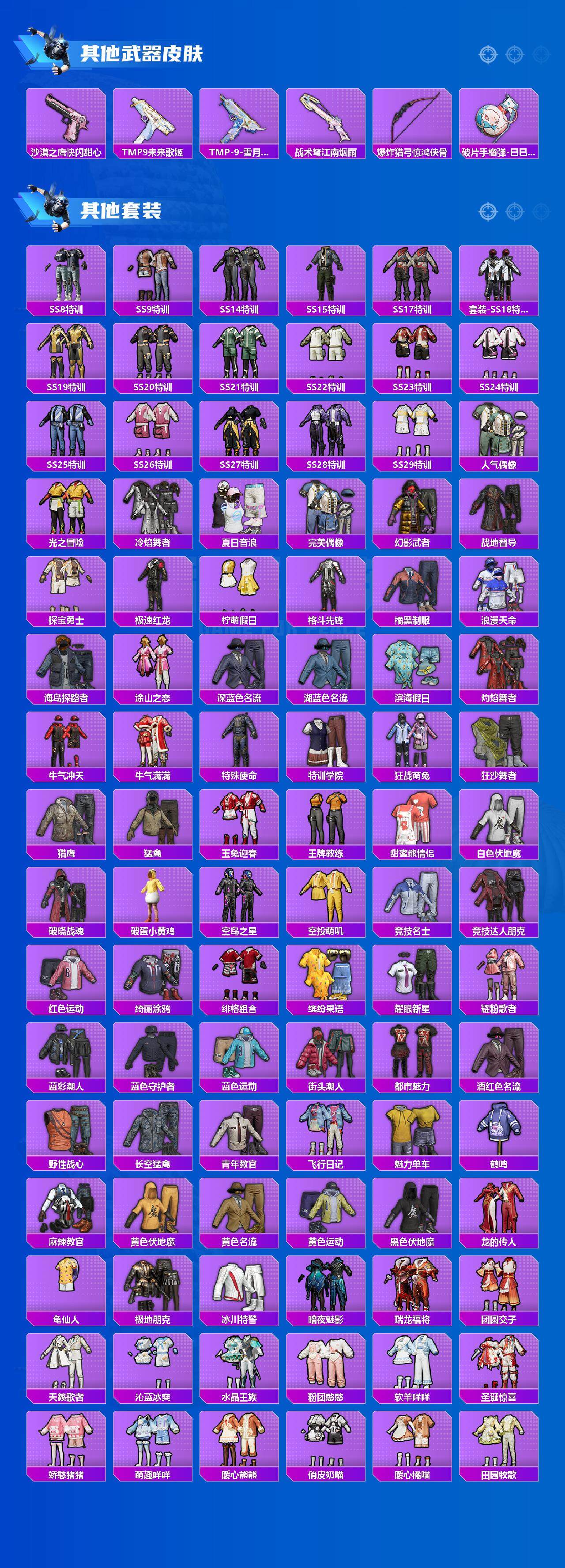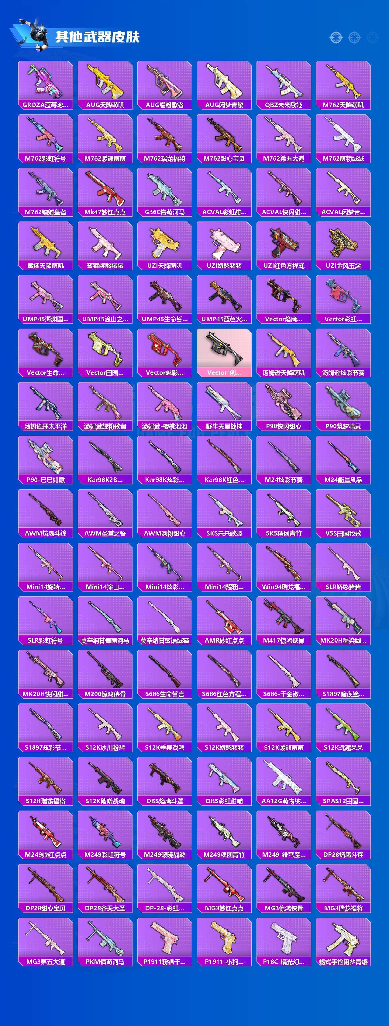 【稀有枪皮】:AKM-冰凉西瓜,AKM-彩虹符号,AKM-破晓战魂,AKM-龙的传人,AKM-玄冥寒域,M16A4-天使羽翼,M16A4-红色方程式,M16A4-莲影清波,M16A4-蓝色火焰,SCAR-L-暗夜玫瑰,SCAR-L-玉兔迎春,SCAR-L-粉锦千层,SCAR-L-红色方程式,M416-糯团青竹,M416-红色方程式,M416-蓝色火焰,GROZA-懵萌河马,GROZA-田园牧歌,GROZA-蓝莓炮弹,AUG-天降萌叽,AUG-耀粉歌者,AUG-闲梦青缨,QBZ-未来歌姬,M762-天降萌叽,M762-彩虹符号,M762-暖熊萌萌,M762-瑞龙福将,M762-甜心宝贝,M762-第五大道,M762-萌物绒绒,M762-镭射皇者,Mk47-妙红点点,G36C-懵萌河马,AC-VAL-彩虹甜喵,AC-VAL-快闪甜心,AC-VAL-闲梦青缨,蜜獾-天降萌叽,蜜獾-娇憨猪猪,UZI-天降萌叽,UZI-娇憨猪猪,UZI-红色方程式,UZI-金风玉露