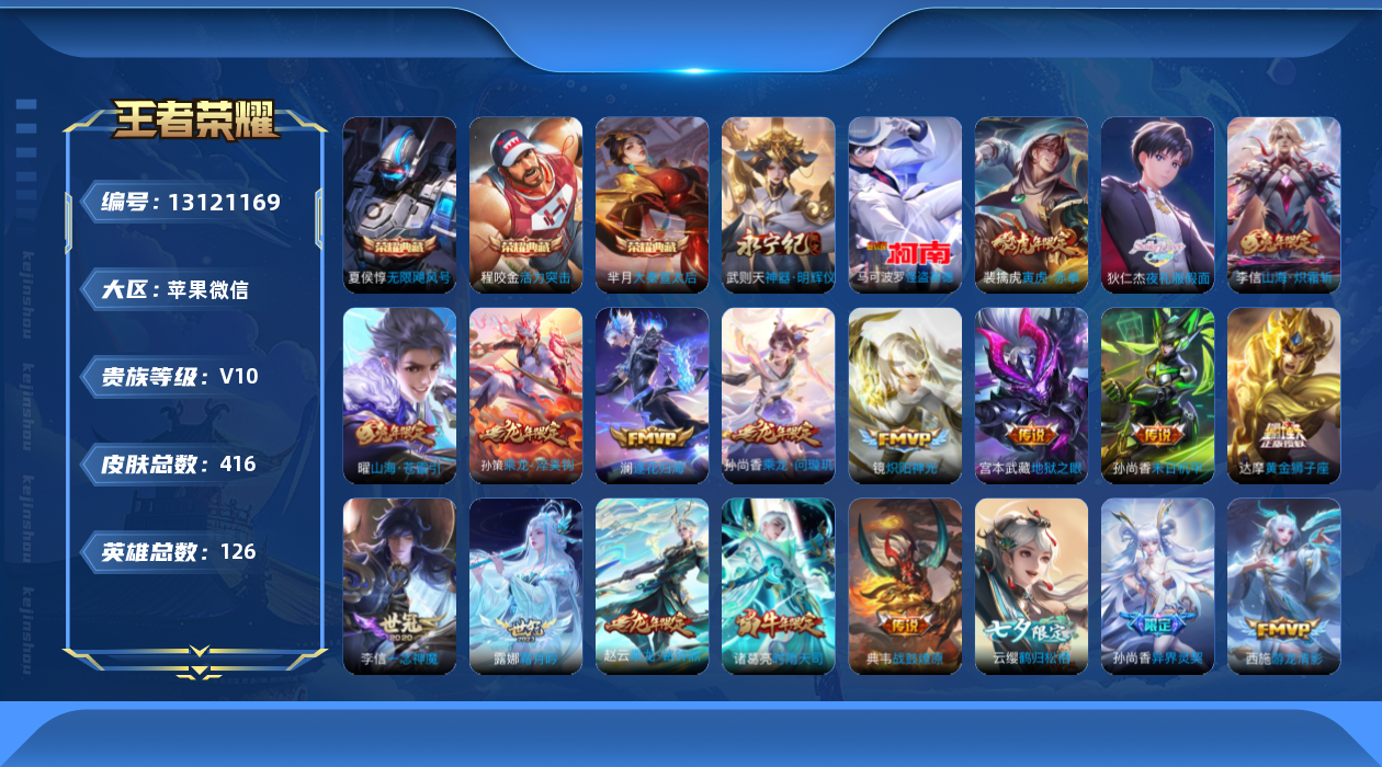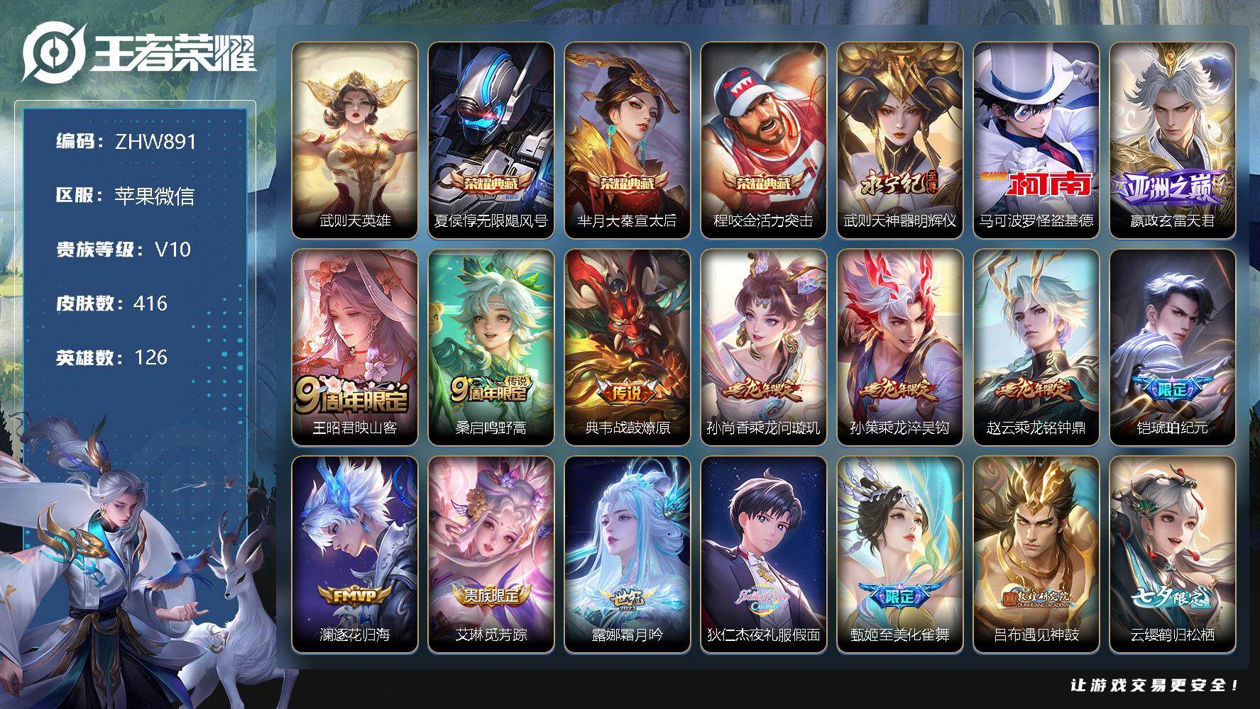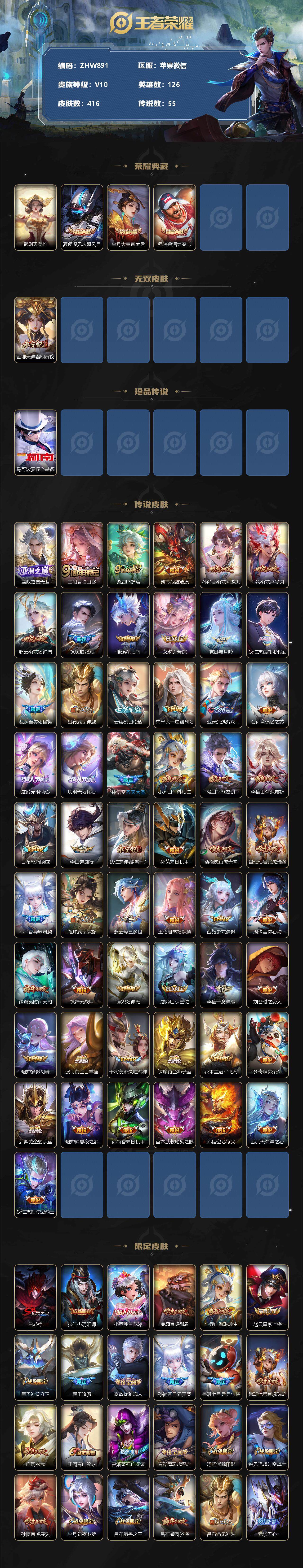 [13121169]苹果WX-V10-126英雄-416皮肤-3典藏-1无双-1珍品传说-55传说-138史诗
