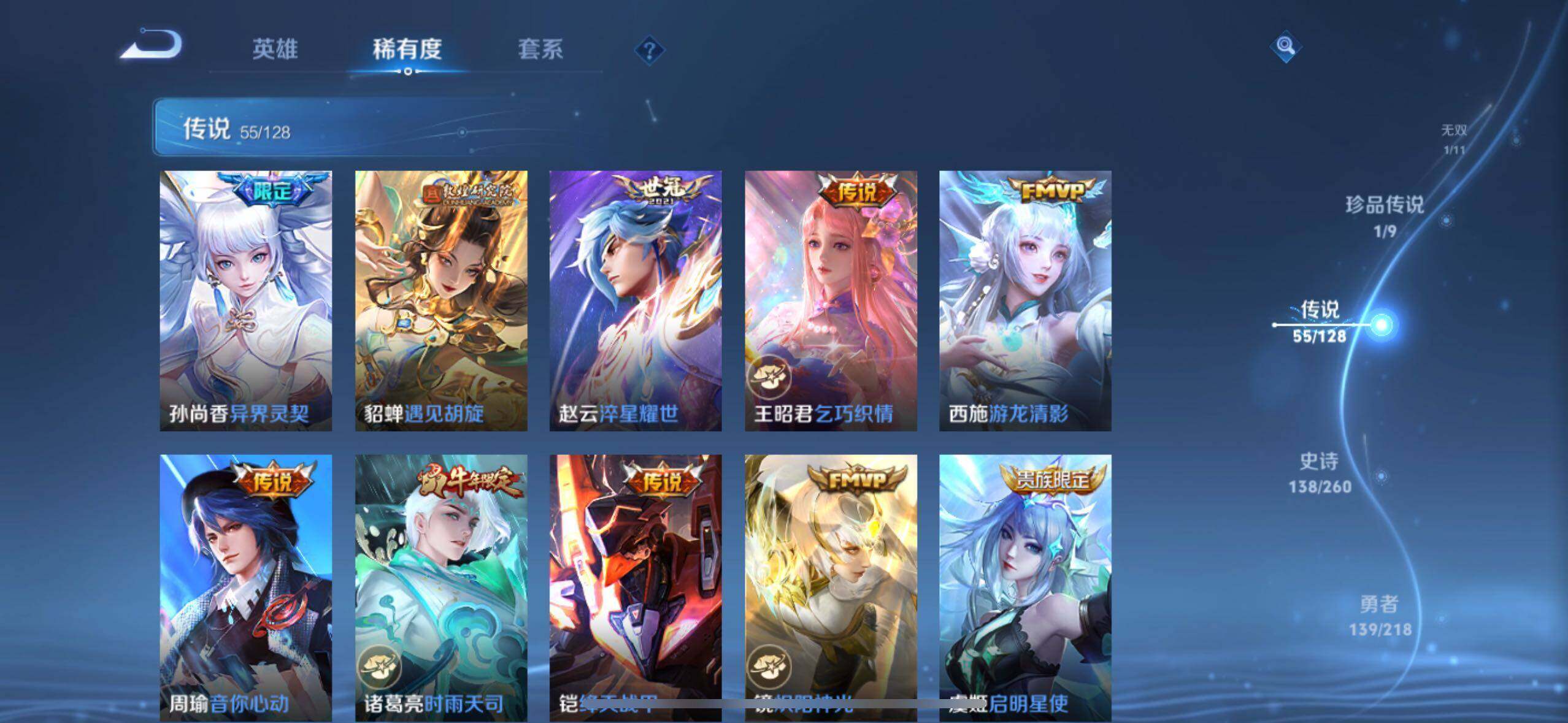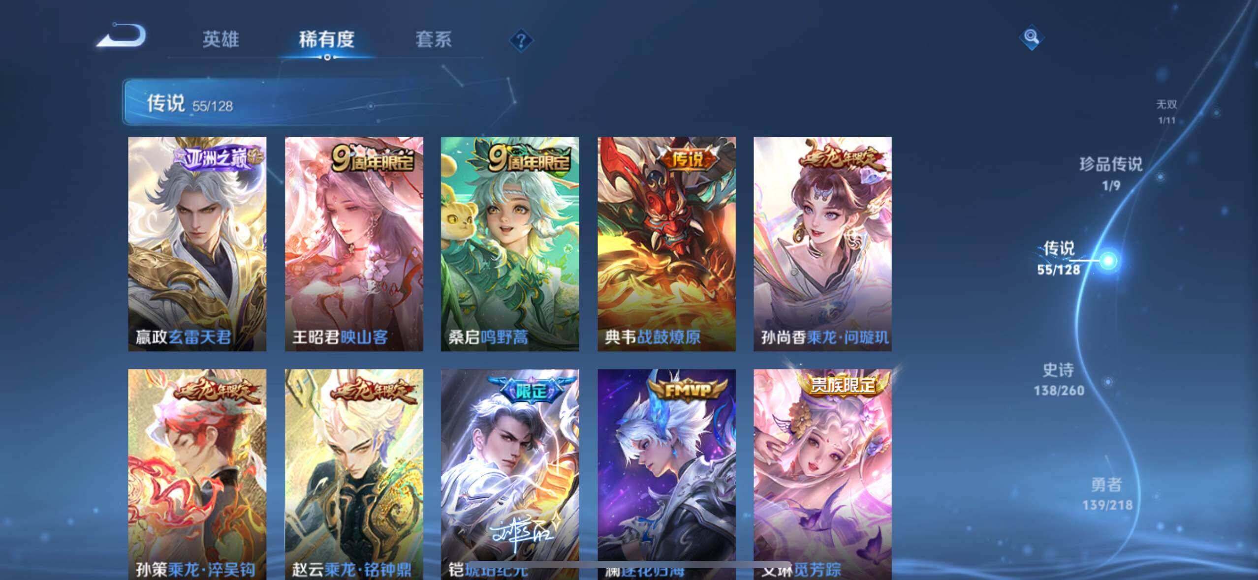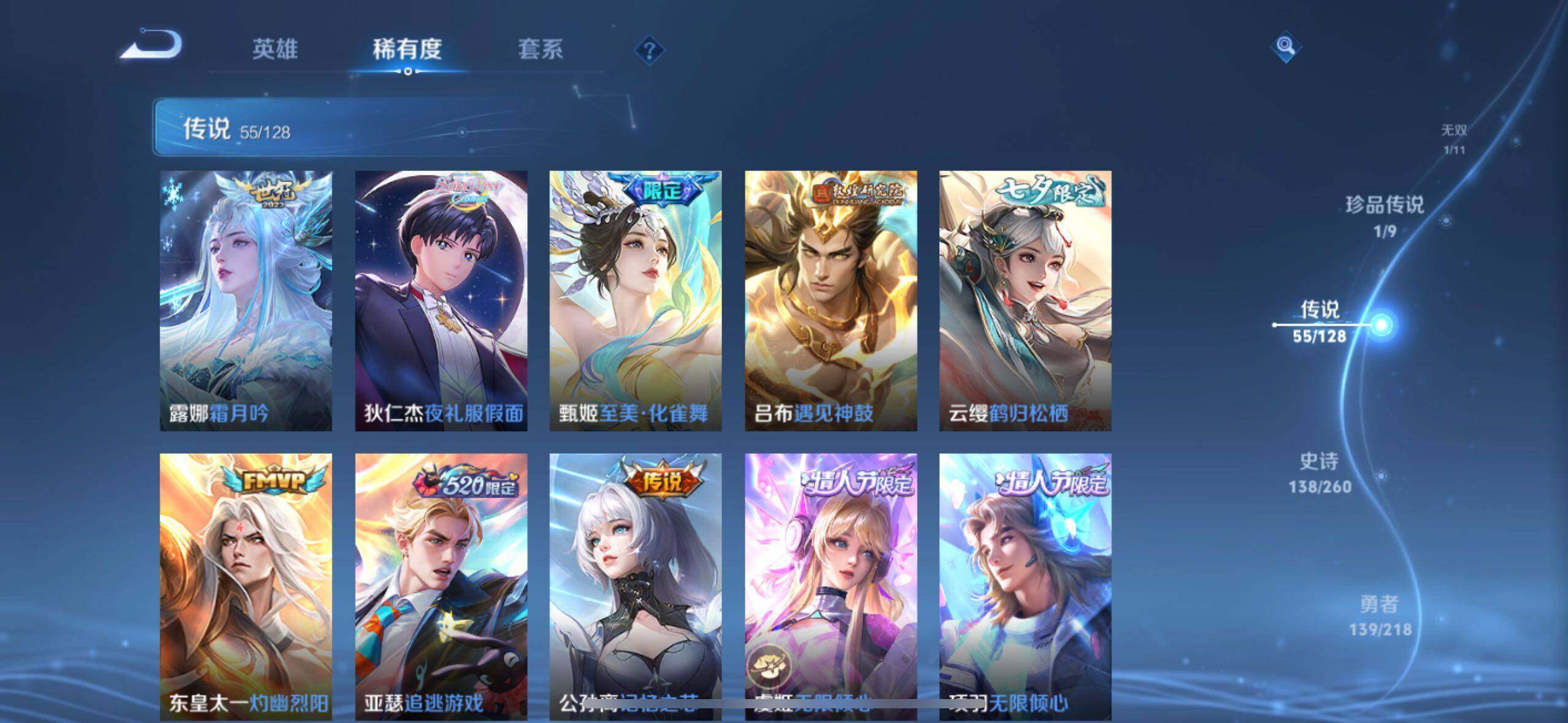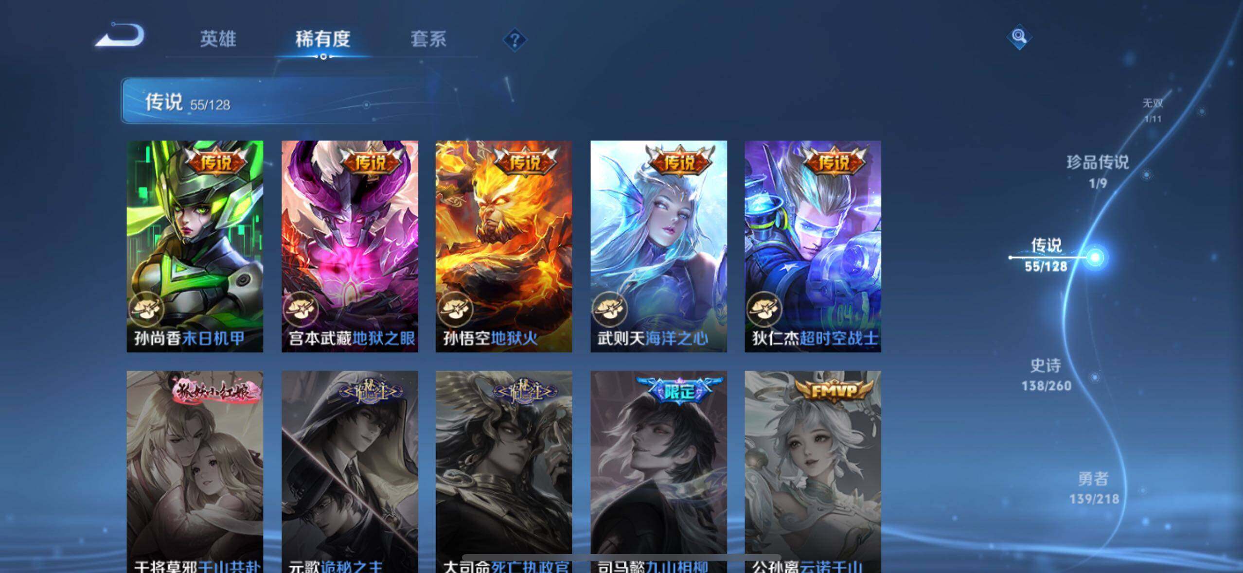【传说皮肤】:嬴政玄雷天君,王昭君映山客,桑启鸣野蒿,典韦战鼓燎原,孙尚香乘龙问璇玑,孙策乘龙淬吴钩,赵云乘龙铭钟鼎,铠琥珀纪元,澜逐花归海,艾琳觅芳踪,露娜霜月吟,狄仁杰夜礼服假面,甄姬至美化雀舞,吕布遇见神鼓,云缨鹤归松栖,东皇太一灼幽烈阳,亚瑟追逃游戏,公孙离记忆之芯,虞姬无限倾心,项羽无限倾心,孙悟空齐天大圣,小乔山海琳琅生,曜山海苍雷引,李信山海炽霜斩,吕布怒海麟威,李白诗剑行,狄仁杰神器狴犴令,孙策末日机甲,裴擒虎寅虎赤拳,鲁班七号寅虎瑞焰,孙尚香异界灵契,貂蝉遇见胡旋,赵云淬星耀世,王昭君乞巧织情,西施游龙清影,周瑜音你心动,诸葛亮时雨天司,铠绛天战甲,镜炽阳神光,虞姬启明星使,李信一念神魔,刘备时之恋人,貂蝉猫影幻舞,张良黄金白羊座,干将莫邪久胜战神,达摩黄金狮子座,花木兰冠军飞将,梦奇胖达荣荣,后羿黄金射手座,貂蝉仲夏夜之梦,孙尚香末日机甲,宫本武藏地狱之眼,孙悟空地狱火,武则天海洋之心,狄仁杰超时空战士