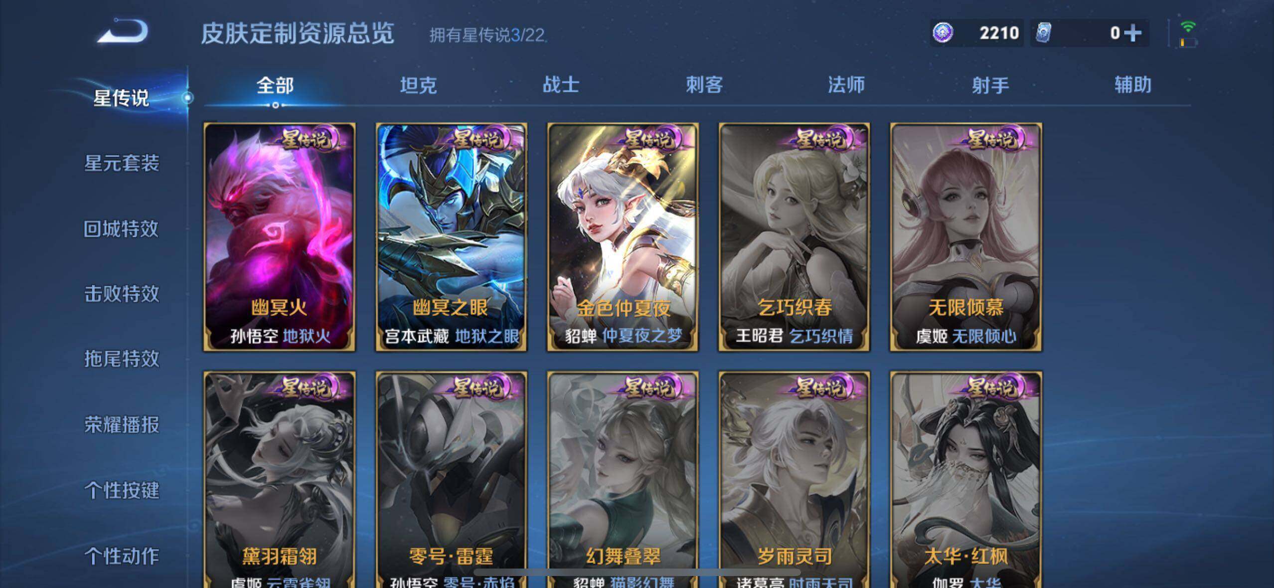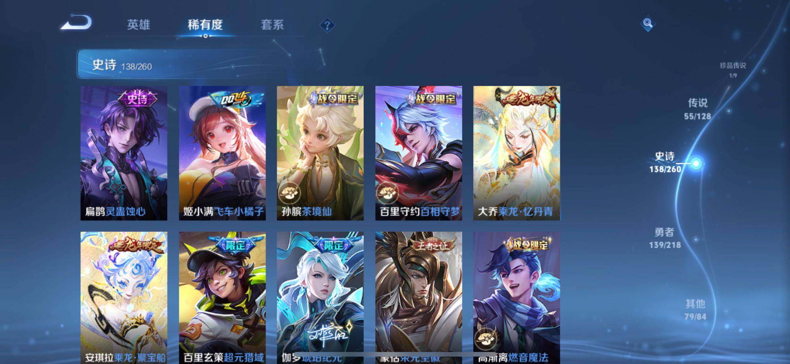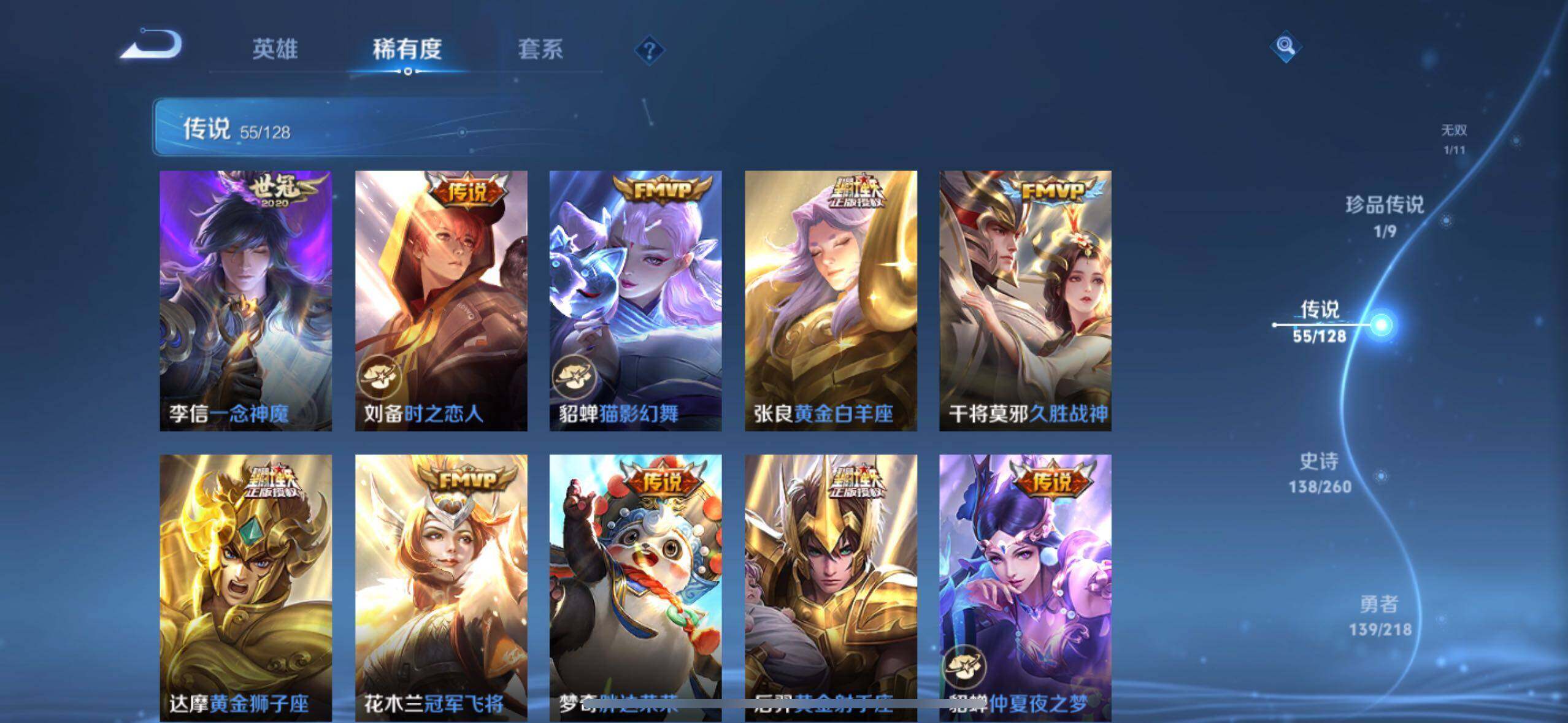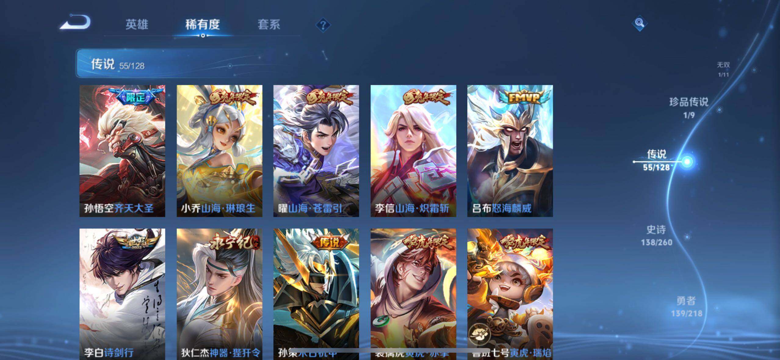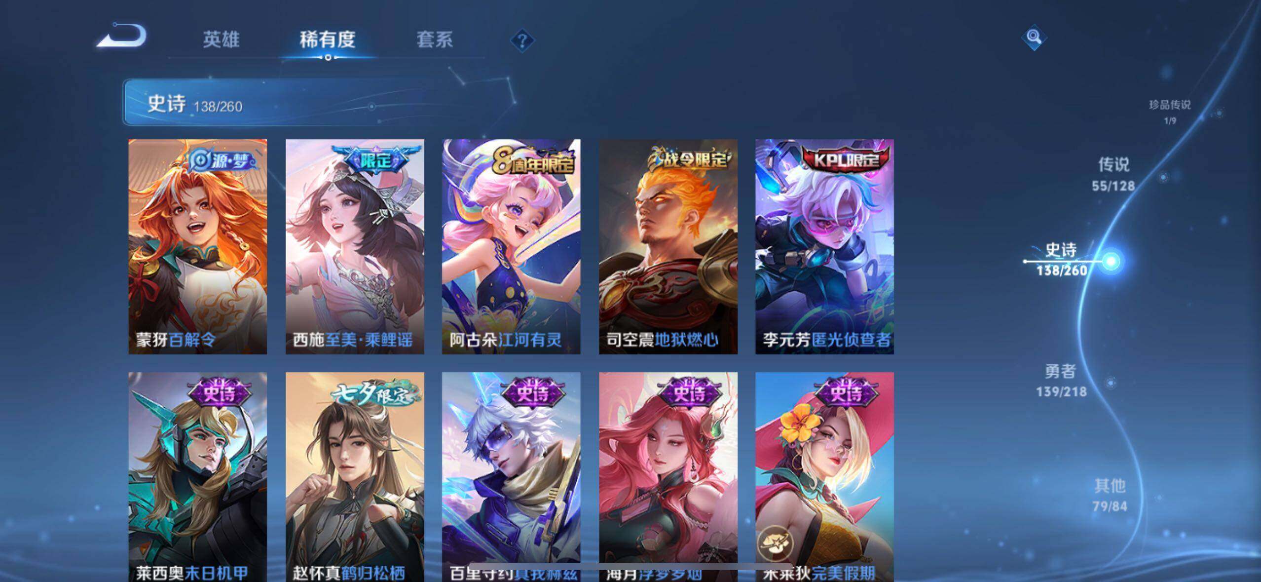 【传说皮肤】:嬴政玄雷天君,王昭君映山客,桑启鸣野蒿,典韦战鼓燎原,孙尚香乘龙问璇玑,孙策乘龙淬吴钩,赵云乘龙铭钟鼎,铠琥珀纪元,澜逐花归海,艾琳觅芳踪,露娜霜月吟,狄仁杰夜礼服假面,甄姬至美化雀舞,吕布遇见神鼓,云缨鹤归松栖,东皇太一灼幽烈阳,亚瑟追逃游戏,公孙离记忆之芯,虞姬无限倾心,项羽无限倾心,孙悟空齐天大圣,小乔山海琳琅生,曜山海苍雷引,李信山海炽霜斩,吕布怒海麟威,李白诗剑行,狄仁杰神器狴犴令,孙策末日机甲,裴擒虎寅虎赤拳,鲁班七号寅虎瑞焰,孙尚香异界灵契,貂蝉遇见胡旋,赵云淬星耀世,王昭君乞巧织情,西施游龙清影,周瑜音你心动,诸葛亮时雨天司,铠绛天战甲,镜炽阳神光,虞姬启明星使,李信一念神魔,刘备时之恋人,貂蝉猫影幻舞,张良黄金白羊座,干将莫邪久胜战神,达摩黄金狮子座,花木兰冠军飞将,梦奇胖达荣荣,后羿黄金射手座,貂蝉仲夏夜之梦,孙尚香末日机甲,宫本武藏地狱之眼,孙悟空地狱火,武则天海洋之心,狄仁杰超时空战士