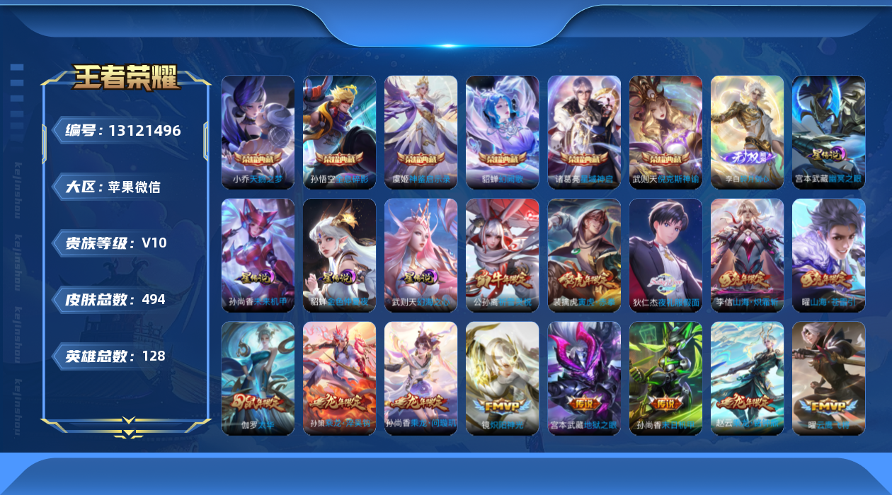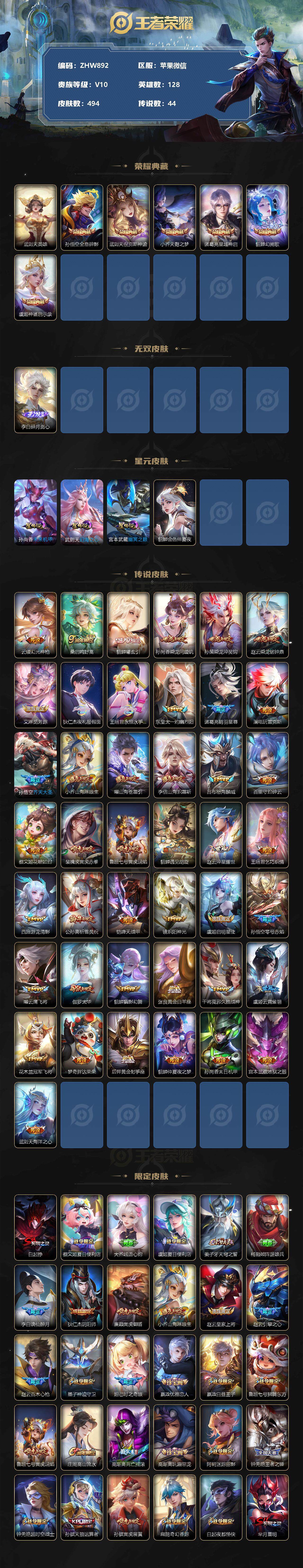 [13121496]苹果WX-V10-128英雄-494皮肤-7水+1小兵-44传说-167史诗-4星元