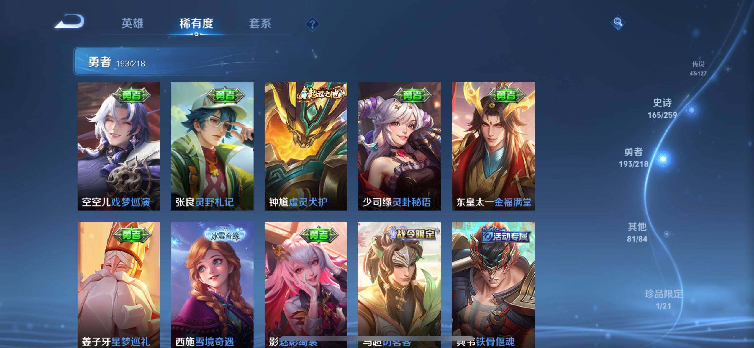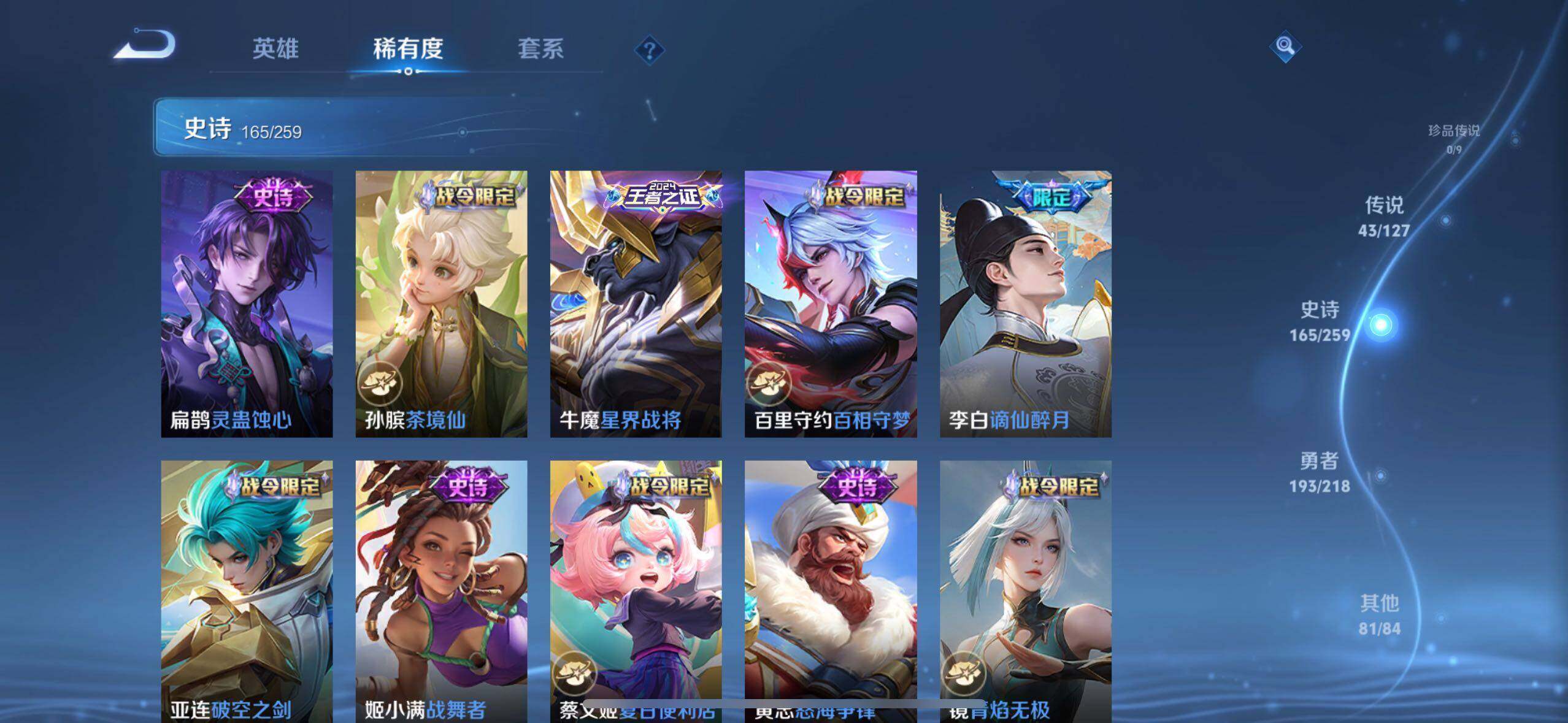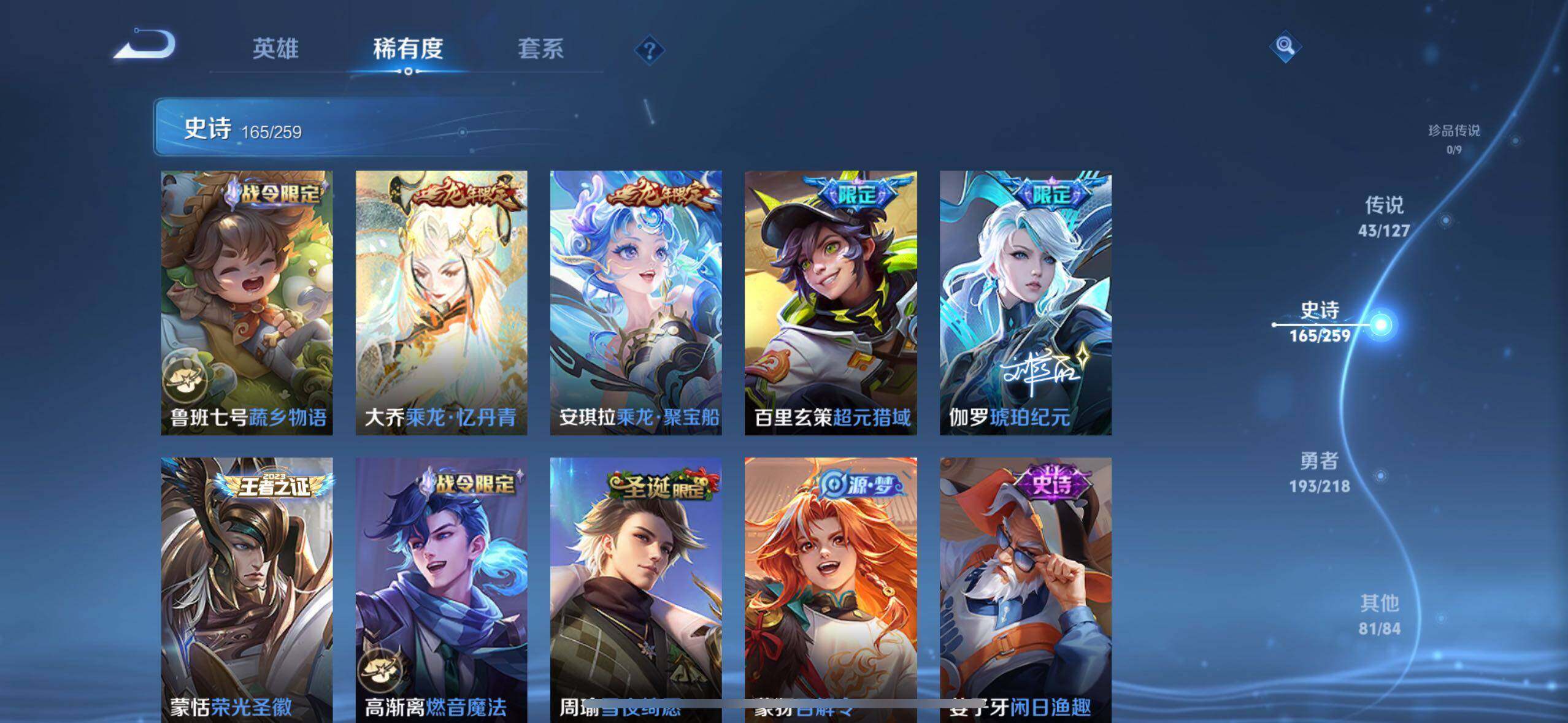 白起狰,太乙真人饕餮,曹操烛龙,芈月重明,典韦穷奇,狂铁御狮,米莱狄御霄,牛魔御旌,盾山御銮,夏侯惇朔风刀,明世隐疑决卦,老夫子醍醐杖,鬼谷子原初探秘者,狄仁杰万华元夜,程咬金演武夺筹,钟馗驱傩正仪,苏烈千军破阵,吕布猎兽之王,嬴政白昼王子,女娲朔望之晖,典韦蓝屏警告,钟馗神迹守卫,鲁班七号狮舞东方,沈梦溪星空之诺,李元芳银河之约,刘邦夺宝奇兵,马可波罗暗影游猎,蒙犽狂想玩偶喵,元歌云间偶戏,弈星混沌棋,达摩沙漠行僧,兰陵王金庭之子,沈梦溪大漠名商,李元芳云中旅人,桑启海盐诗旅,裴擒虎擒涛扼浪,鲁班大师探海日志,张良古海寻踪,项羽苍威无极,镜青焰无极