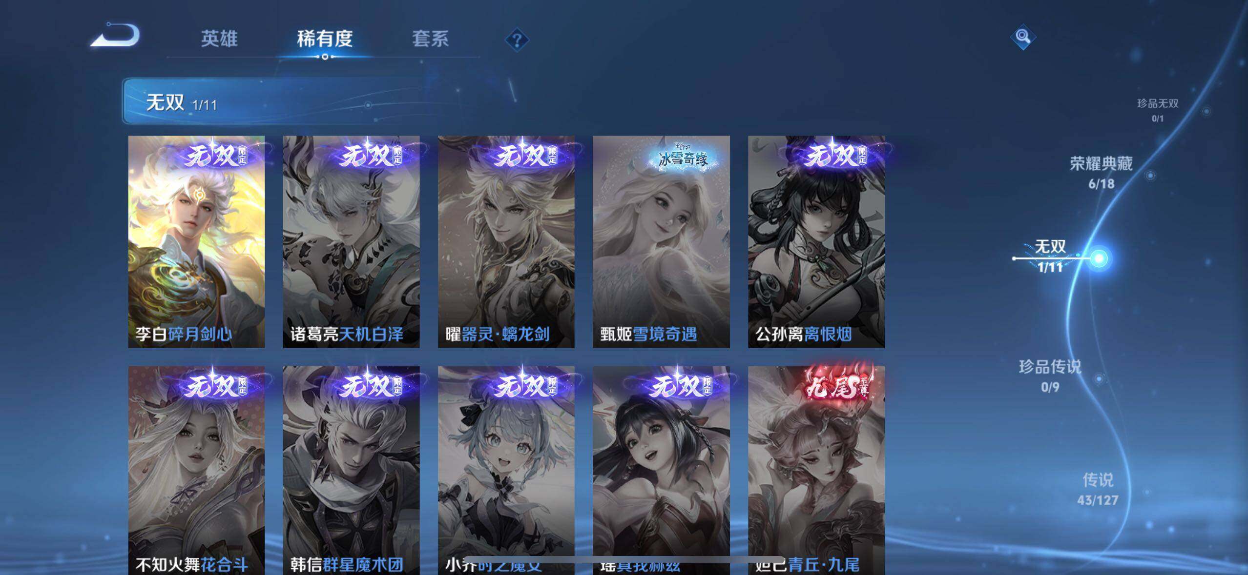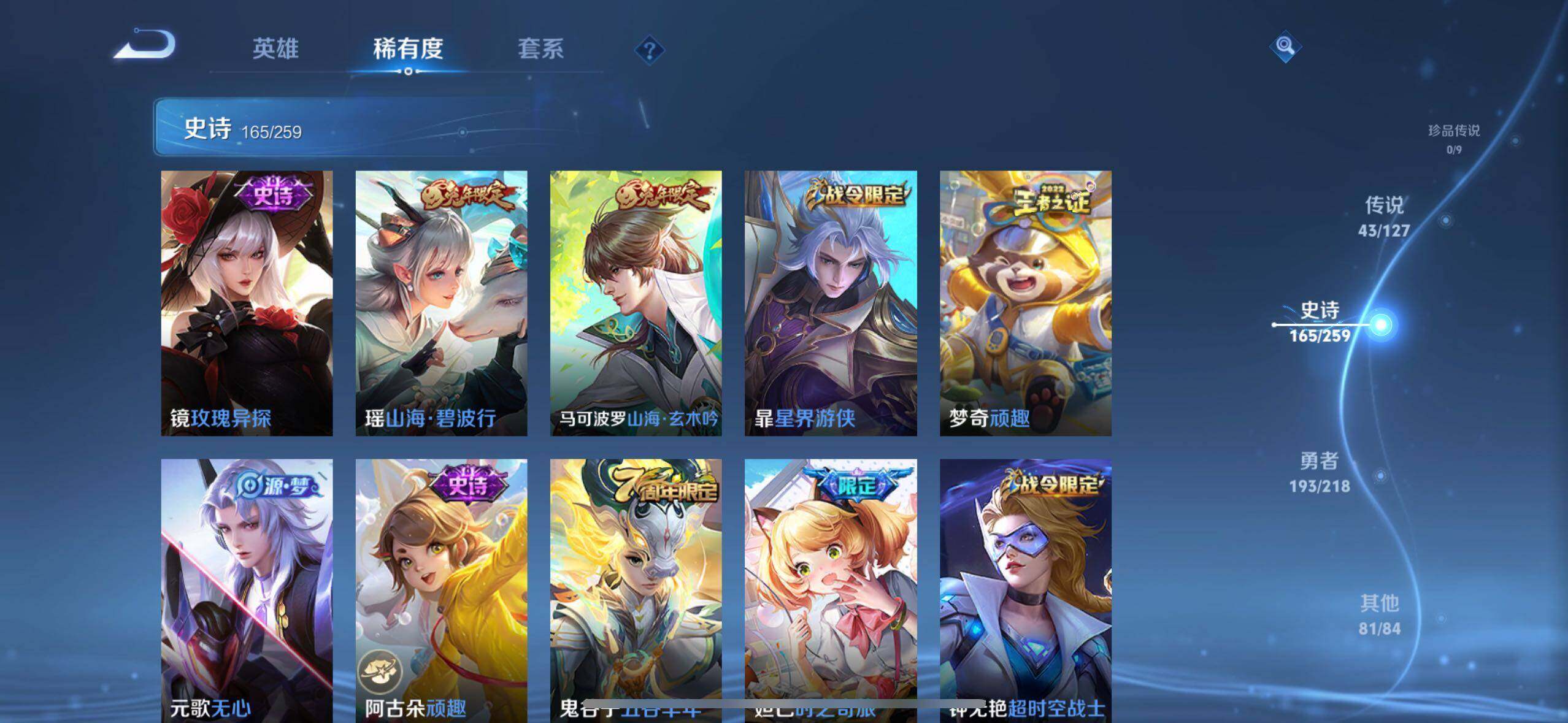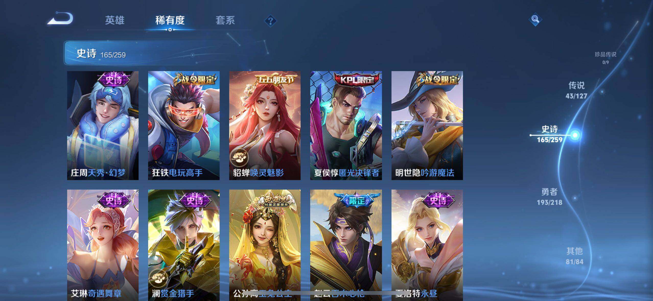 白起狰,太乙真人饕餮,曹操烛龙,芈月重明,典韦穷奇,狂铁御狮,米莱狄御霄,牛魔御旌,盾山御銮,夏侯惇朔风刀,明世隐疑决卦,老夫子醍醐杖,鬼谷子原初探秘者,狄仁杰万华元夜,程咬金演武夺筹,钟馗驱傩正仪,苏烈千军破阵,吕布猎兽之王,嬴政白昼王子,女娲朔望之晖,典韦蓝屏警告,钟馗神迹守卫,鲁班七号狮舞东方,沈梦溪星空之诺,李元芳银河之约,刘邦夺宝奇兵,马可波罗暗影游猎,蒙犽狂想玩偶喵,元歌云间偶戏,弈星混沌棋,达摩沙漠行僧,兰陵王金庭之子,沈梦溪大漠名商,李元芳云中旅人,桑启海盐诗旅,裴擒虎擒涛扼浪,鲁班大师探海日志,张良古海寻踪,项羽苍威无极,镜青焰无极