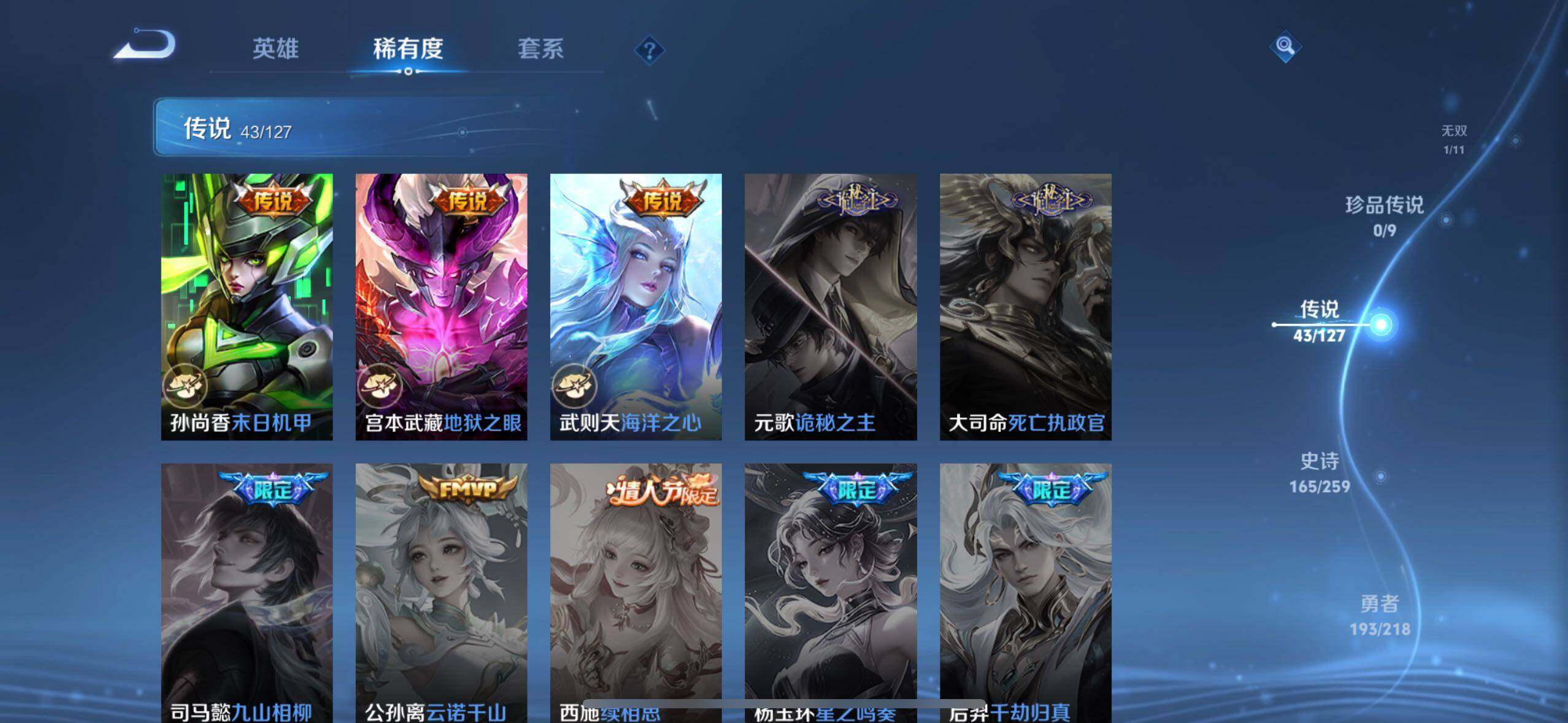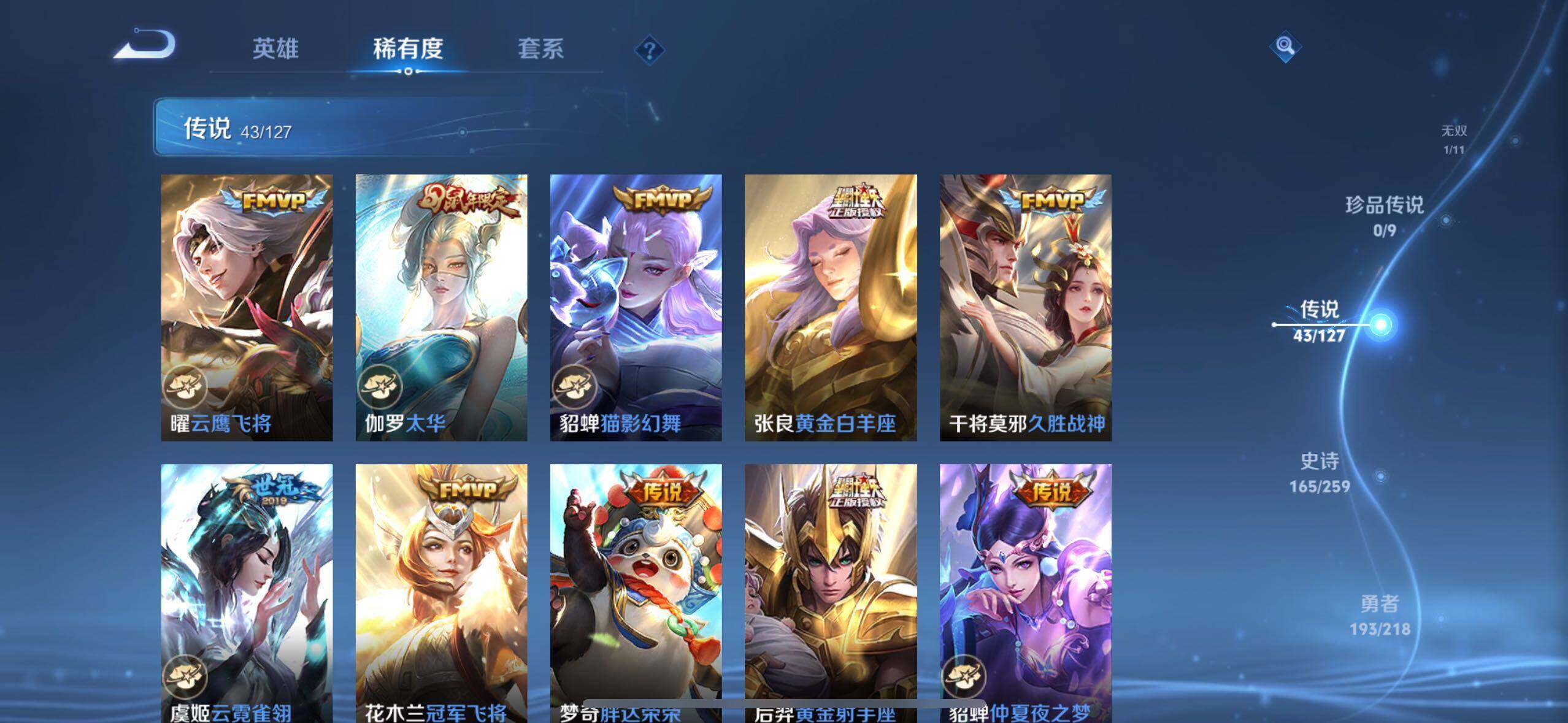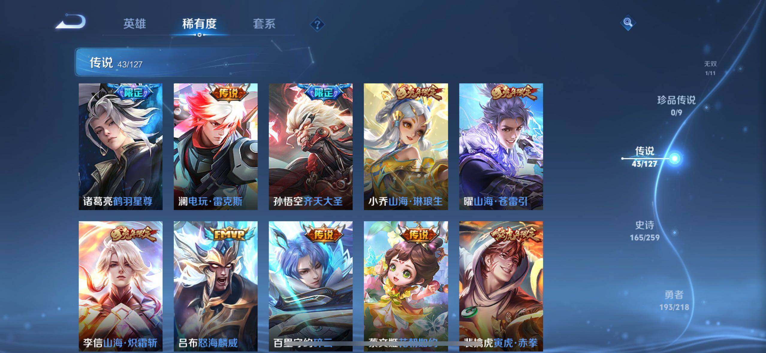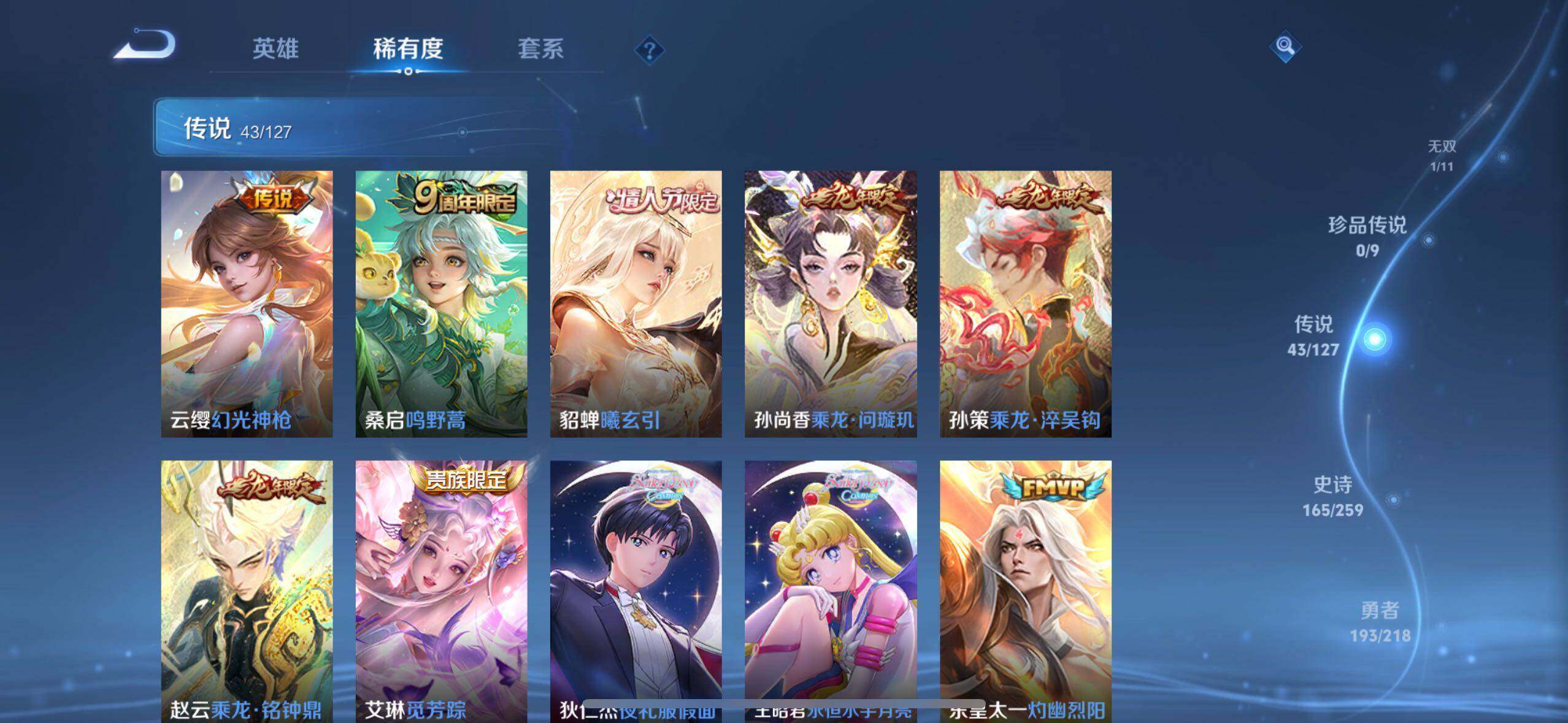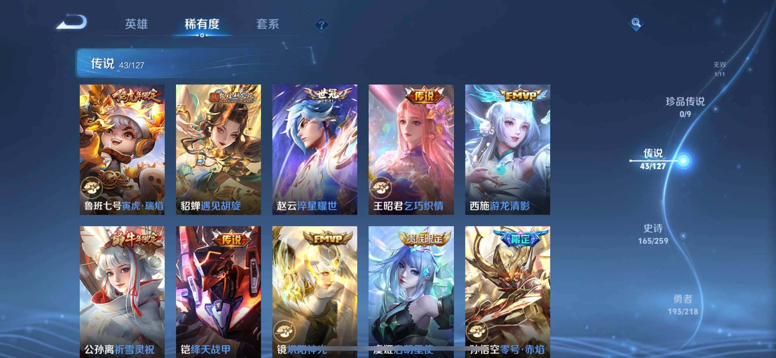 【传说皮肤】:后羿神树通天,云缨幻光神枪,桑启鸣野蒿,貂蝉曦玄引,孙尚香乘龙问璇玑,孙策乘龙淬吴钩,赵云乘龙铭钟鼎,艾琳觅芳踪,狄仁杰夜礼服假面,王昭君永恒水手月亮,东皇太一灼幽烈阳,诸葛亮鹤羽星尊,澜电玩雷克斯,孙悟空齐天大圣,小乔山海琳琅生,曜山海苍雷引,李信山海炽霜斩,吕布怒海麟威,百里守约碎云,蔡文姬花朝如约,裴擒虎寅虎赤拳,鲁班七号寅虎瑞焰,貂蝉遇见胡旋,赵云淬星耀世,王昭君乞巧织情,西施游龙清影,公孙离祈雪灵祝,铠绛天战甲,镜炽阳神光,虞姬启明星使,孙悟空零号赤焰,曜云鹰飞将,伽罗太华,貂蝉猫影幻舞,张良黄金白羊座,干将莫邪久胜战神,虞姬云霓雀翎,花木兰冠军飞将,梦奇胖达荣荣,后羿黄金射手座,貂蝉仲夏夜之梦,孙尚香末日机甲,宫本武藏地狱之眼,武则天海洋之心