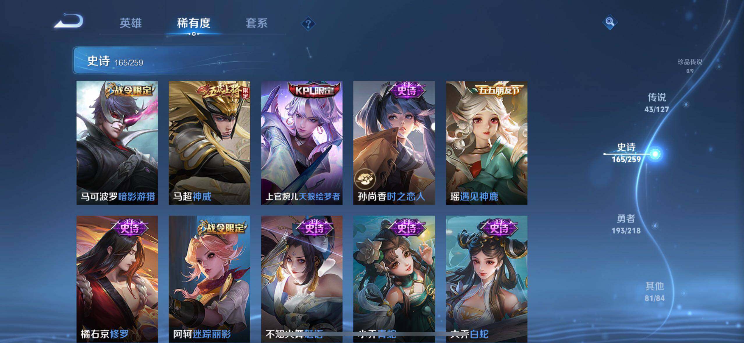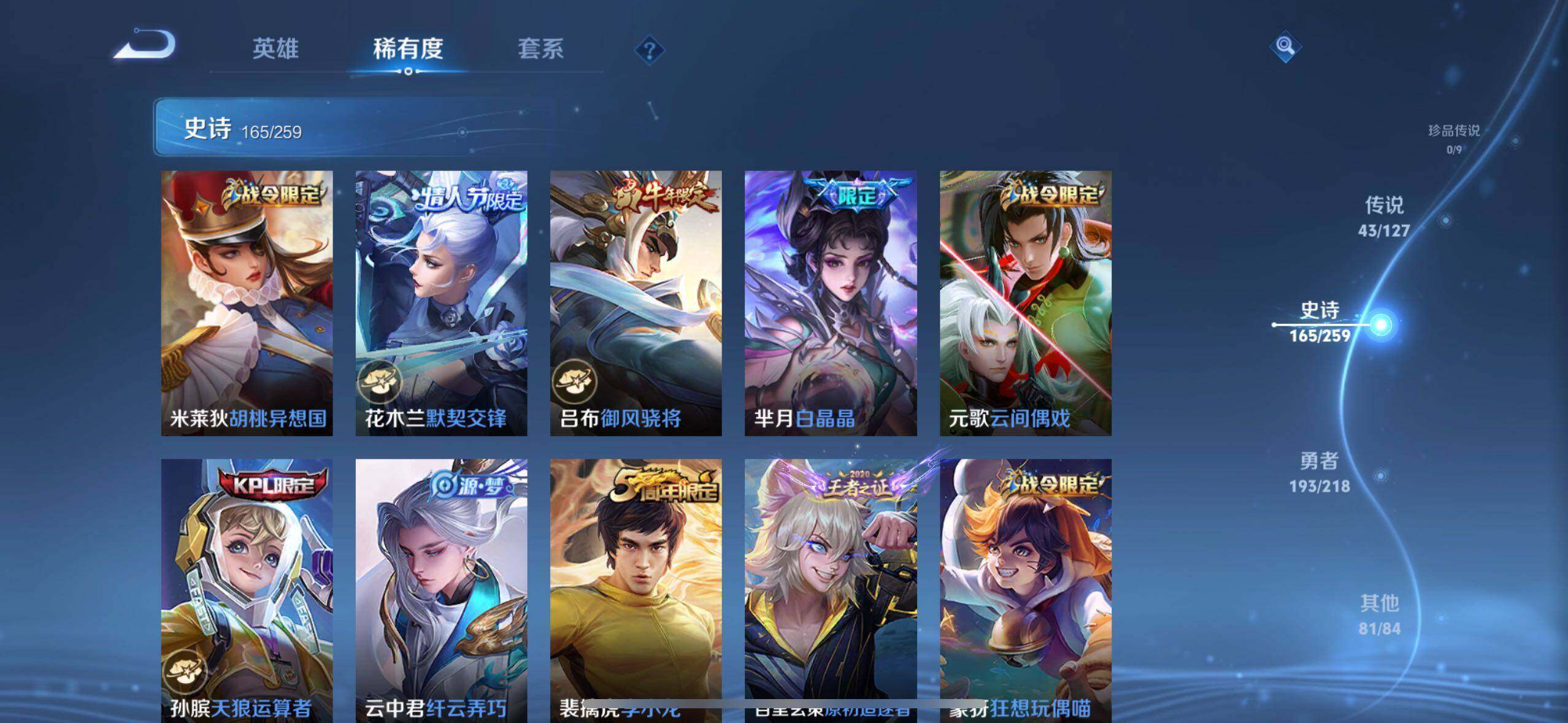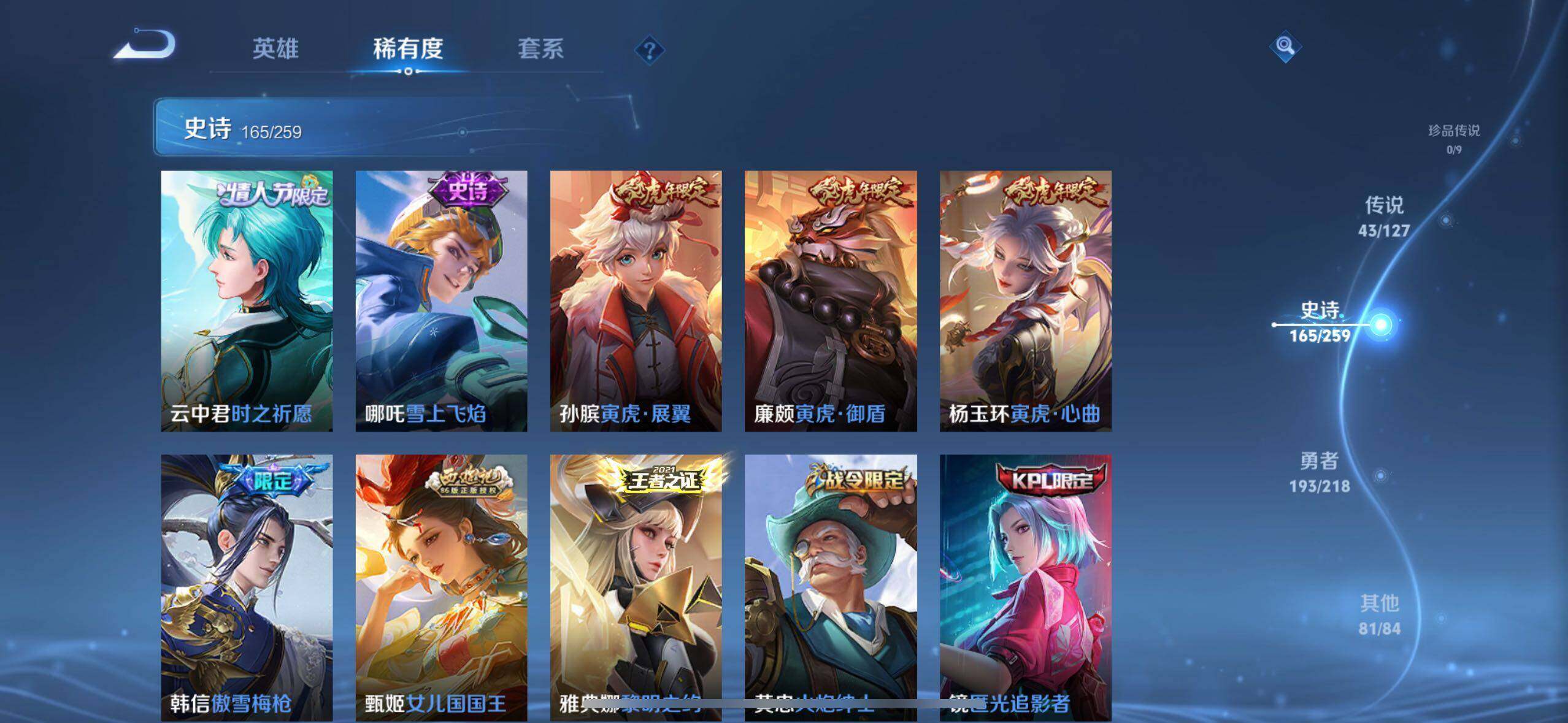 裴擒虎李小龙,上官婉儿梁祝,貂蝉逐梦之音,公孙离祈雪灵祝,吕布御风骁将,马超神威,典韦岱宗,韩信飞衡,伽罗太华,孙膑天狼运算者,上官婉儿天狼绘梦者,伽罗天狼溯光者,马可波罗逐梦之星,苏烈玄武志,百里守约朱雀志,虞姬霸王别姬,花木兰默契交锋,后羿如梦令,孙悟空至尊宝,花木兰青春决赛季,芈月白晶晶,赵云引擎之心,孙悟空美猴王,猪八戒猪悟能,廉颇寅虎·御盾,孙悟空孙行者,甄姬女儿国国王,镜匿光追影者,韩信傲雪梅枪,鲁班七号寅虎·瑞焰,孙膑寅虎·展翼,杨玉环寅虎·心曲,裴擒虎寅虎·赤拳,云中君时之祈愿,赵云百木心枪,公孙离玉兔公主,夏侯惇匿光决锋者,妲己时之奇旅,马可波罗山海·玄木吟,瑶山海·碧波行,桑启鸣野蒿