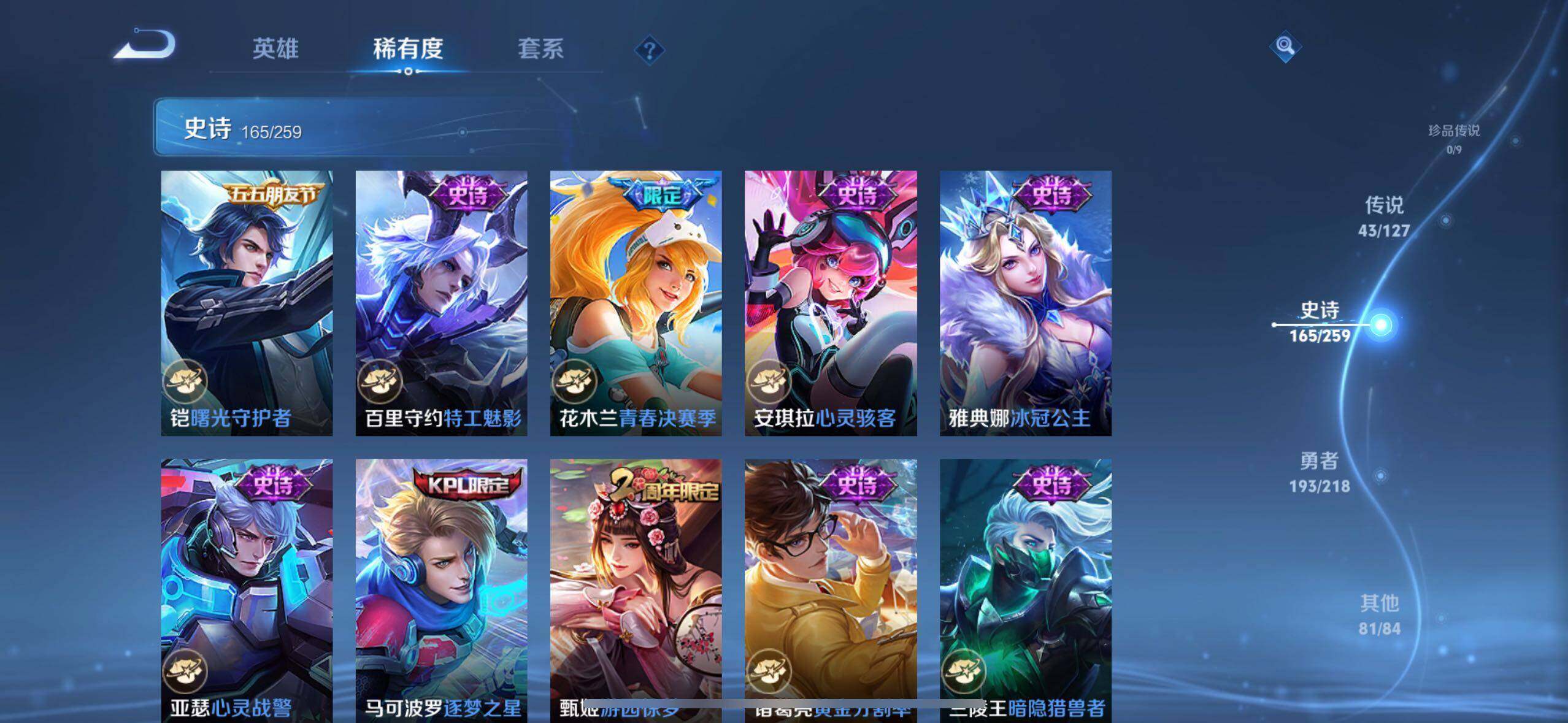 小乔青蛇,大乔白蛇,瑶遇见神鹿,娜可露露晚萤,伽罗箭羽风息,李元芳逐浪之夏,不知火舞魅语,公孙离无限星赏官,大乔猫狗日记,孙策猫狗日记,阿轲节奏热浪,露娜紫霞仙子,诸葛亮黄金分割率,王昭君偶像歌手,韩信白龙吟,项羽苍穹之光,孙尚香时之恋人,阿轲暗夜猫娘,雅典娜冰冠公主,吕布末日机甲,鲁班七号电玩小子,蒙犽龙鼓争鸣,橘右京修罗,墨子龙骑士,嬴政摇滚巨星,刘禅绅士熊喵,刘禅天才门将,白起星夜王子,安琪拉心灵骇客,安琪拉时之奇旅,程咬金功夫厨神,刘邦德古拉伯爵,兰陵王暗隐猎兽者,曹操幽灵船长,宫本武藏鬼剑武藏,司马懿暗渊魔法,亚瑟心灵战警,钟馗乐园奇幻夜,杨戬天秀·启明,蔡文姬舞动绿茵,廉颇地狱岩魂,西施诗语江南,小乔缤纷独角兽,夏侯惇乘风破浪,花木兰水晶猎龙者,铠曙光守护者,百里玄策热力回旋,墨子金属风暴,百里玄策原初追逐者,吕布圣诞狂欢,貂蝉圣诞恋歌,百里守约特工魅影,嬴政暗夜贵公子,嫦娥拒霜思,雅典娜黎明之约,李白千年之狐,哪吒雪上飞焰,夏洛特永昼,澜赏金猎手,艾琳奇遇舞章,貂蝉唤灵魅影,庄周天秀·幻梦,阿古朵顽趣,镜玫瑰异探,关羽百相守梦,沈梦溪匿光破解者,蔡文姬电玩·兔顽号,刘禅电玩·爆裂旋风,海月浮梦罗烟,李元芳匿光侦查者,姜子牙闲日渔趣,蒙犽百解令,周瑜雪夜绮愿,高渐离燃音魔法,伽罗琥珀纪元,大乔乘龙·忆丹青,安琪拉乘龙·聚宝船,李白谪仙醉月