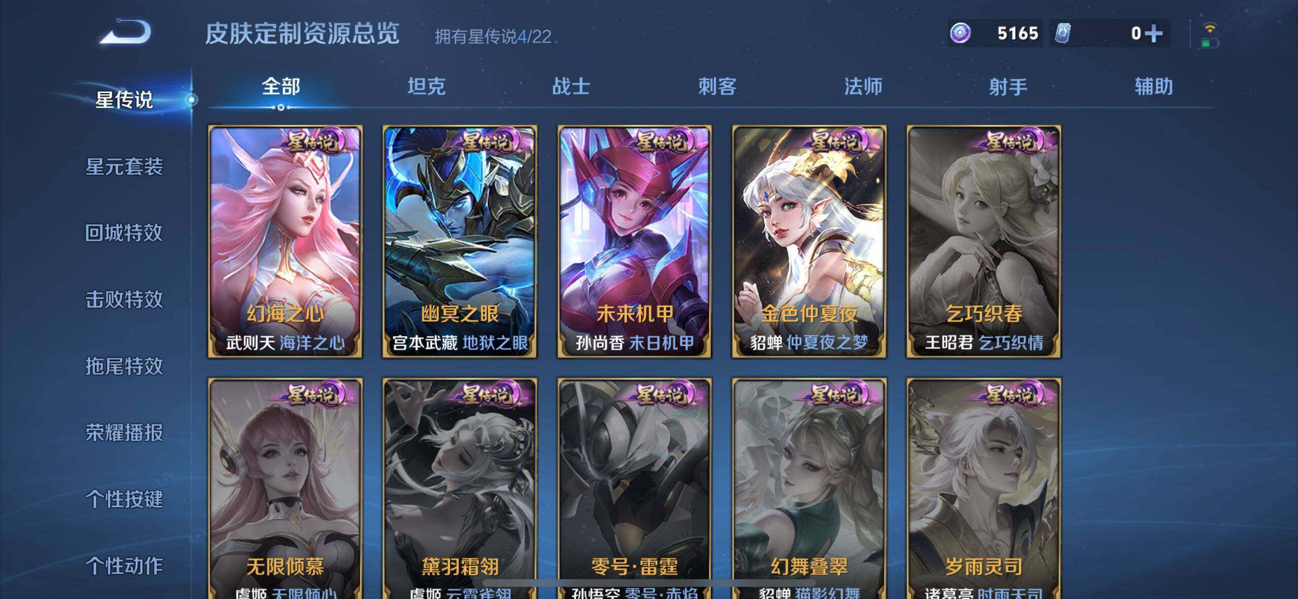 张良黄金白羊座,干将莫邪久胜战神,铠绛天战甲,貂蝉猫影幻舞,曜云鹰飞将,镜炽阳神光,西施游龙清影,虞姬云霓雀翎,赵云淬星耀世,孙悟空零号·赤焰,王昭君乞巧织情,貂蝉遇见胡旋,蔡文姬花朝如约,百里守约碎云,王昭君永恒水手月亮,狄仁杰夜礼服假面,艾琳觅芳踪,孙策乘龙·淬吴钩,赵云乘龙·铭钟鼎,孙尚香乘龙·问璇玑,貂蝉曦玄引,云缨幻光神枪
