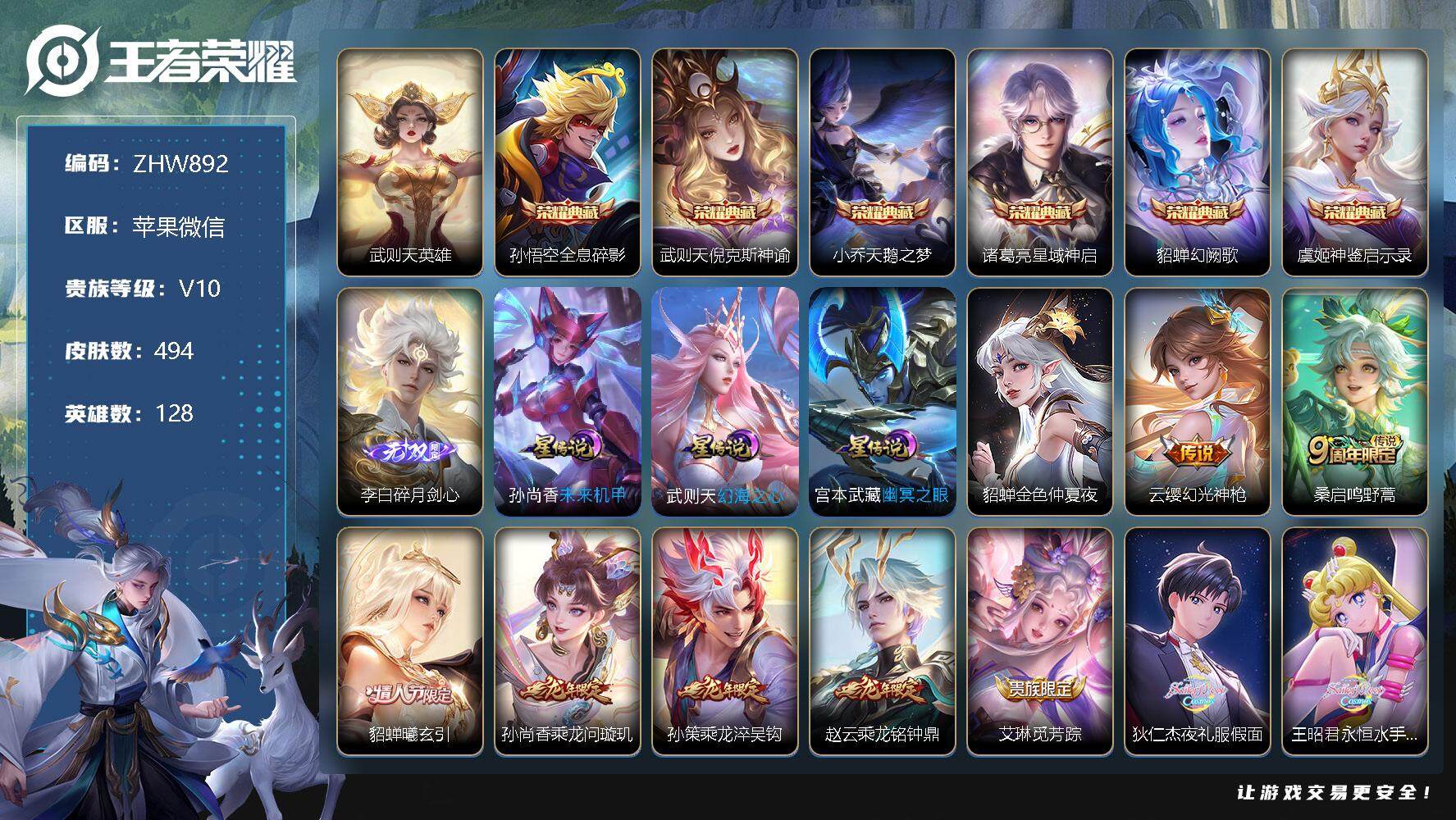 [13121496]苹果WX-V10-128英雄-494皮肤-7水+1小兵-44传说-167史诗-4星元 【英雄全皮】:姜子牙全皮,刘邦全皮,钟馗全皮,太乙真人全皮,猪八戒全皮,蒙恬全皮,空空儿全皮,影全皮 【荣耀典藏】:武则天英雄,孙悟空全息碎影,武则天倪克斯神谕,小乔天鹅之梦,诸葛亮星域神启,貂蝉幻阙歌,虞姬神鉴启示录 【无双皮肤】:李白碎月剑心 【传说皮肤】:后羿神树通天,云缨幻光神枪,桑启鸣野蒿,貂蝉曦玄引,孙尚香乘龙问璇玑,孙策乘龙淬吴钩,赵云乘龙铭钟鼎,艾琳觅芳踪,狄仁杰夜礼服假面,王昭君永恒水手月亮,东皇太一灼幽烈阳,诸葛亮鹤羽星尊,澜电玩雷克斯,孙悟空齐天大圣,小乔山海琳琅生,曜山海苍雷引,李信山海炽霜斩,吕布怒海麟威,百里守约碎云,蔡文姬花朝如约,裴擒虎寅虎赤拳,鲁班七号寅虎瑞焰,貂蝉遇见胡旋,赵云淬星耀世,王昭君乞巧织情,西施游龙清影,公孙离祈雪灵祝,铠绛天战甲,镜炽阳神光,虞姬启明星使,孙悟空零号赤焰,曜云鹰飞将,伽罗太华,貂蝉猫影幻舞,张良黄金白羊座,干将莫邪久胜战神,虞姬云霓雀翎,花木兰冠军飞将,梦奇胖达荣荣,后羿黄金射手座,貂蝉仲夏夜之梦,孙尚香末日机甲,宫本武藏地狱之眼,武则天海洋之心 【限定皮肤】:白起狰,蔡文姬夏日便利店,大乔绒语心约,虞姬夏日便利店,姜子牙天穹之誓,杨戬破阵退雄兵,李白谪仙醉月,狄仁杰阴阳师,廉颇寅虎御盾,小乔山海琳琅生,赵云皇家上将,赵云引擎之心,赵云百木心枪,墨子神迹守卫,妲己时之奇旅,嬴政优雅恋人,嬴政白昼王子,鲁班七号狮舞东方,鲁班七号寅虎瑞焰,庄周高山流水,高渐离死亡摇滚,高渐离玩趣恶龙,阿轲迷踪丽影,钟无艳王者之锤,钟无艳超时空战士,孙膑天狼运算者,孙膑寅虎展翼,扁鹊奇幻香踪,白起夜都怪侠,芈月重明,芈月白晶晶,芈月幻夜卜梦,吕布猎兽之王,吕布御风骁将,周瑜赤莲之焰,元歌云间偶戏,元歌无心,夏侯惇朔风刀,夏侯惇匿光决锋者,甄姬女儿国国王,甄姬游园惊梦,甄姬落雪兰心,曹操烛龙,典韦穷奇,典韦蓝屏警告,典韦岱宗,马可波罗逐梦之星,马可波罗暗影游猎,马可波罗山海玄木吟,狄仁杰魔术师,狄仁杰万华元夜,达摩星际陆战队,达摩沙漠行僧,项羽海滩派对,老夫子醍醐杖,老夫子航海奇遇记,关羽百相守梦,貂蝉逐梦之音,貂蝉遇见胡旋,程咬金演武夺筹,刘邦夺宝奇兵,韩信飞衡,韩信傲雪梅枪,王昭君午后时光,兰陵王驯魔猎人,兰陵王金庭之子,花木兰青春决