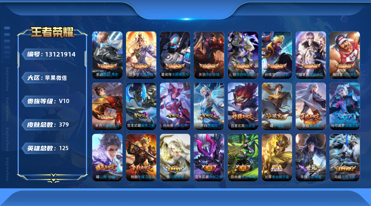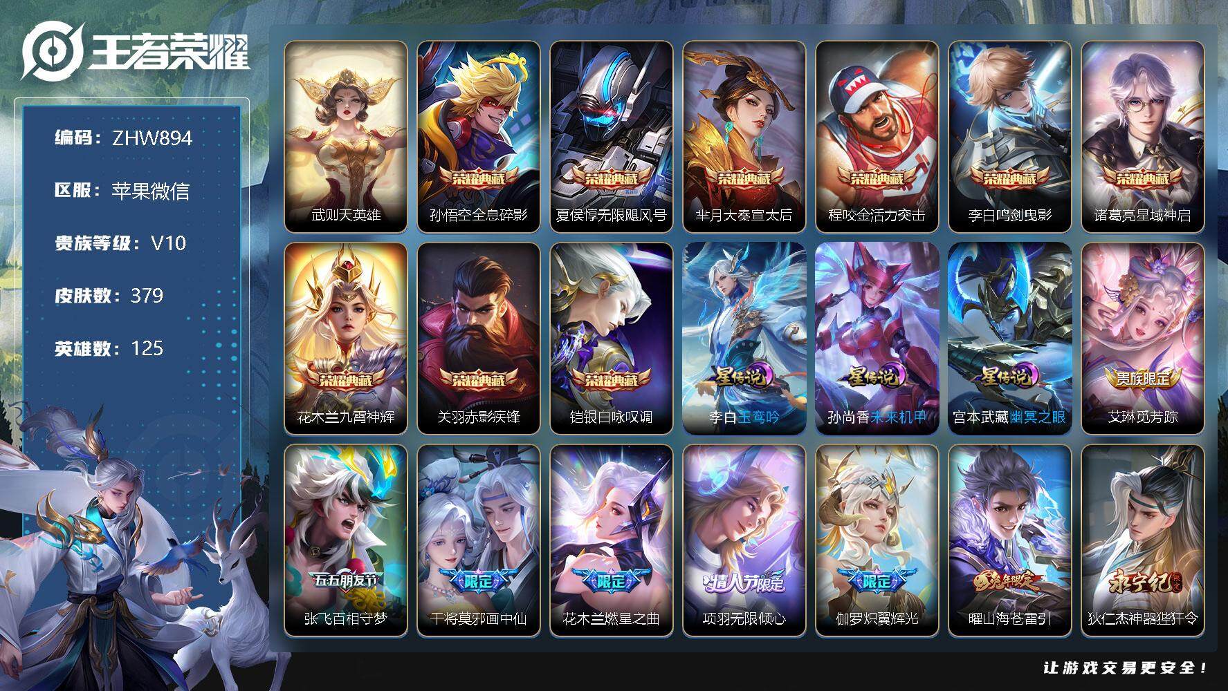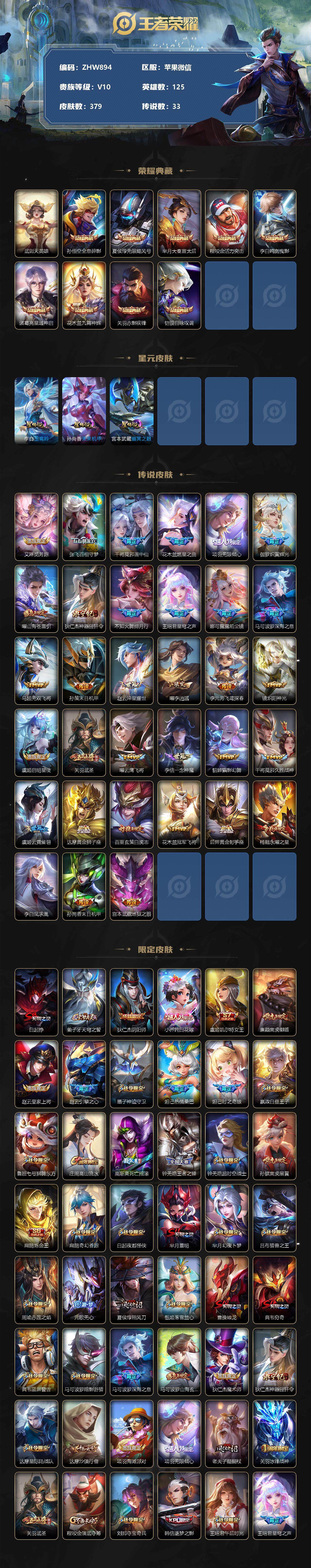 [13121914]苹果V-对抗46段-V10-125英雄-379皮肤-10水-33传说-109史诗-3星元 【英雄全皮】:刘邦全皮,娜可露露全皮,钟馗全皮,鲁班大师全皮,蒙恬全皮,金蝉全皮 【荣耀典藏】:武则天英雄,孙悟空全息碎影,夏侯惇无限飓风号,芈月大秦宣太后,程咬金活力突击,李白鸣剑曳影,诸葛亮星域神启,花木兰九霄神辉,关羽赤影疾锋,铠银白咏叹调 【传说皮肤】:艾琳觅芳踪,张飞百相守梦,干将莫邪画中仙,花木兰燃星之曲,项羽无限倾心,伽罗炽翼辉光,曜山海苍雷引,狄仁杰神器狴犴令,不知火舞绯月行,王昭君星穹之声,娜可露露前尘镜,马可波罗深海之息,马超无双飞将,孙策末日机甲,赵云淬星耀世,曜李逍遥 ,李元芳飞鸢探春,镜炽阳神光,虞姬启明星使,关羽武圣,曜云鹰飞将,李信一念神魔,貂蝉猫影幻舞,干将莫邪久胜战神,虞姬云霓雀翎,达摩黄金狮子座,百里玄策白虎志,花木兰冠军飞将,后羿黄金射手座,杨戬永曜之星,李白凤求凰,孙尚香末日机甲,宫本武藏地狱之眼 【限定皮肤】:白起狰,姜子牙天穹之誓,狄仁杰阴阳师,小乔纯白花嫁,虞姬凯尔特女王,廉颇寅虎御盾,赵云皇家上将,赵云引擎之心,墨子神迹守卫,妲己热情桑巴,妲己时之奇旅,嬴政白昼王子,鲁班七号狮舞东方,庄周高山流水,高渐离死亡摇滚,钟无艳王者之锤,钟无艳超时空战士,孙膑寅虎展翼,扁鹊炼金王,扁鹊奇幻香踪,白起夜都怪侠,芈月重明,芈月幻夜卜梦,吕布猎兽之王,周瑜赤莲之焰,元歌无心,夏侯惇朔风刀,甄姬落雪兰心,曹操烛龙,典韦穷奇,典韦蓝屏警告,马可波罗暗影游猎,马可波罗深海之息,马可波罗山海玄木吟,狄仁杰魔术师,狄仁杰神器狴犴令,达摩星际陆战队,达摩沙漠行僧,项羽海滩派对,项羽无限倾心,老夫子醍醐杖,关羽冰锋战神,关羽武圣,程咬金演武夺筹,刘邦夺宝奇兵,韩信逐梦之影,王昭君午后时光,王昭君星穹之声,兰陵王驯魔猎人,兰陵王金庭之子,花木兰燃星之曲,不知火舞绯月行,娜可露露前尘镜,亚瑟潮玩骑士王,孙悟空美猴王,牛魔御旌,后羿圣弓游侠,刘备百相守梦,张飞百相守梦,李元芳银河之约,李元芳云中旅人,虞姬启明星使,钟馗神迹守卫,钟馗驱傩正仪,杨玉环寅虎心曲,杨戬永曜之星,杨戬潮玩骑兵,女娲朔望之晖,干将莫邪胡桃夹子,干将莫邪真爱魔法,干将莫邪画中仙,雅典娜黎明之约,蔡文姬奇迹圣诞,太乙真人饕餮,太乙真人华丽摇滚,鬼谷子原初探秘者,鬼谷子五谷丰年,黄忠烈魂,黄忠火