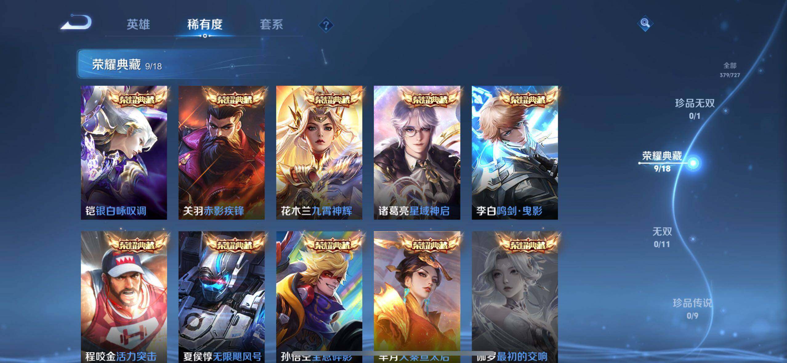 【荣耀典藏】:武则天英雄,孙悟空全息碎影,夏侯惇无限飓风号,芈月大秦宣太后,程咬金活力突击,李白鸣剑曳影,诸葛亮星域神启,花木兰九霄神辉,关羽赤影疾锋,铠银白咏叹调