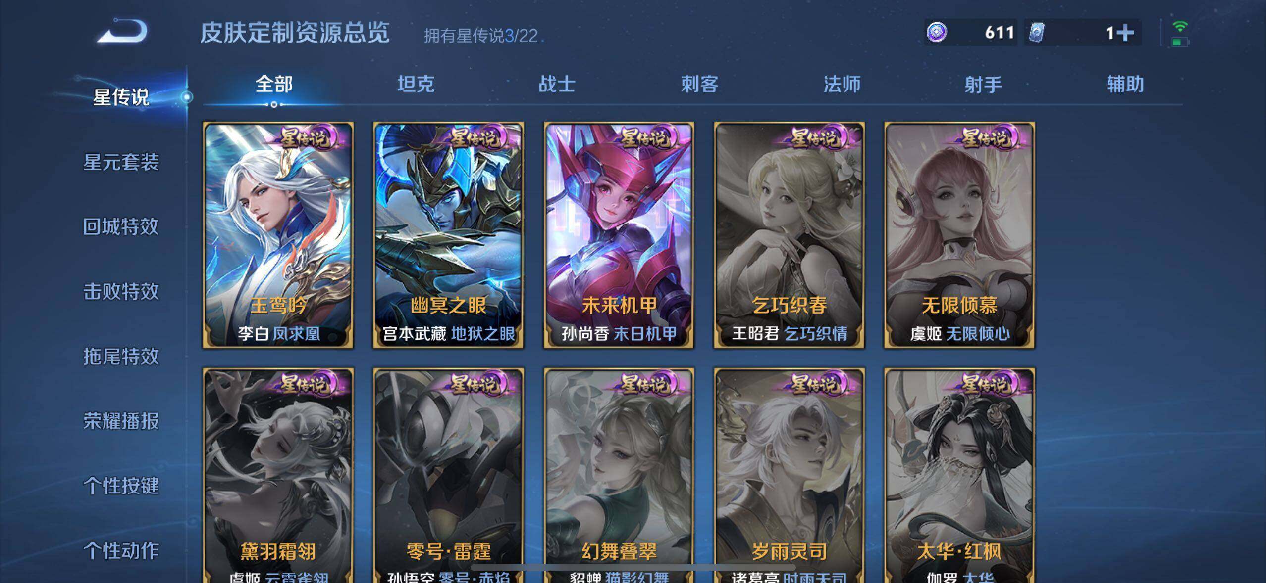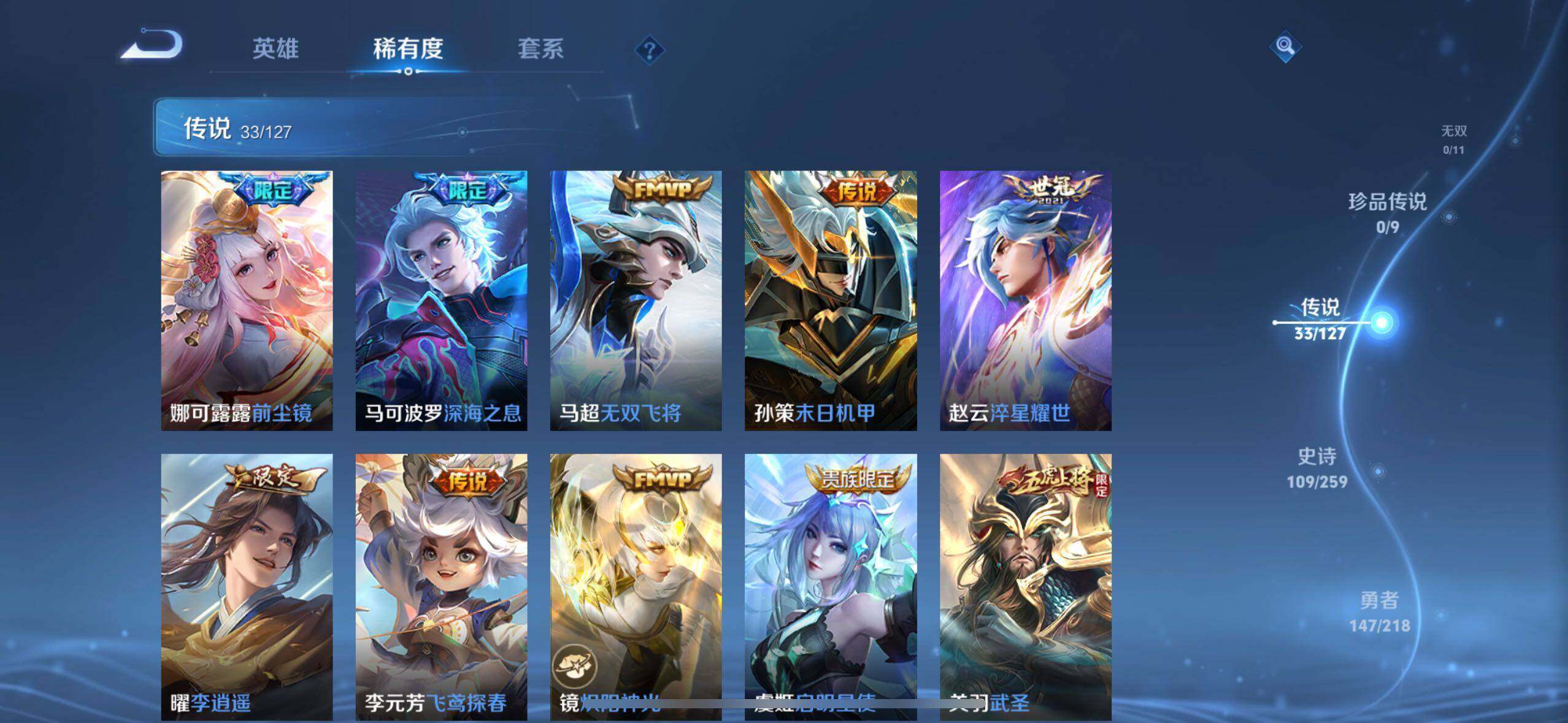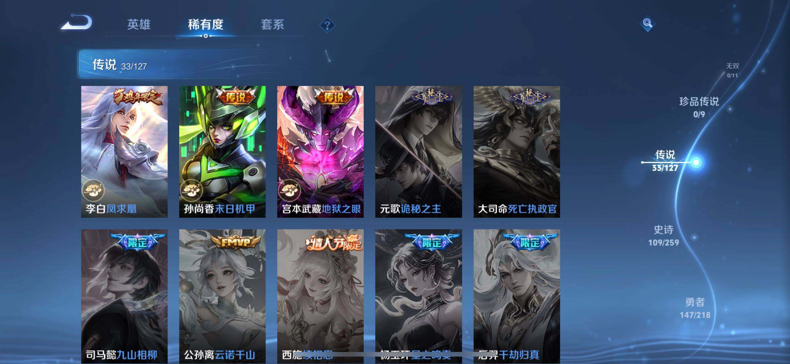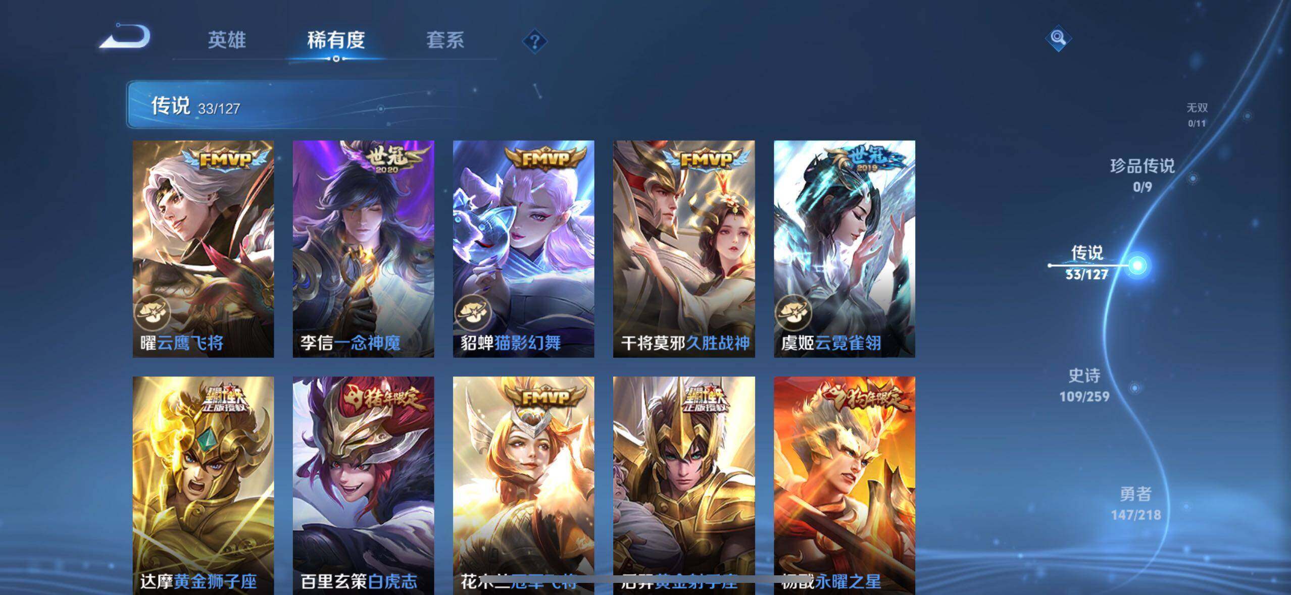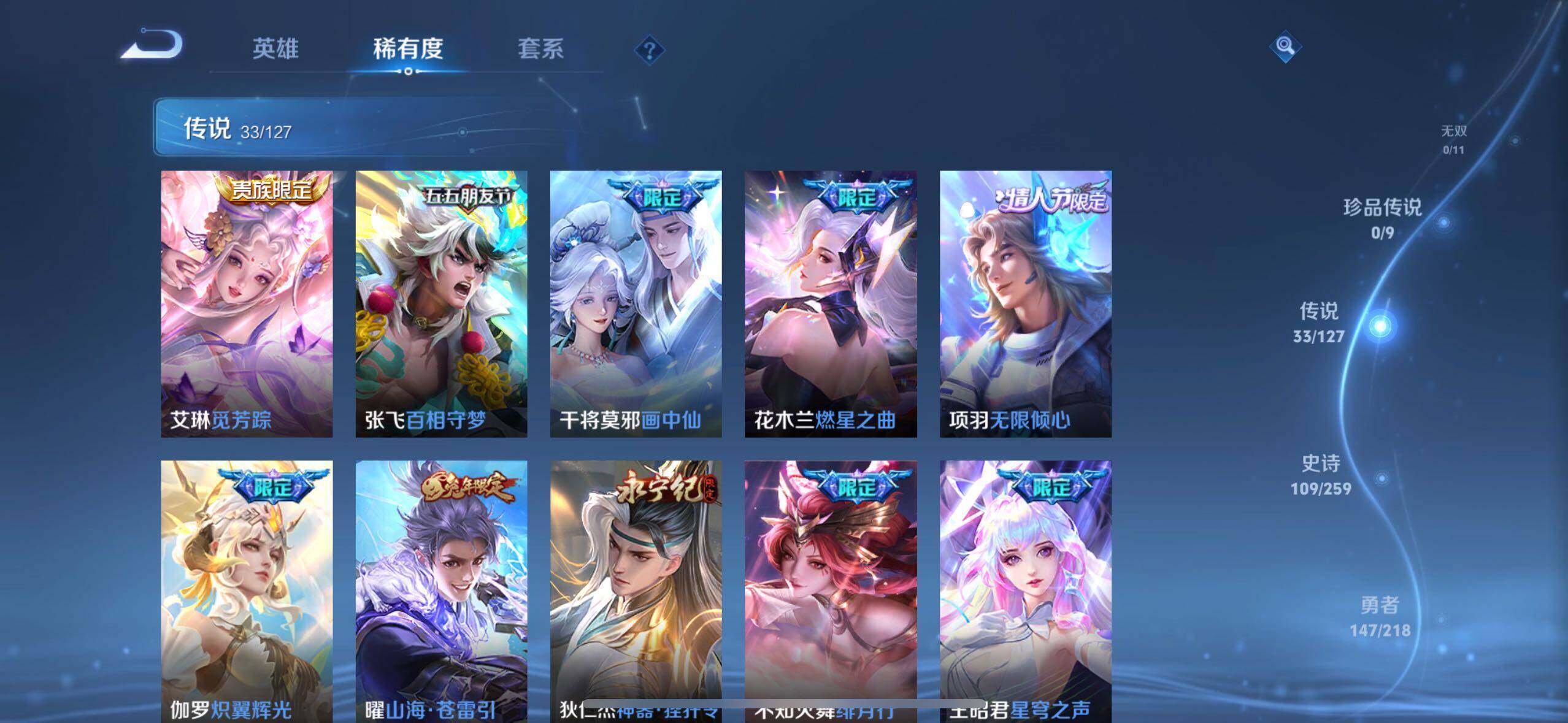 【传说皮肤】:艾琳觅芳踪,张飞百相守梦,干将莫邪画中仙,花木兰燃星之曲,项羽无限倾心,伽罗炽翼辉光,曜山海苍雷引,狄仁杰神器狴犴令,不知火舞绯月行,王昭君星穹之声,娜可露露前尘镜,马可波罗深海之息,马超无双飞将,孙策末日机甲,赵云淬星耀世,曜李逍遥 ,李元芳飞鸢探春,镜炽阳神光,虞姬启明星使,关羽武圣,曜云鹰飞将,李信一念神魔,貂蝉猫影幻舞,干将莫邪久胜战神,虞姬云霓雀翎,达摩黄金狮子座,百里玄策白虎志,花木兰冠军飞将,后羿黄金射手座,杨戬永曜之星,李白凤求凰,孙尚香末日机甲,宫本武藏地狱之眼