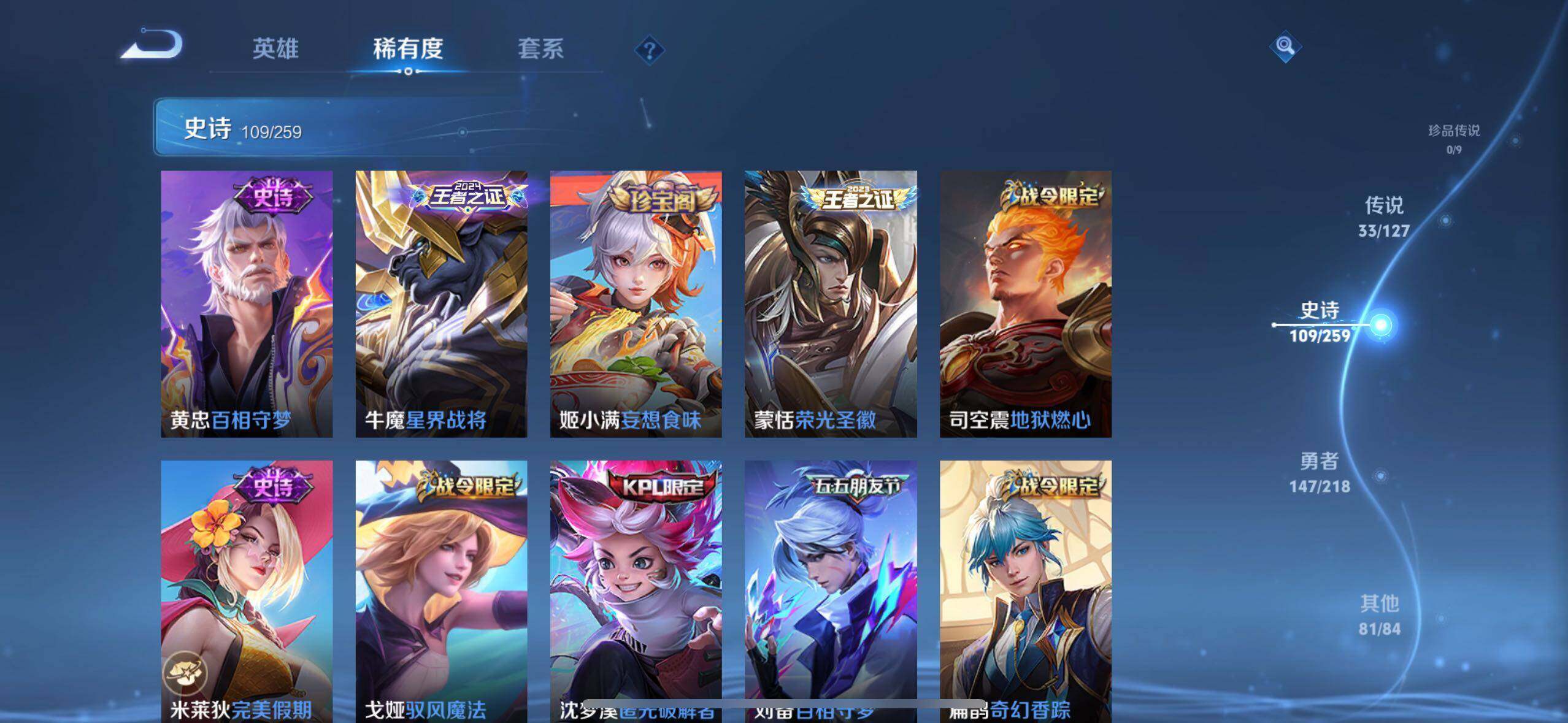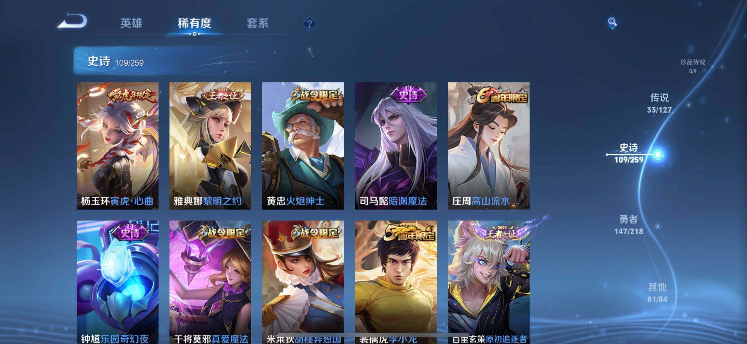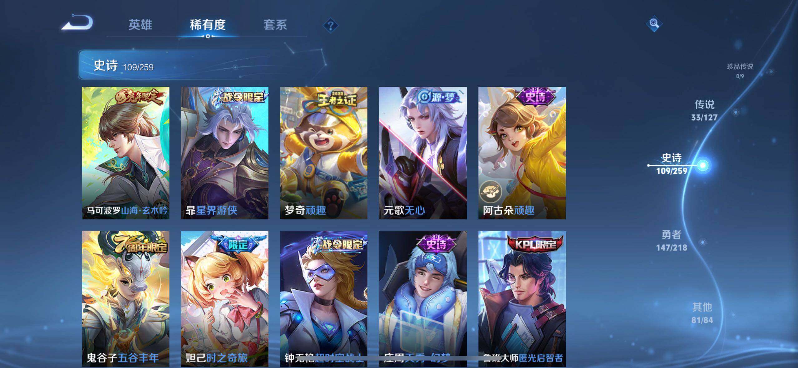 扁鹊炼金王,虞姬凯尔特女王,白起狰,太乙真人饕餮,曹操烛龙,芈月重明,典韦穷奇,狂铁御狮,米莱狄御霄,牛魔御旌,盾山御銮,夏侯惇朔风刀,明世隐疑决卦,老夫子醍醐杖,鬼谷子原初探秘者,程咬金演武夺筹,钟馗驱傩正仪,苏烈千军破阵,吕布猎兽之王,嬴政白昼王子,女娲朔望之晖,典韦蓝屏警告,钟馗神迹守卫,鲁班七号狮舞东方,沈梦溪星空之诺,李元芳银河之约,刘邦夺宝奇兵,马可波罗暗影游猎,蒙犽狂想玩偶喵,弈星混沌棋,达摩沙漠行僧,兰陵王金庭之子,沈梦溪大漠名商,李元芳云中旅人,桑启海盐诗旅,裴擒虎擒涛扼浪,鲁班大师探海日志,张良古海寻踪