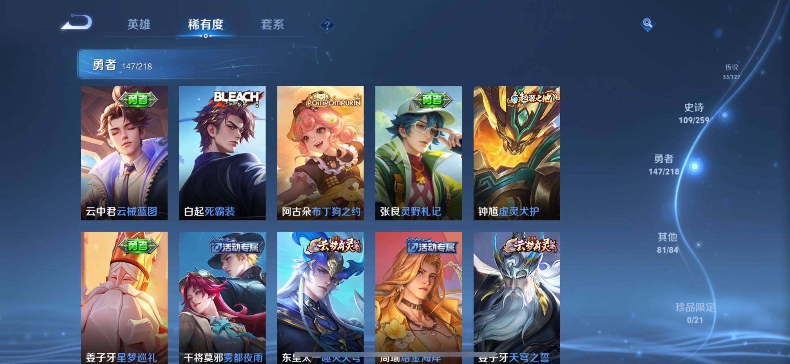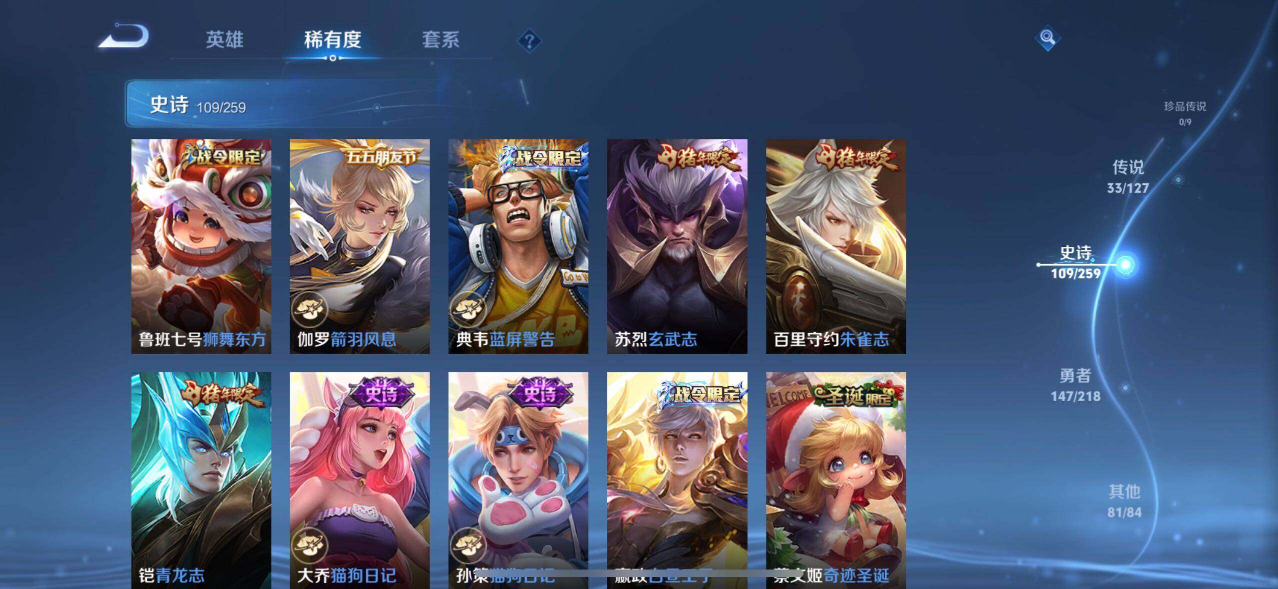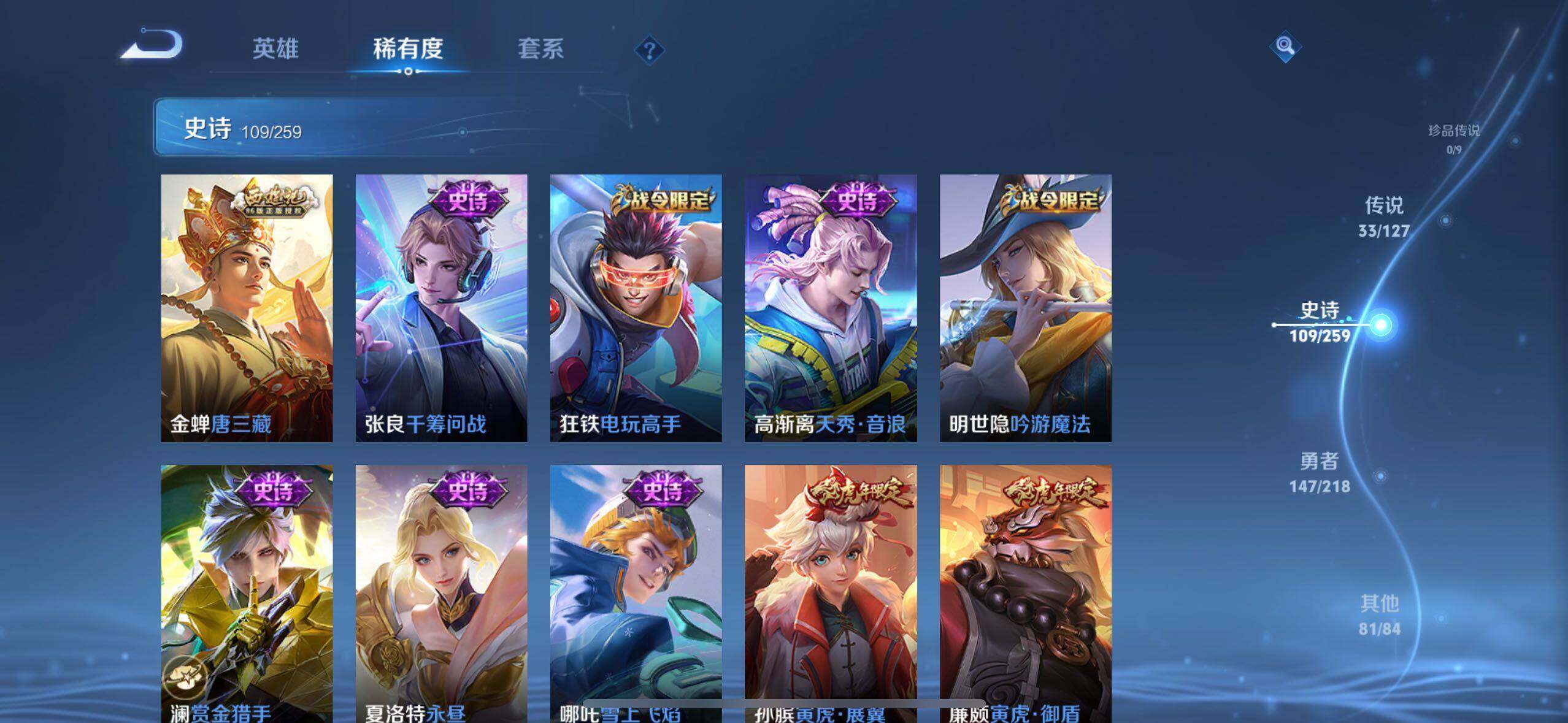 扁鹊炼金王,虞姬凯尔特女王,白起狰,太乙真人饕餮,曹操烛龙,芈月重明,典韦穷奇,狂铁御狮,米莱狄御霄,牛魔御旌,盾山御銮,夏侯惇朔风刀,明世隐疑决卦,老夫子醍醐杖,鬼谷子原初探秘者,程咬金演武夺筹,钟馗驱傩正仪,苏烈千军破阵,吕布猎兽之王,嬴政白昼王子,女娲朔望之晖,典韦蓝屏警告,钟馗神迹守卫,鲁班七号狮舞东方,沈梦溪星空之诺,李元芳银河之约,刘邦夺宝奇兵,马可波罗暗影游猎,蒙犽狂想玩偶喵,弈星混沌棋,达摩沙漠行僧,兰陵王金庭之子,沈梦溪大漠名商,李元芳云中旅人,桑启海盐诗旅,裴擒虎擒涛扼浪,鲁班大师探海日志,张良古海寻踪