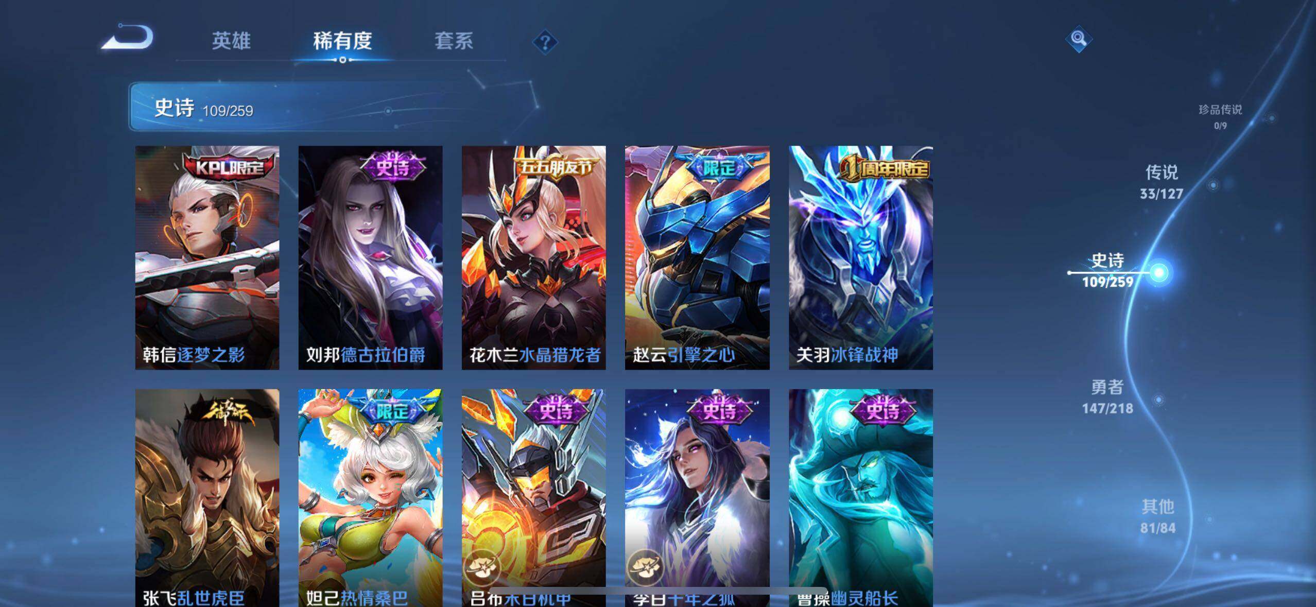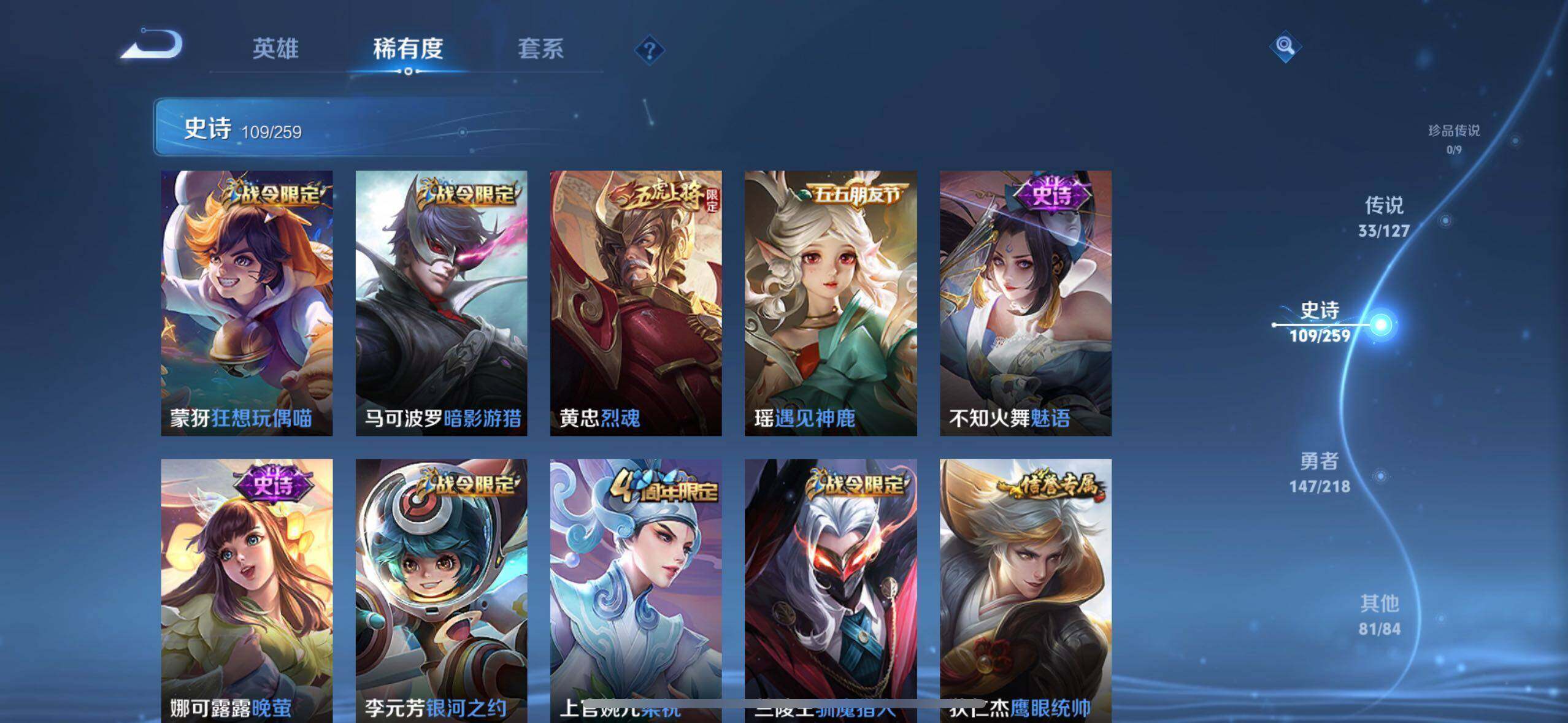 【限定皮肤】:白起狰,姜子牙天穹之誓,狄仁杰阴阳师,小乔纯白花嫁,虞姬凯尔特女王,廉颇寅虎御盾,赵云皇家上将,赵云引擎之心,墨子神迹守卫,妲己热情桑巴,妲己时之奇旅,嬴政白昼王子,鲁班七号狮舞东方,庄周高山流水,高渐离死亡摇滚,钟无艳王者之锤,钟无艳超时空战士,孙膑寅虎展翼,扁鹊炼金王,扁鹊奇幻香踪,白起夜都怪侠,芈月重明,芈月幻夜卜梦,吕布猎兽之王,周瑜赤莲之焰,元歌无心,夏侯惇朔风刀,甄姬落雪兰心,曹操烛龙,典韦穷奇,典韦蓝屏警告,马可波罗暗影游猎,马可波罗深海之息,马可波罗山海玄木吟,狄仁杰魔术师,狄仁杰神器狴犴令,达摩星际陆战队,达摩沙漠行僧,项羽海滩派对,项羽无限倾心,老夫子醍醐杖,关羽冰锋战神,关羽武圣,程咬金演武夺筹,刘邦夺宝奇兵,韩信逐梦之影,王昭君午后时光,王昭君星穹之声,兰陵王驯魔猎人,兰陵王金庭之子,花木兰燃星之曲,不知火舞绯月行,娜可露露前尘镜,亚瑟潮玩骑士王,孙悟空美猴王,牛魔御旌,后羿圣弓游侠,刘备百相守梦,张飞百相守梦,李元芳银河之约,李元芳云中旅人,虞姬启明星使,钟馗神迹守卫,钟馗驱傩正仪,杨玉环寅虎心曲,杨戬永曜之星,杨戬潮玩骑兵,女娲朔望之晖,干将莫邪胡桃夹子,干将莫邪真爱魔法,干将莫邪画中仙,雅典娜黎明之约,蔡文姬奇迹圣诞,太乙真人饕餮,太乙真人华丽摇滚,鬼谷子原初探秘者,鬼谷子五谷丰年,黄忠烈魂,黄忠火
