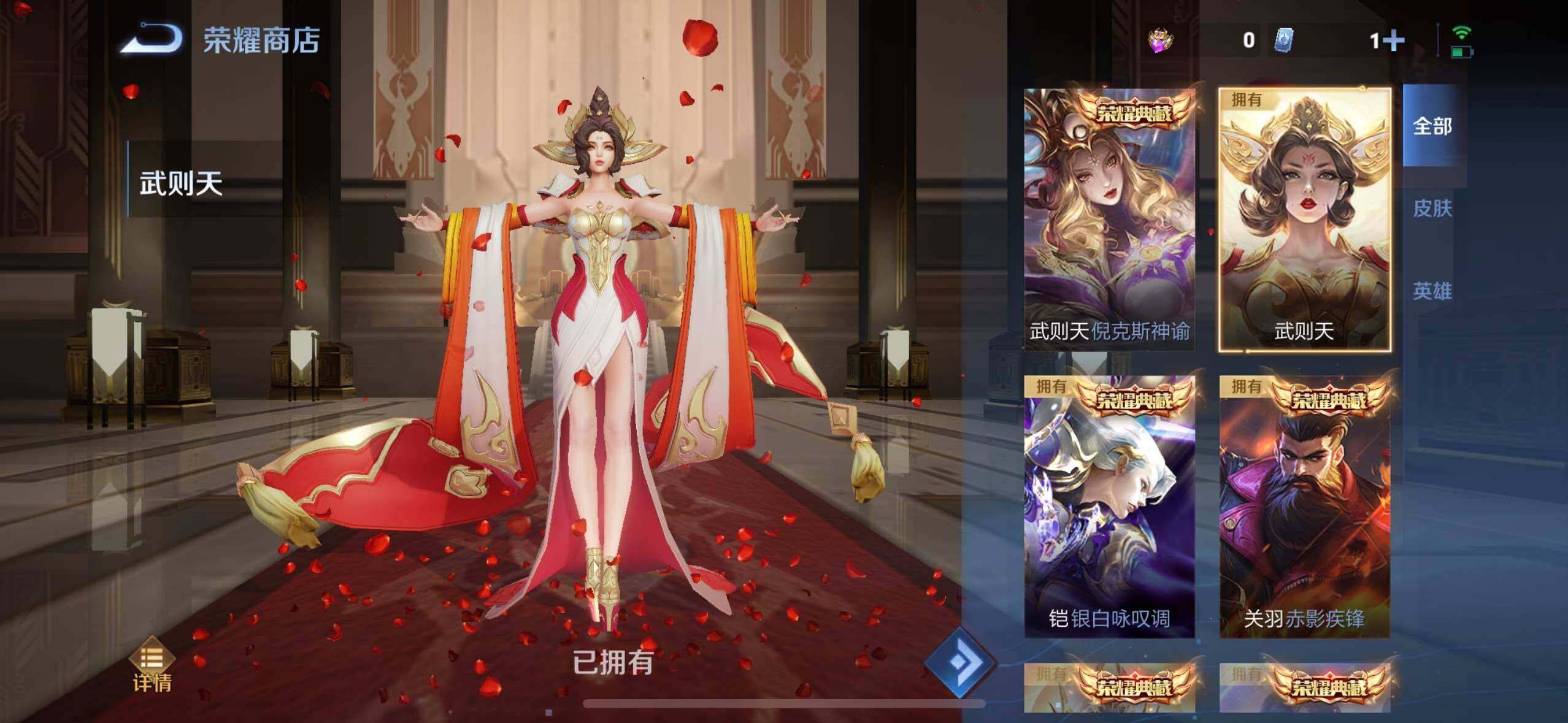 武则天女帝,夏侯惇无限飓风号,程咬金活力突击,芈月大秦宣太后,李白鸣剑·曳影,孙悟空全息碎影,诸葛亮星域神启,花木兰九霄神辉,关羽赤影疾锋,铠银白咏叹调