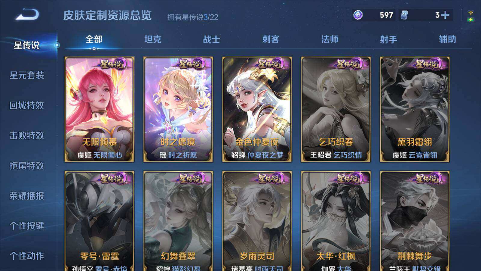 干将莫邪久胜战神,貂蝉猫影幻舞,曜云鹰飞将,镜炽阳神光,西施游龙清影,虞姬云霓雀翎,李信一念神魔,赵云淬星耀世,小乔音你心动,周瑜音你心动,刘备时之恋人,孙悟空零号·赤焰,李元芳飞鸢探春,曜李逍遥,王昭君乞巧织情,貂蝉遇见胡旋,孙策末日机甲,蔡文姬花朝如约,孙策挚爱之约,大乔挚爱花嫁,马超无双飞将,公孙离记忆之芯,张飞百相守梦,艾琳觅芳踪