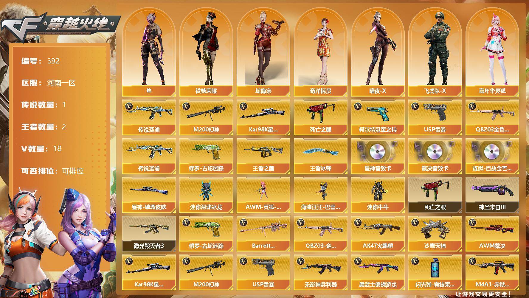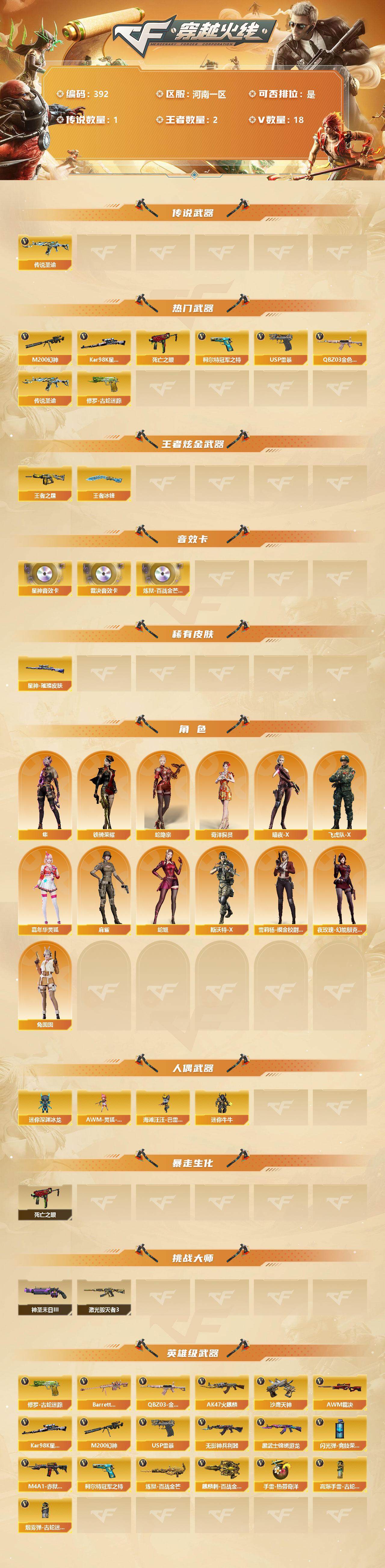 [13140369]河南一区-18V-2王者-0炫金 【传说武器】:传说圣谕 【热门武器】:传说圣谕,QBZ03-金色蔷薇,M200-幻神,修罗-古蛇迷踪,死亡之眼,柯尔特-冠军之特,Kar98K-星神,USP-雷暴 【王者炫金武器】:王者之霆,王者冰锋 【音效卡】:AWM-裁决音效卡,Kar98K-星神音效卡,炼狱-百战金芒-庆典舞曲音效卡 【皮肤】:裁决-巅峰荣耀 皮肤,星神-璀璨皮肤,M4A1-再燃火线,龙啸-巅峰荣耀 皮肤,轻型军用手斧-再燃火线 【角色】:隼,蛇隐宗,奇洋探员,暗夜-X,飞虎队-X,嘉年华灵狐,麻雀,蛇姬,斯沃特-X,铁骑荣耀,兔囡囡,雪莉杨-摸金校尉,夜玫瑰-幻能朋克 【人偶武器】:AWM-灵狐-15周年嘉年华,海滩汪汪-巴雷特,迷你深渊冰龙,迷你牛牛 【暴走生化】:死亡之眼 【挑战大师】:激光毁灭者III,神圣爆裂者-末日III 【英雄级武器】:AK47-火麒麟,无影-神兵利器,黑武士-锦绣游龙,QBZ03-金色蔷薇,AWM-裁决,M200-幻神,Kar98K-星神,Barrett-金色蔷薇,炼狱-百战金芒,沙鹰-天神,USP-雷暴,柯尔特-冠军之特,修罗-古蛇迷踪,麒麟刺-百战金芒,手雷-热带奇洋,高爆手雷-古蛇迷踪,闪光弹-竞技荣光,烟雾弹-古蛇迷踪,M4A1-赤狱骑士 【特殊枪械】: