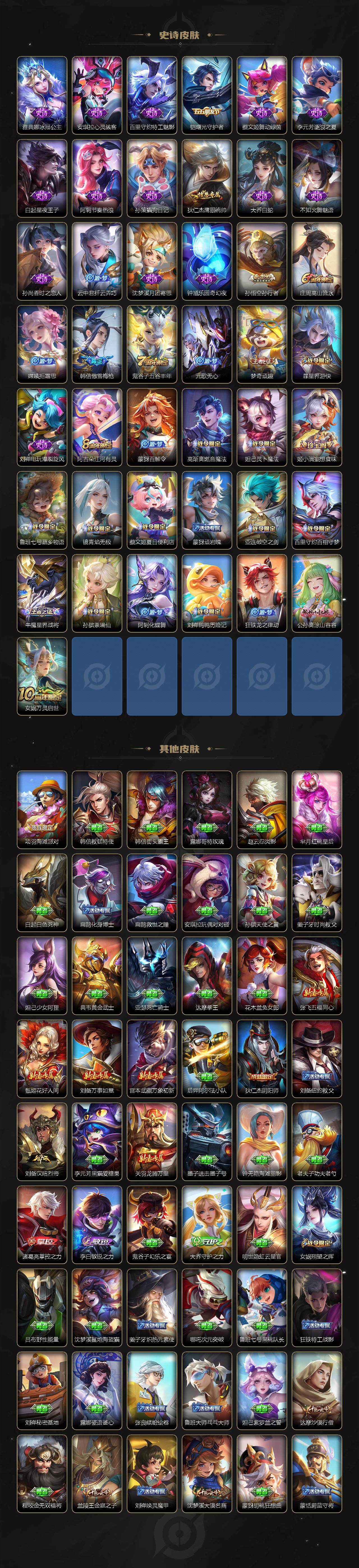【史诗皮肤】:露娜紫霞仙子,阿轲暗夜猫娘,赵云皇家上将,赵云未来纪元,貂蝉圣诞恋歌,甄姬冰雪圆舞曲,狄仁杰魔术师,宫本武藏鬼剑武藏,孙尚香蔷薇恋人,孙尚香水果甜心,嬴政暗夜贵公子,嬴政摇滚巨星,妲己魅力维加斯,妲己女仆咖啡,墨子金属风暴,刘禅绅士熊喵,曹操幽灵船长,吕布末日机甲,张飞乱世虎臣,花木兰水晶猎龙者,夏侯惇乘风破浪,兰陵王暗隐猎兽者,诸葛亮黄金分割率,亚瑟心灵战警,雅典娜冰冠公主,安琪拉心灵骇客,百里守约特工魅影,铠曙光守护者,蔡文姬舞动绿茵,李元芳逐浪之夏,白起星夜王子,阿轲节奏热浪,孙策猫狗日记,狄仁杰鹰眼统帅,大乔白蛇,不知火舞魅语,孙尚香时之恋人,云中君纤云弄巧,沈梦溪月团寄思,钟馗乐园奇幻夜,孙悟空孙行者,庄周高山流水,嫦娥拒霜思,韩信傲雪梅枪,鬼谷子五谷丰年,元歌无心,梦奇顽趣,暃星界游侠,刘