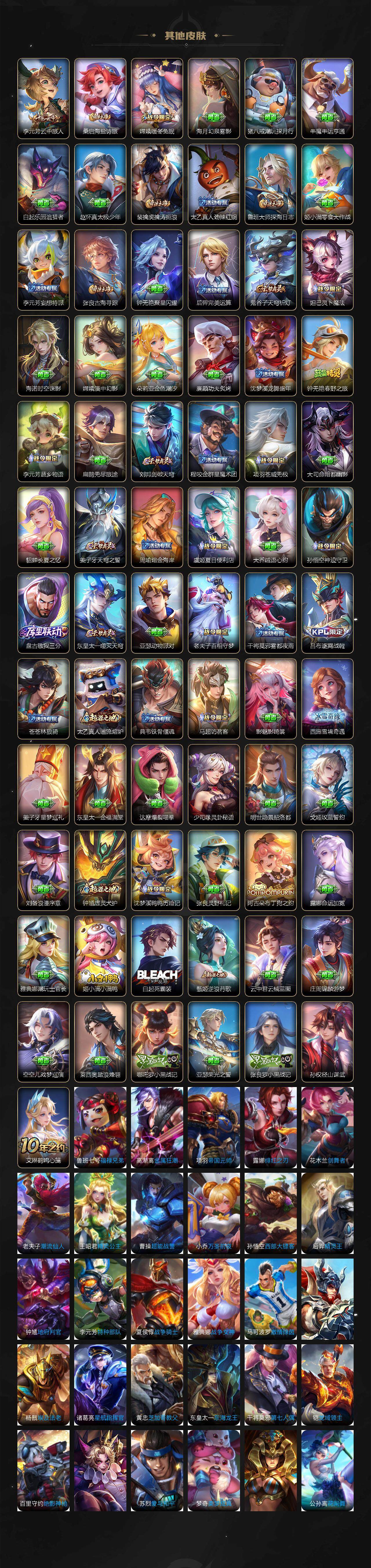大乔白蛇,李元芳逐浪之夏,不知火舞魅语,孙策猫狗日记,阿轲节奏热浪,露娜紫霞仙子,诸葛亮黄金分割率,孙尚香时之恋人,阿轲暗夜猫娘,雅典娜冰冠公主,吕布末日机甲,嬴政摇滚巨星,刘禅绅士熊喵,白起星夜王子,安琪拉心灵骇客,兰陵王暗隐猎兽者,曹操幽灵船长,宫本武藏鬼剑武藏,亚瑟心灵战警,钟馗乐园奇幻夜,蔡文姬舞动绿茵,夏侯惇乘风破浪,花木兰水晶猎龙者,铠曙光守护者,墨子金属风暴,貂蝉圣诞恋歌,百里守约特工魅影,嬴政暗夜贵公子,嫦娥拒霜思,刘禅电玩·爆裂旋风,蒙犽百解令,高渐离燃音魔法