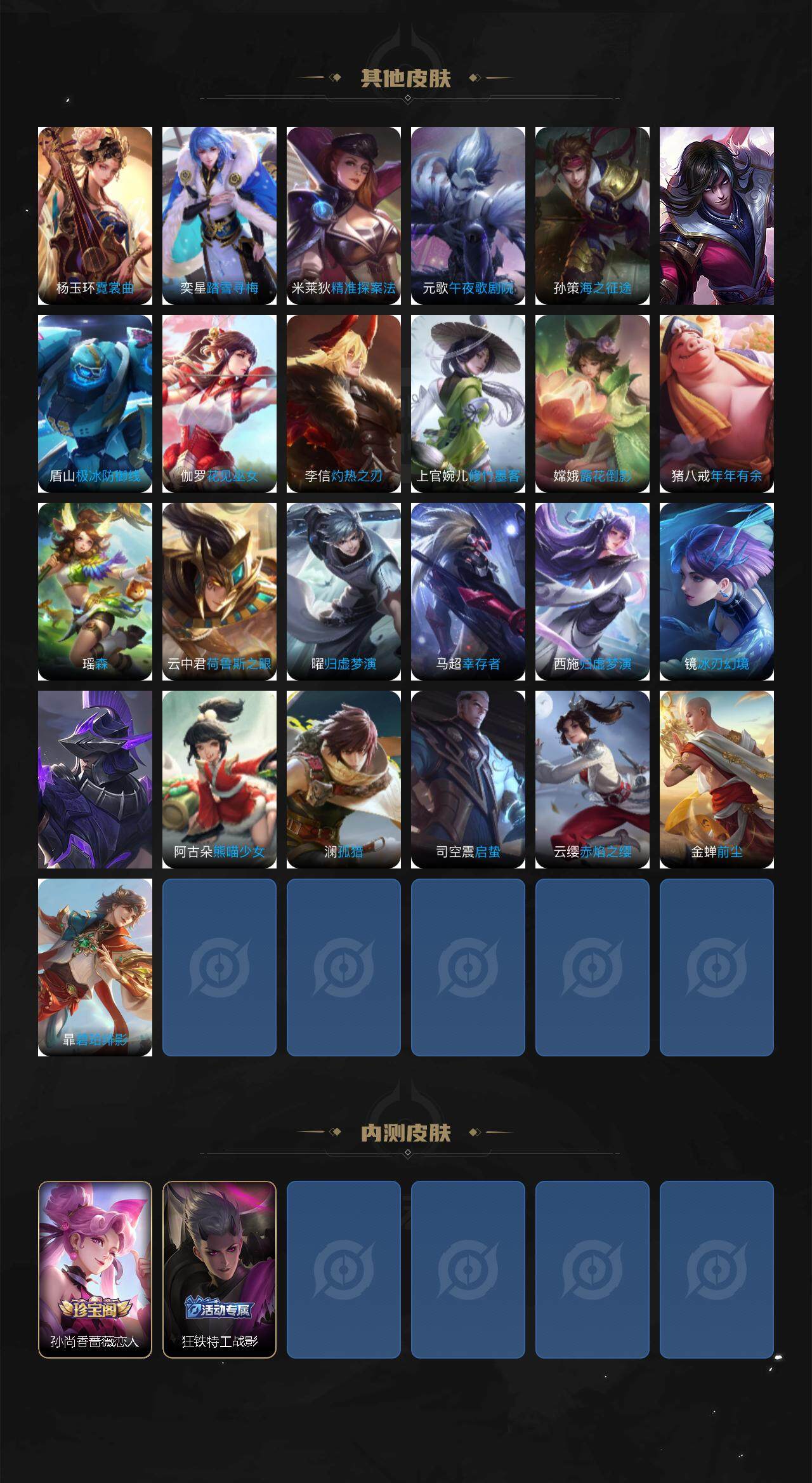 【限定皮肤】:蒙犽顽岩魄,蔡文姬夏日便利店,大乔绒语心约,虞姬夏日便利店,姜子牙天穹之誓,狄仁杰阴阳师,赵云皇家上将,孙尚香蔷薇恋人,庄周高山流水,元歌无心,狄仁杰魔术师,达摩沙漠行僧,项羽海滩派对,韩信傲雪梅枪,兰陵王金庭之子,孙悟空孙行者,李元芳云中旅人,女娲朔望之晖,女娲补天,鬼谷子五谷丰年,梦奇顽趣,沈梦溪大漠名商,裴擒虎擒涛扼浪,云中君纤云弄巧,嫦娥拒霜思,嫦娥暖冬兔眠,鲁班大师探海日志,桑启海盐诗旅,暃星界游侠,阿古朵江河有灵,张良古海寻踪,蒙犽百解令,高渐离燃音魔法,妲己灵卜魔法,鬼谷子天穹祈灯,姬小满妄想食味,沈梦溪龙舞盛年,鲁班七号蔬乡物语,李元芳蔬乡物语,刘邦剑破天穹,程咬金群星魔术团,镜青焰无极,项羽苍威无极,周瑜熔金海岸