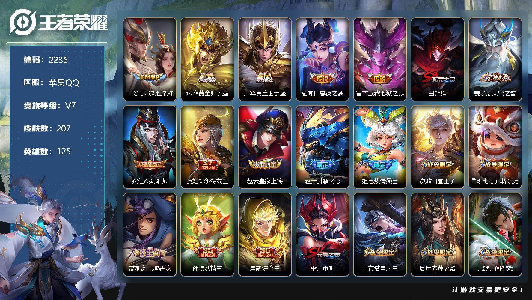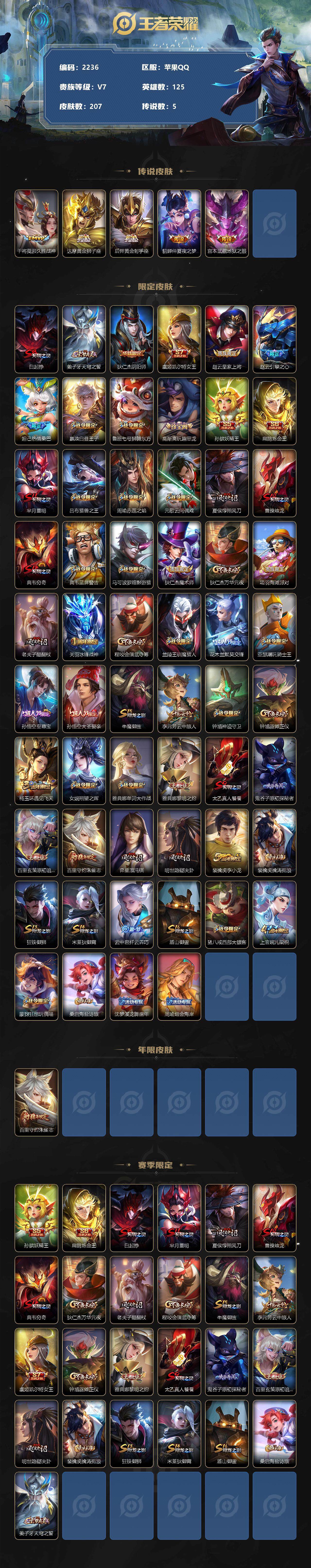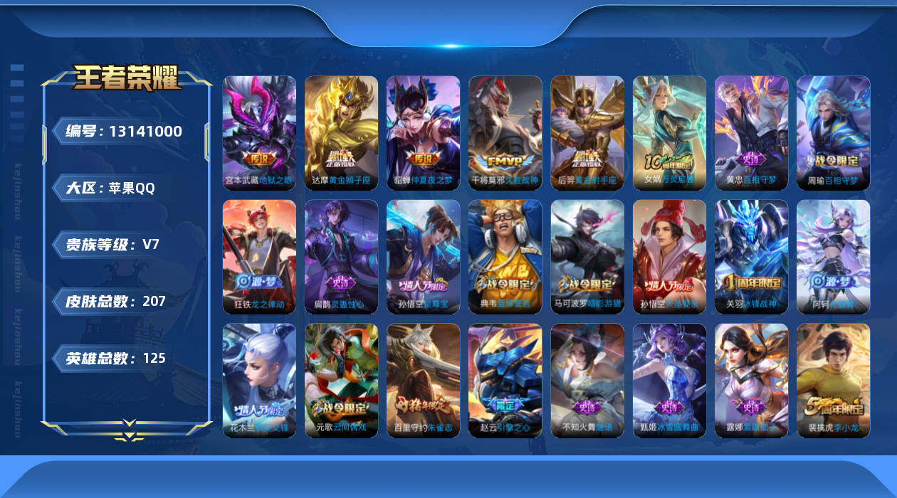 [13141000]苹果Q-V7-最强王者段位-125英雄-207皮肤-0典藏-0珍品无双-0无双-0珍品传说-5传说-53史诗
